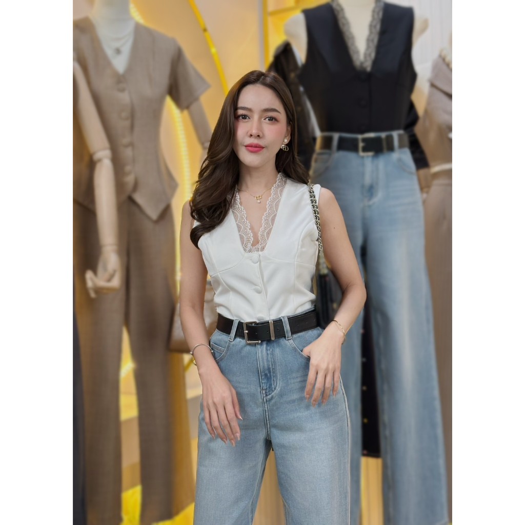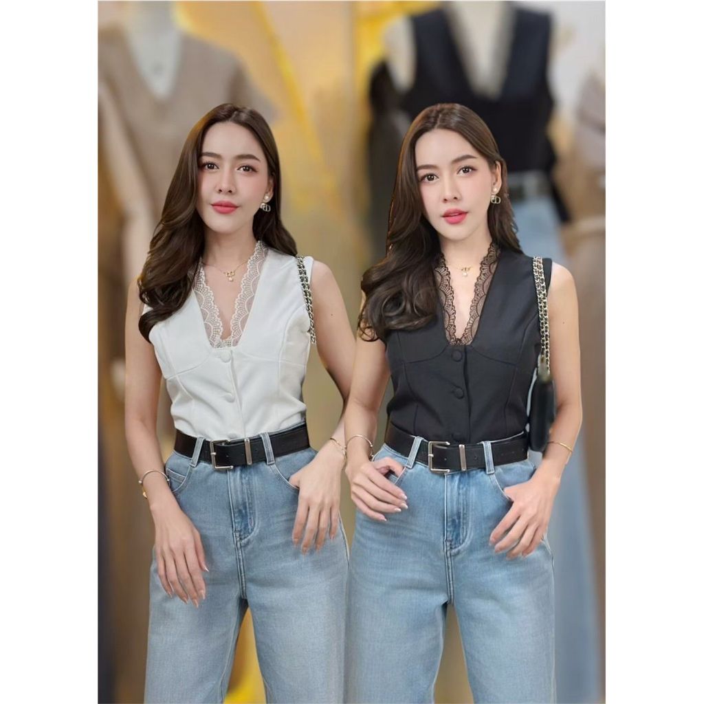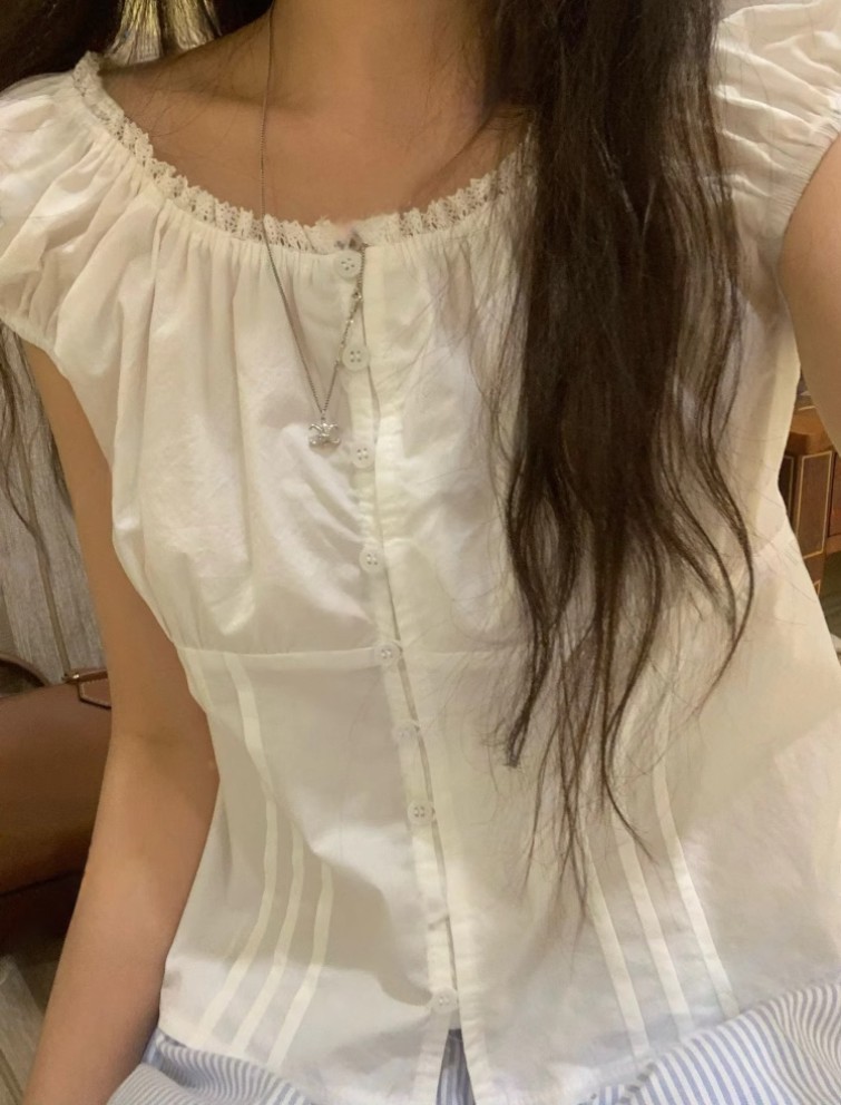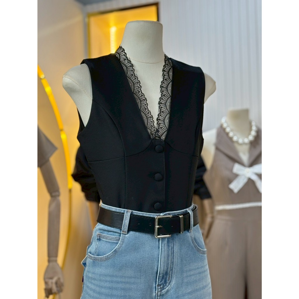 87655 Lace Trim Single-Breasted Slim-Fit เสื้อแขนสั้น