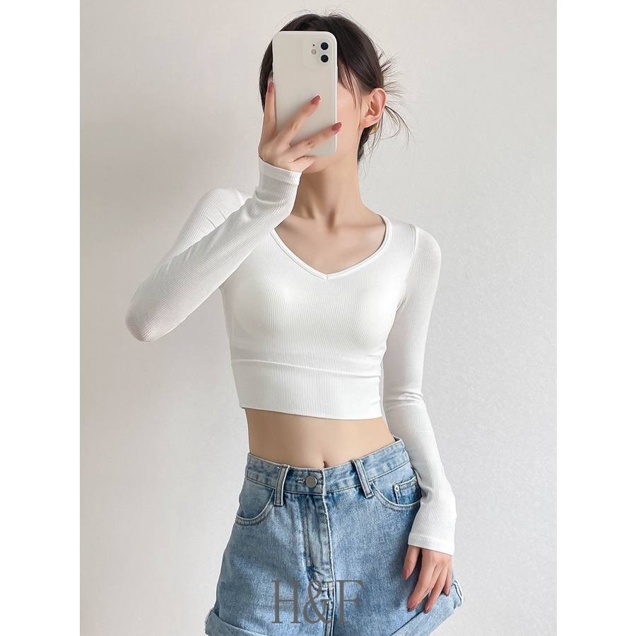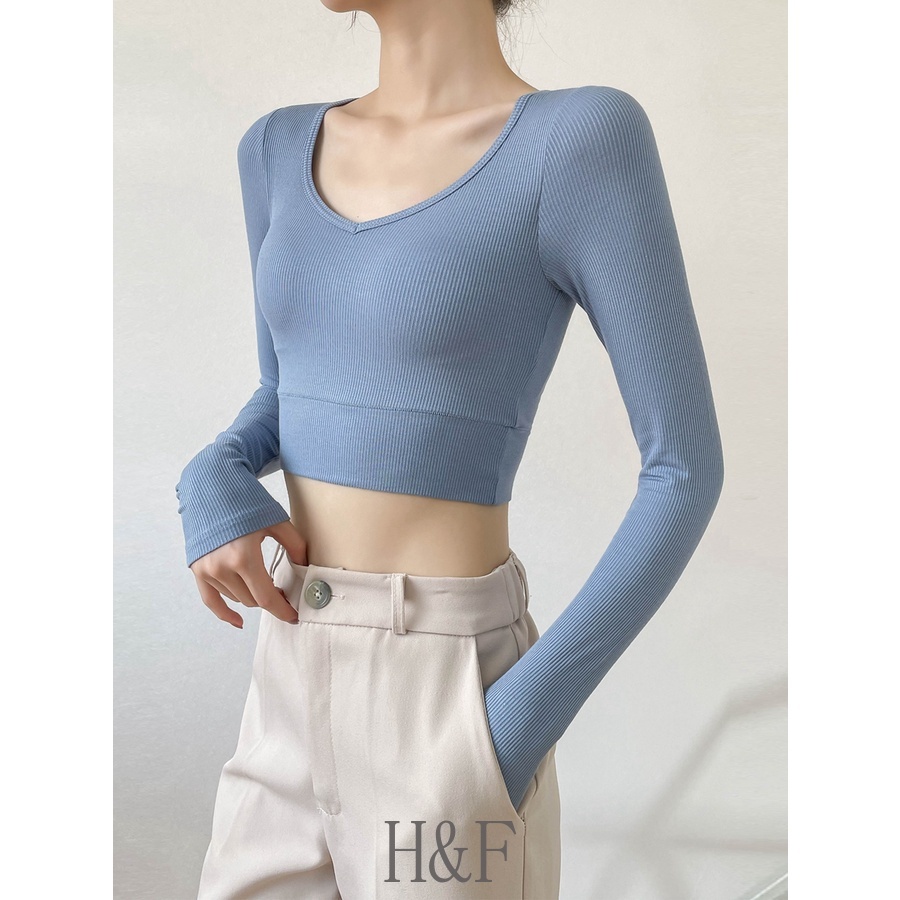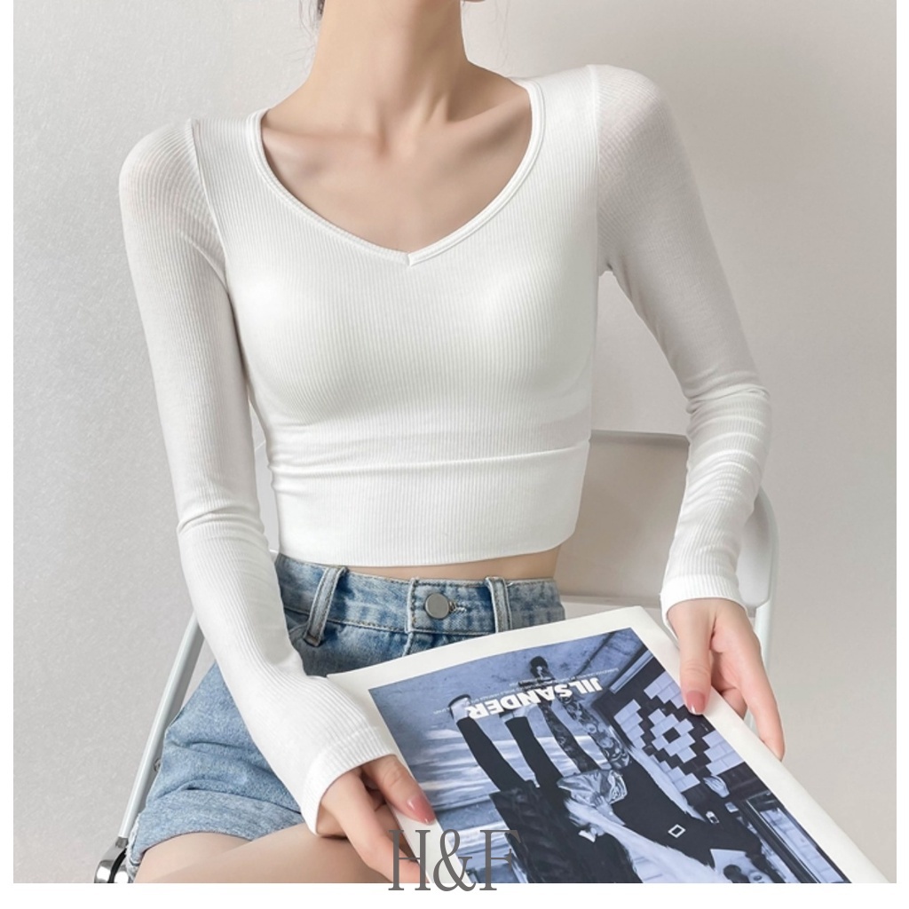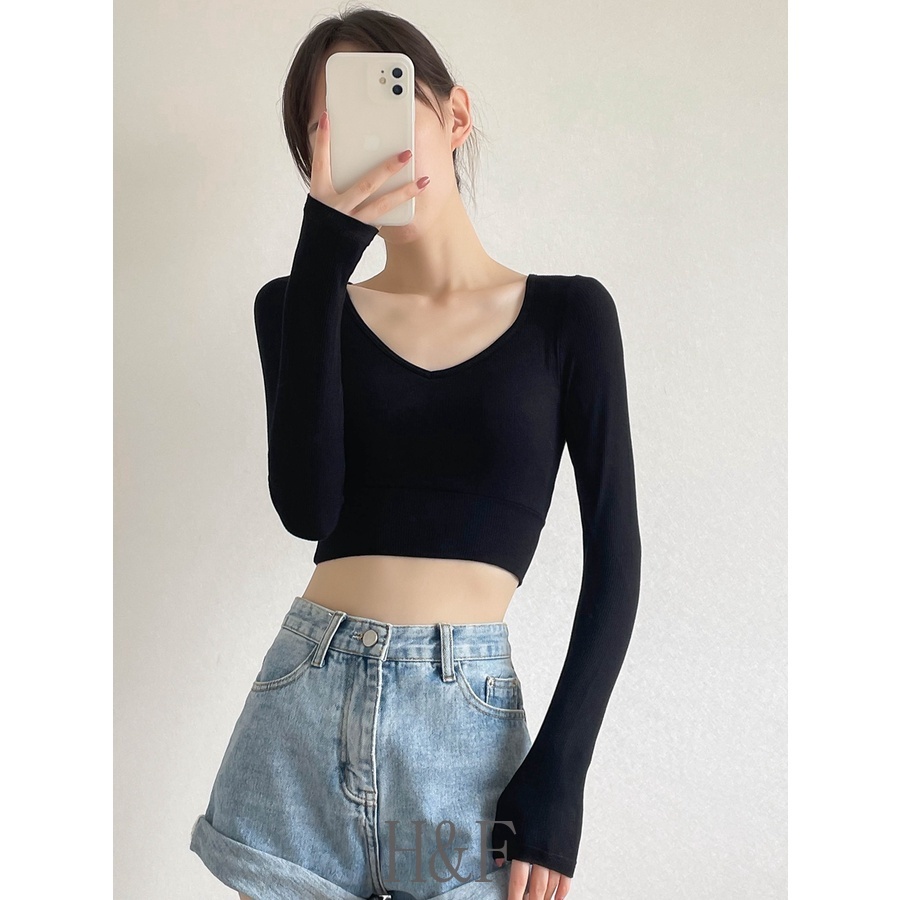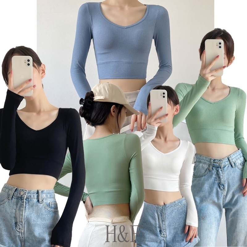 2 in 1 เสื้อครอปท็อป คอวี แขนยาว สีพื้น สไตล์เกาหลี เซ็กซี่ สําหรับผู้หญิง