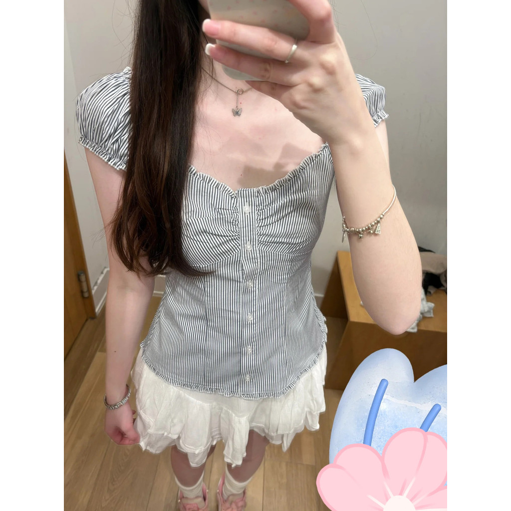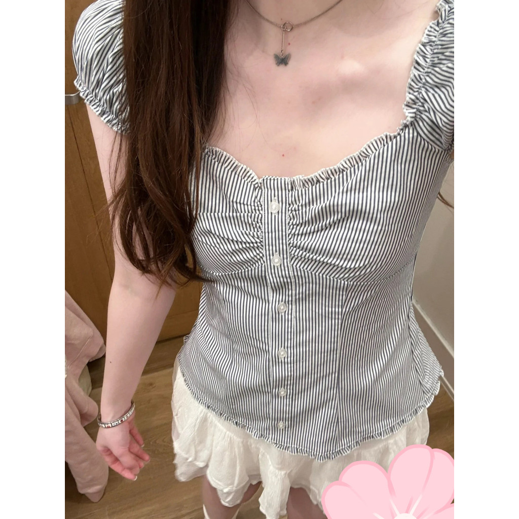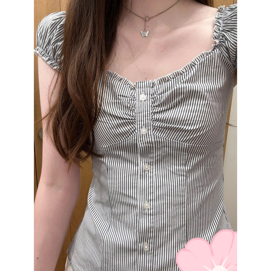 2025 เสื้อเชิ้ตผู้หญิงแขนสั้นสีน้ำเงินลายทางอเนกประสงค์ฤดูร้อน เสื้อเชิ้ต BM แขนพอง สไตล์ฝรั่งเศสใหม่