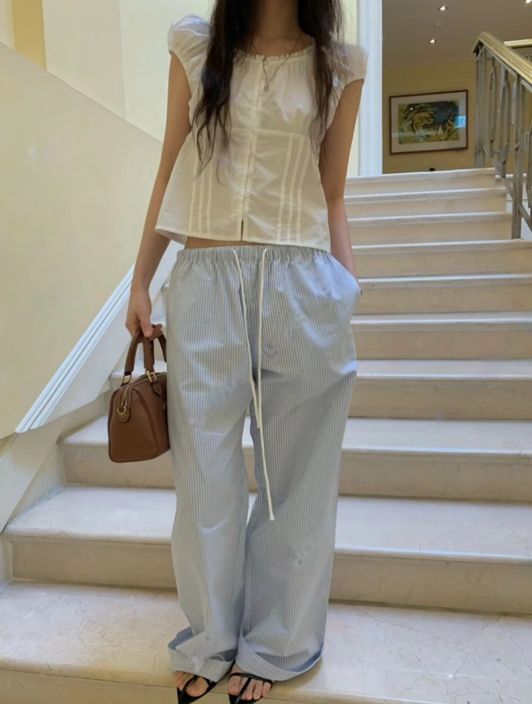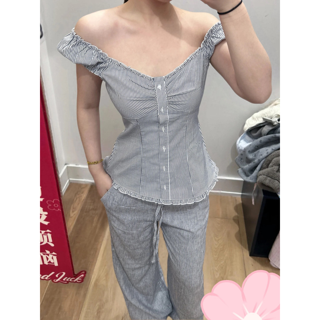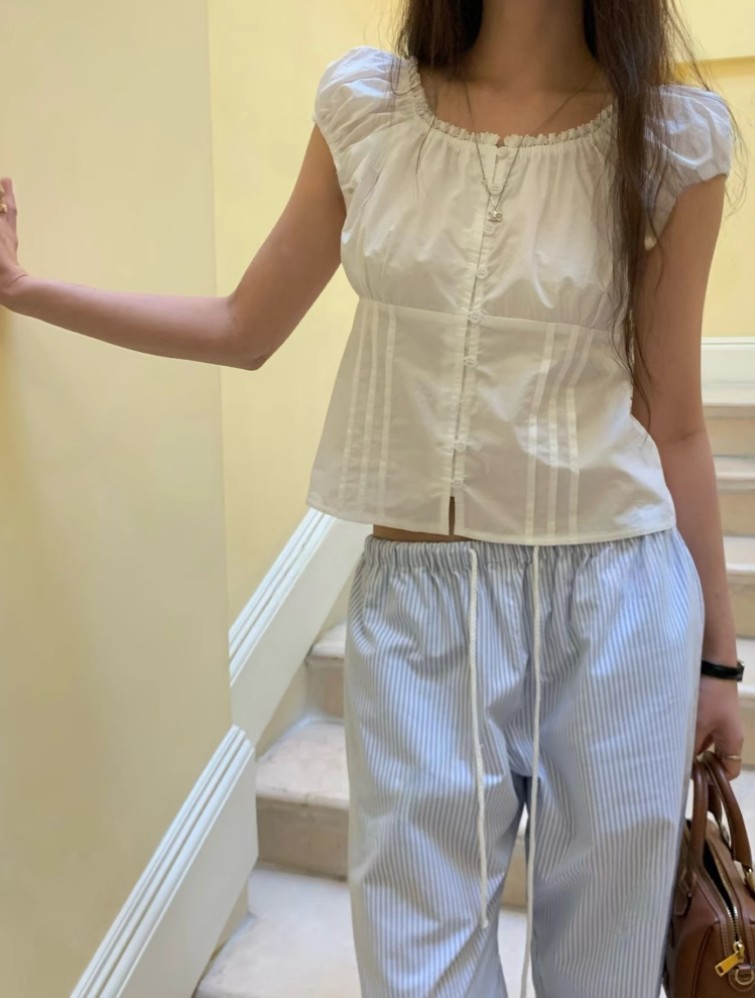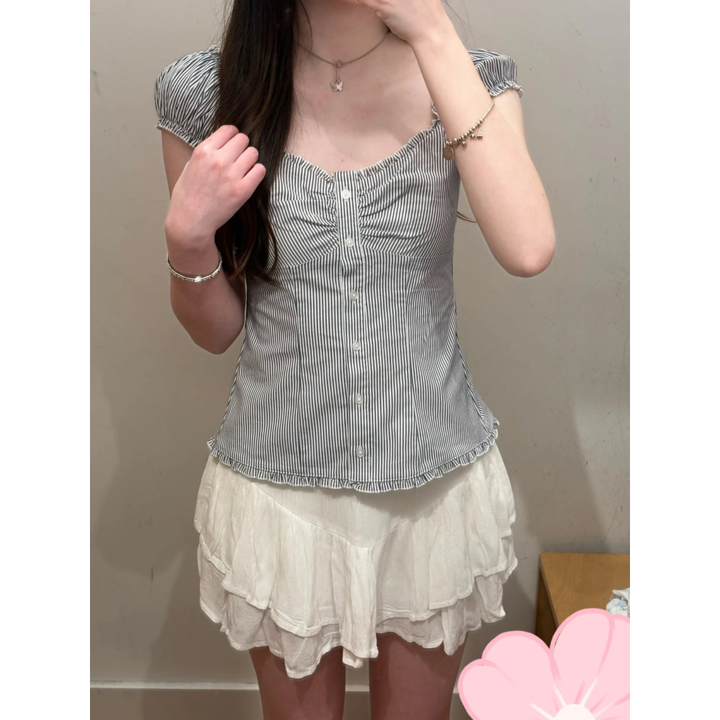 2025 เสื้อเชิ้ตผู้หญิงแขนสั้นสีน้ำเงินลายทางอเนกประสงค์ฤดูร้อน เสื้อเชิ้ต BM แขนพอง สไตล์ฝรั่งเศสใหม่