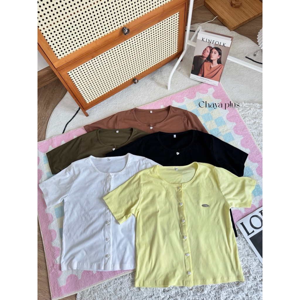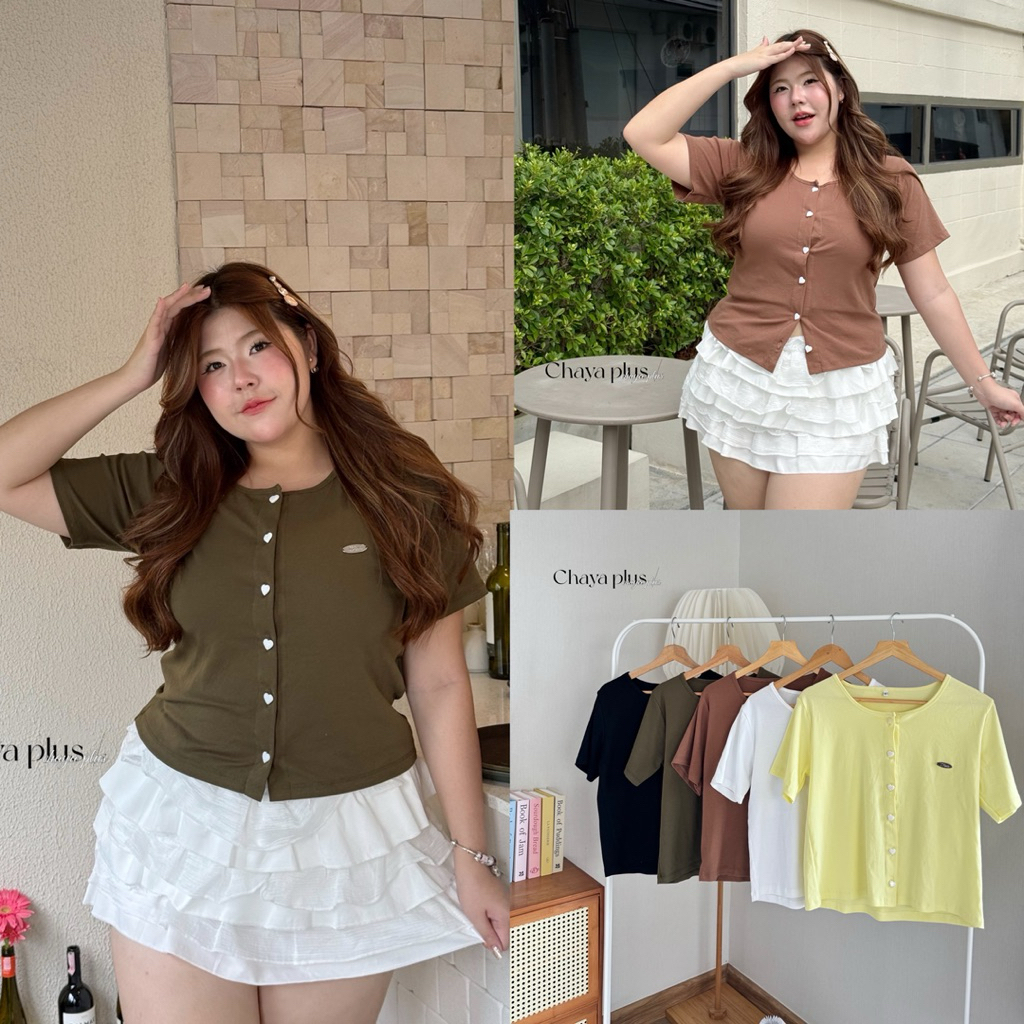 (LD) เสื้อครอปคอกลม กระดุมหัวใจหน้า ดีเทลอะไหล่อก ผ้ายืดเยอะ ใส่สบาย เก๋ๆ เสื้อผ้าสาวอวบอ้วน พลัสไซส์ ไซส์ใหญ่