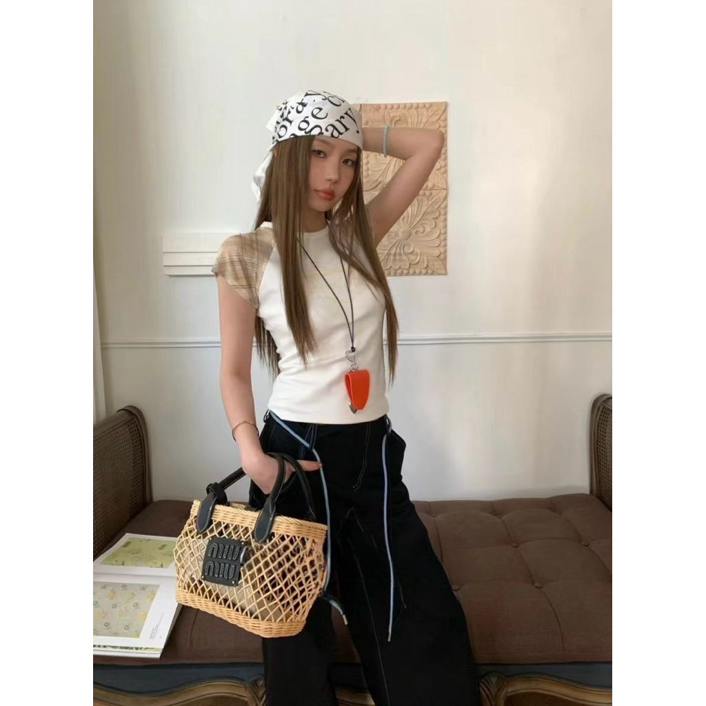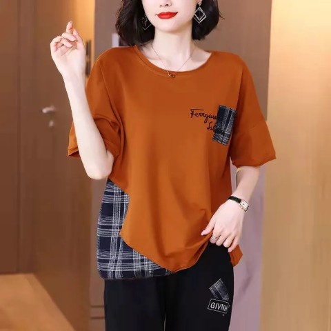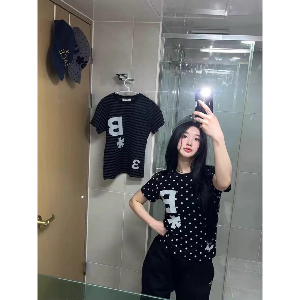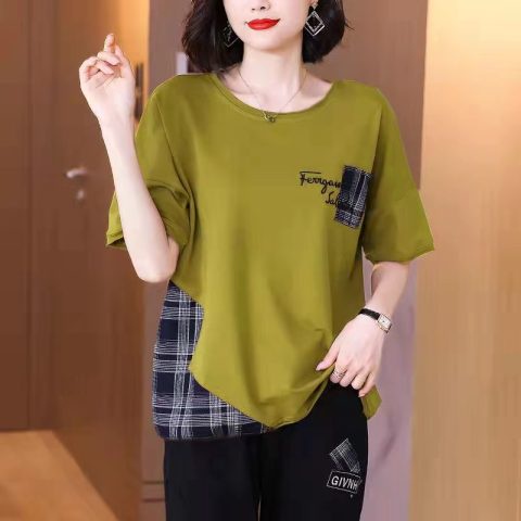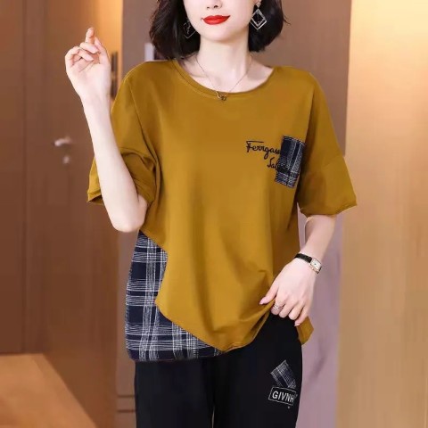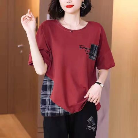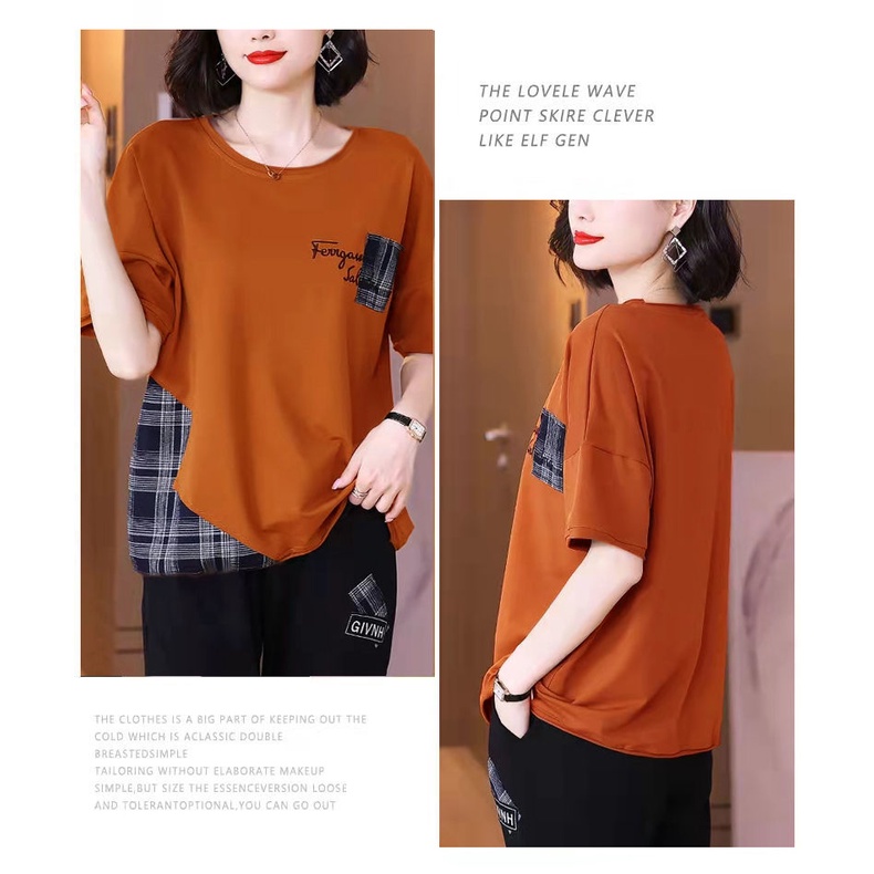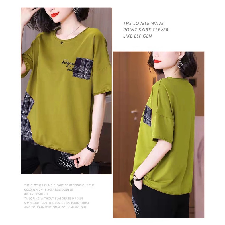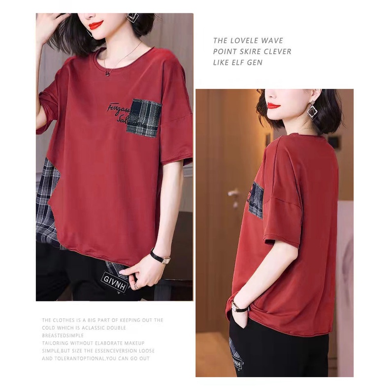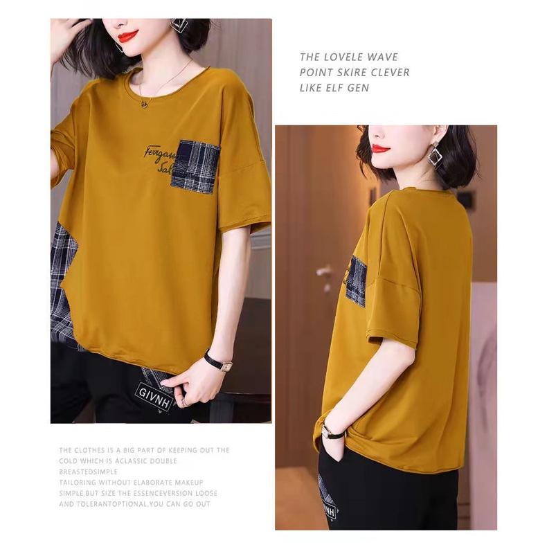 45-100kgสีตัดกัน เสื้อเกาะอกสีตัดกัน ปิดปีกซ้าย-ขวาได้มิด สะดวกสบาย เสื้อยืด ผู้หญิง เสื้อผ้าสาว อวบไซซ์ใหญ่