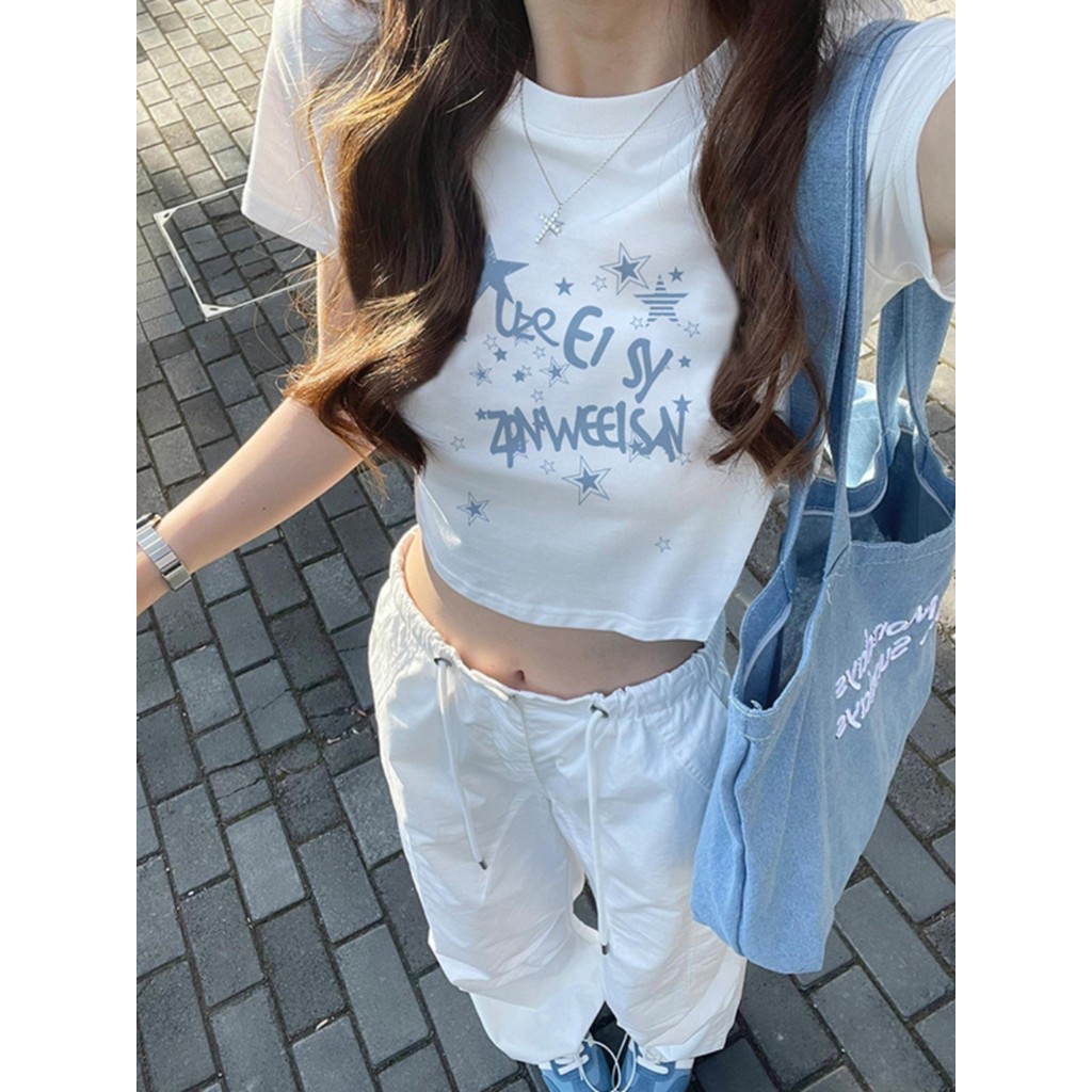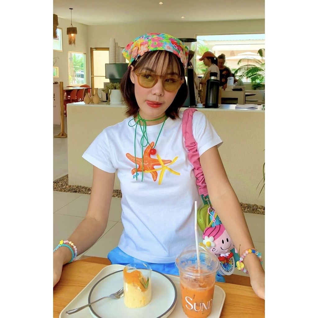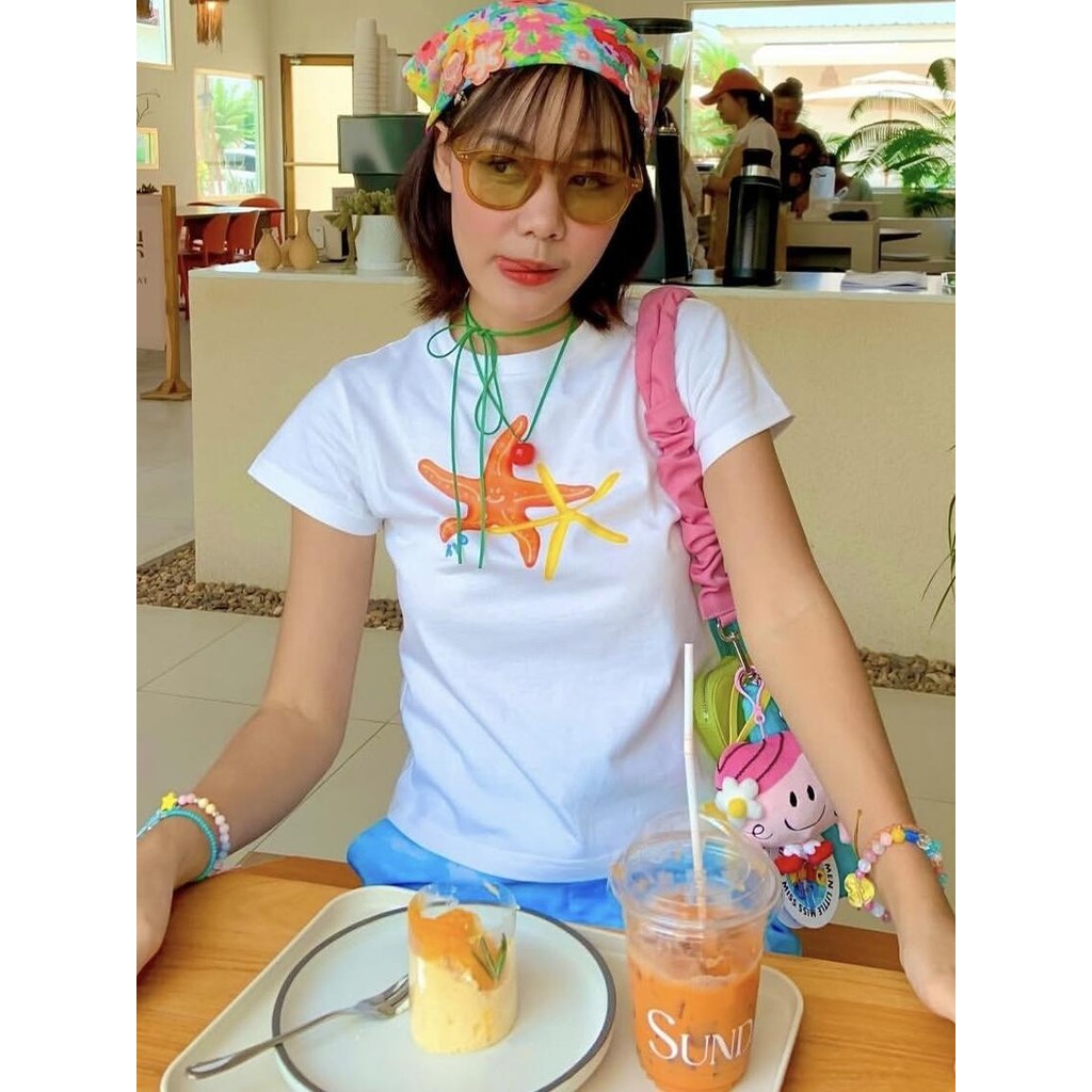 (จัดส่งตลอด 24 ชั่วโมง)เกาหลี ins เฉพาะปลาดาวพิมพ์ด้านหน้าไหล่สั้นบางบางผ้าฝ้ายแขนสั้นยืดหยุ่นสูงเสื้อยืดผู้หญิง