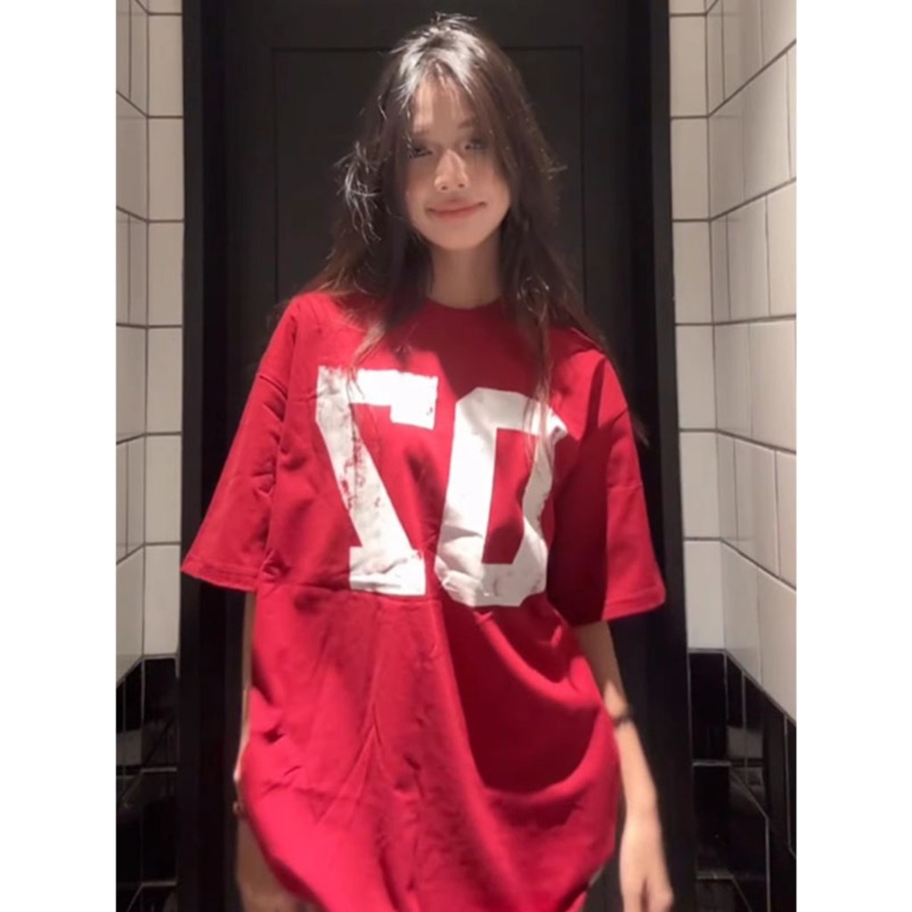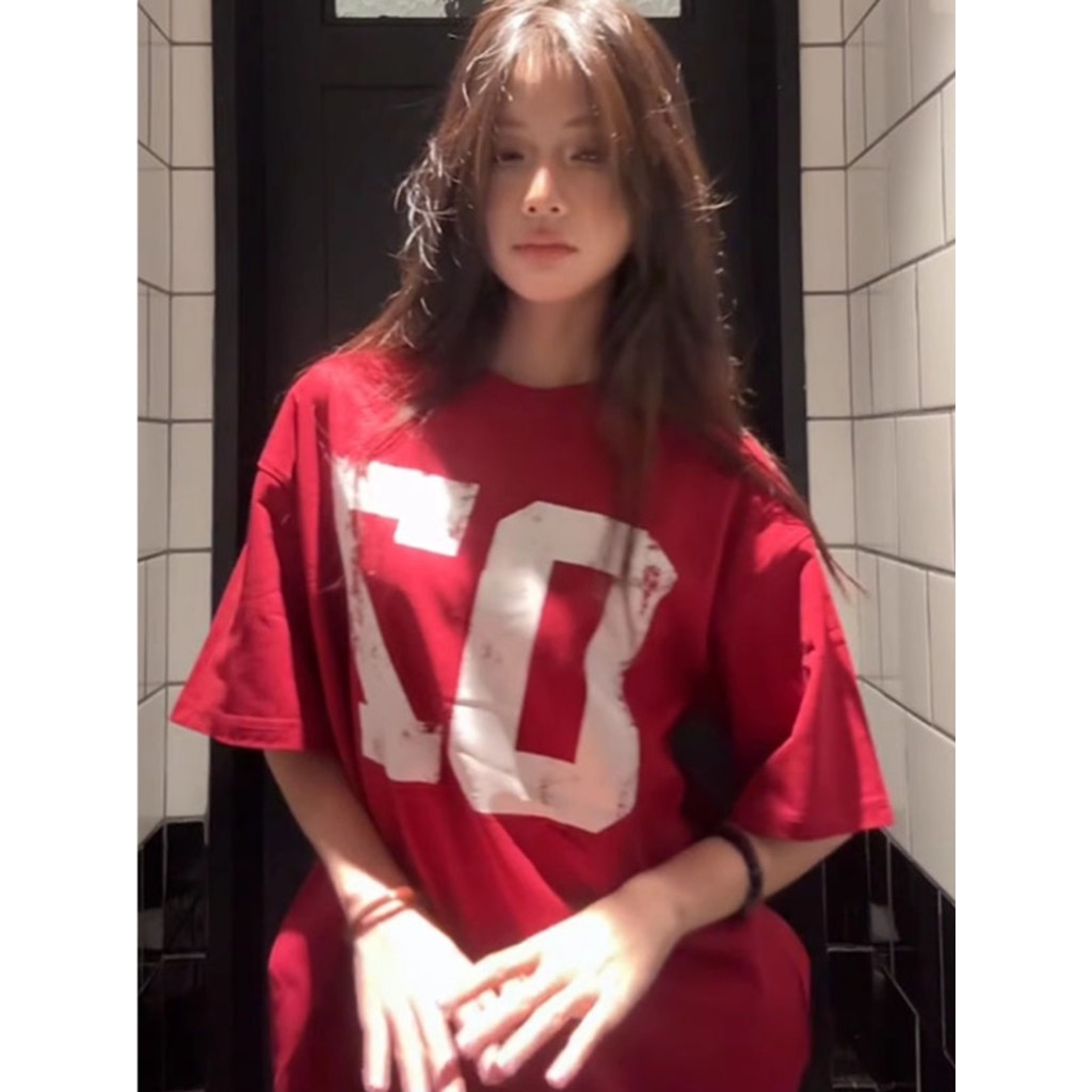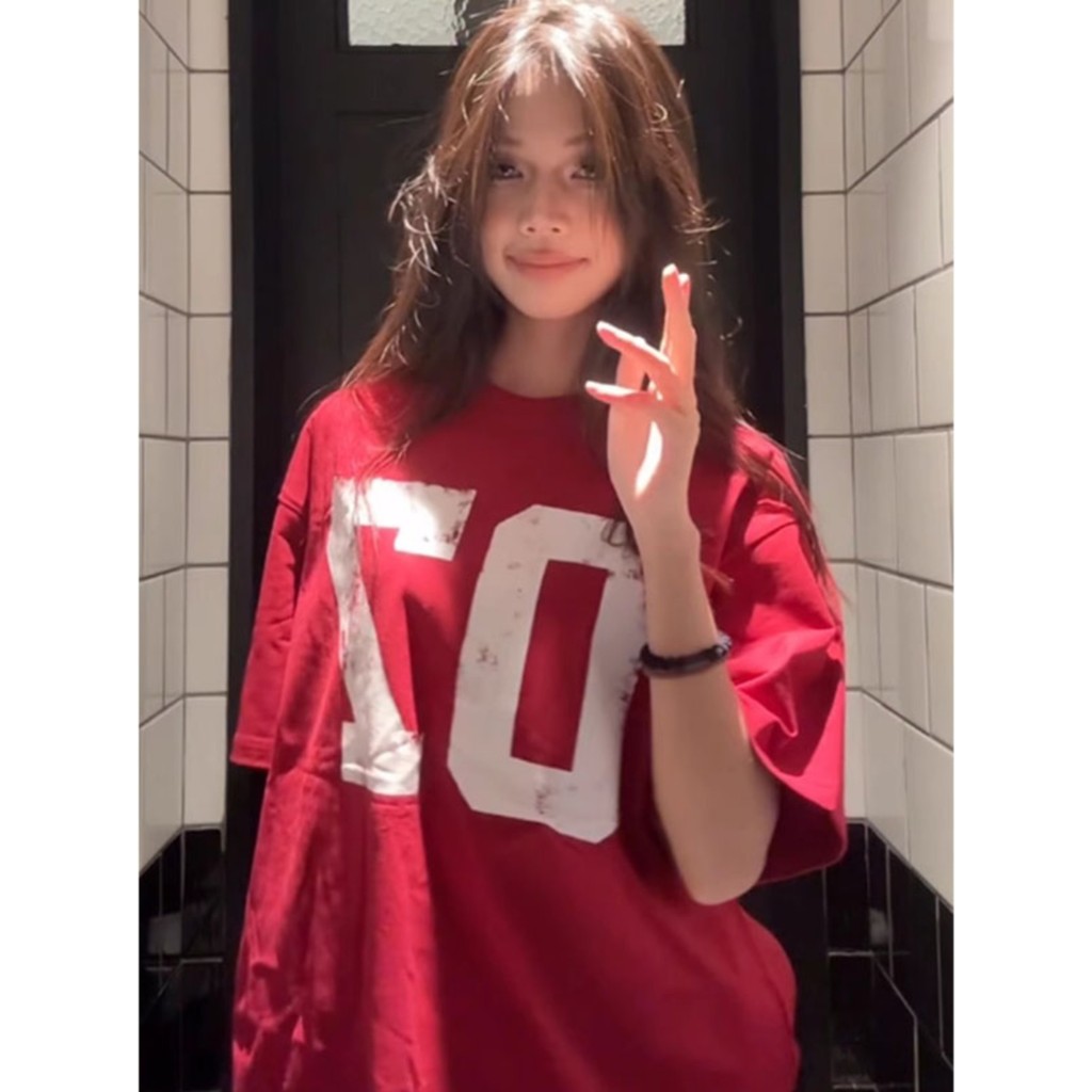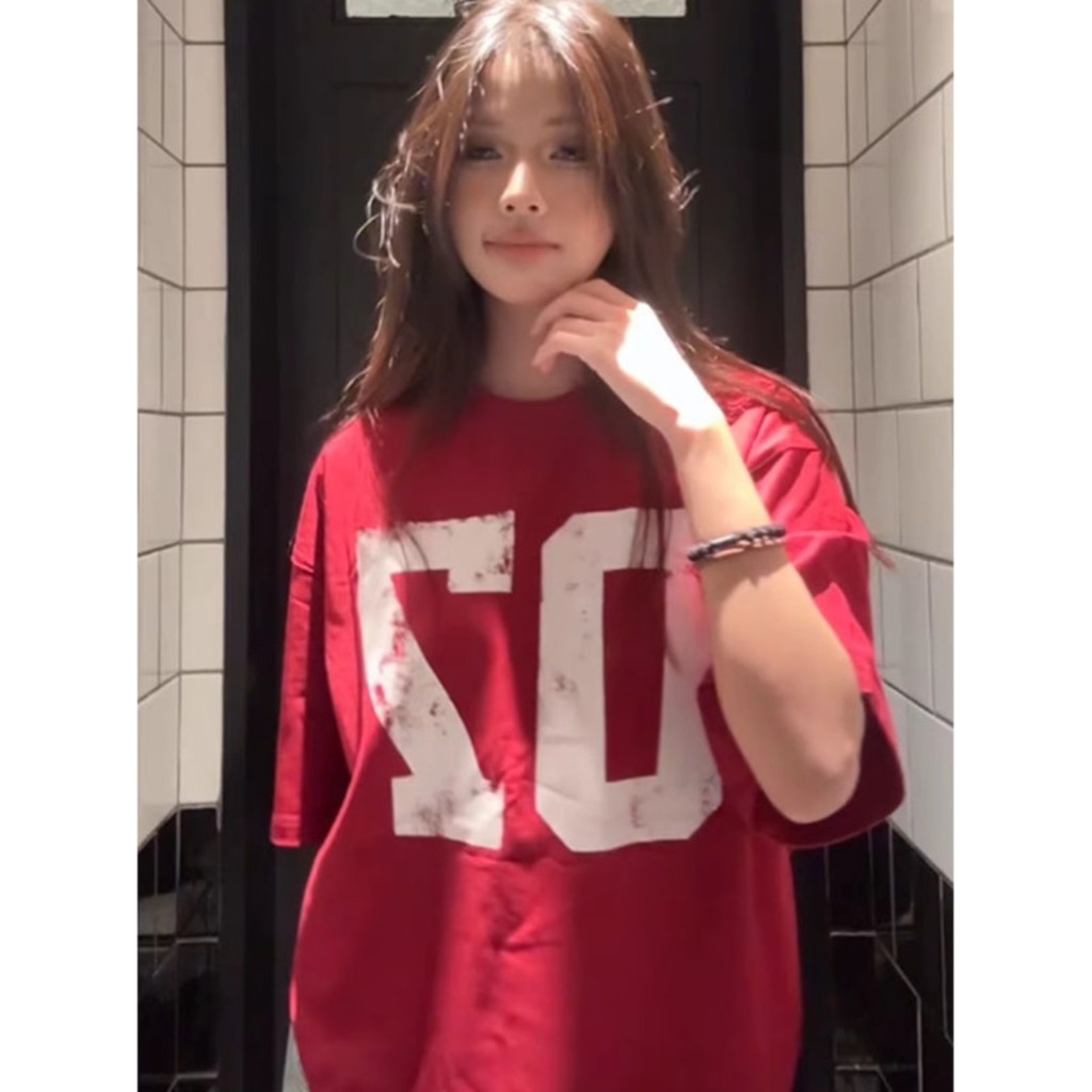 (จัดส่งตลอด 24 ชั่วโมง)Angle Official เสื้อยืดแขนสั้นสีแดงเบอร์วินเทจสไตล์อเมริกัน