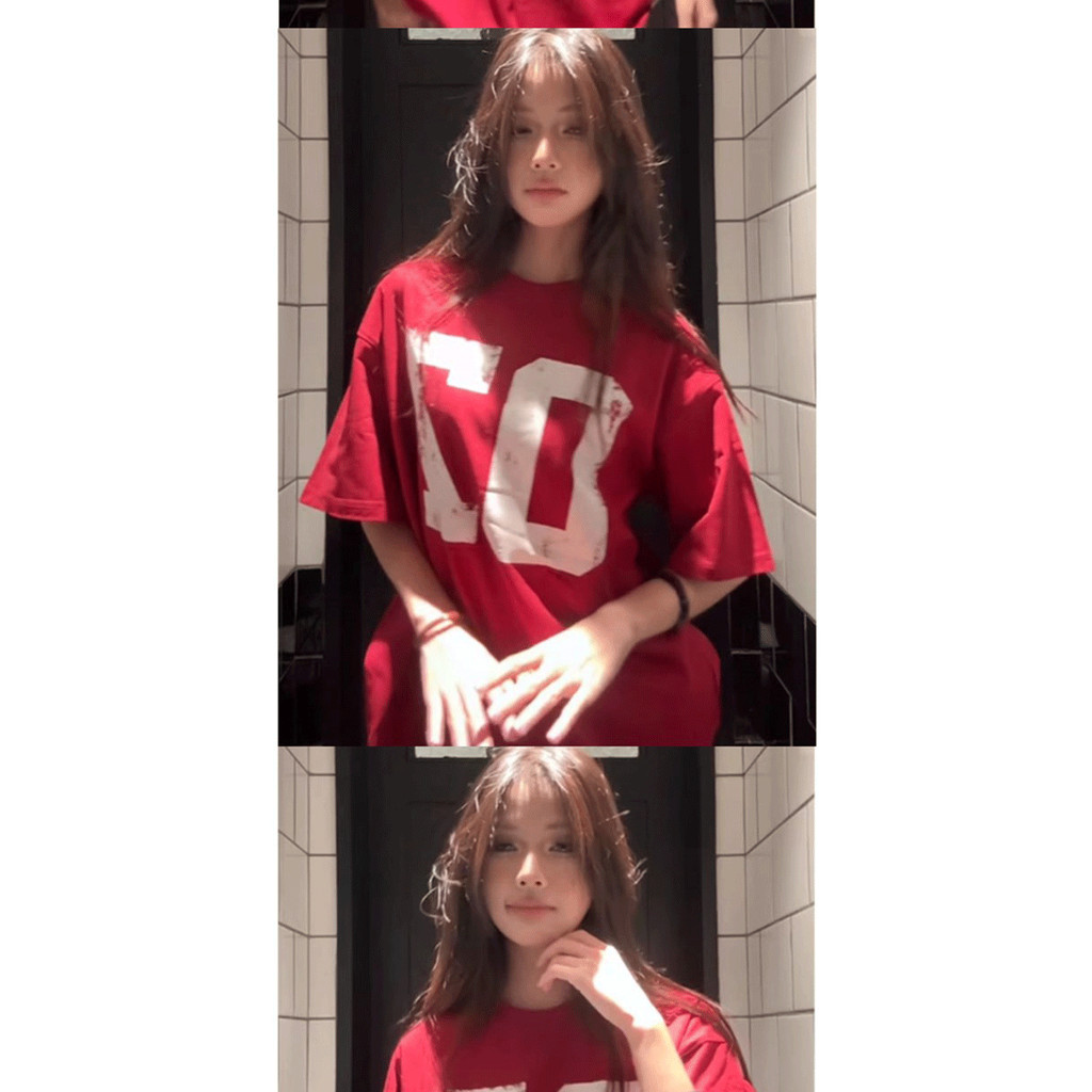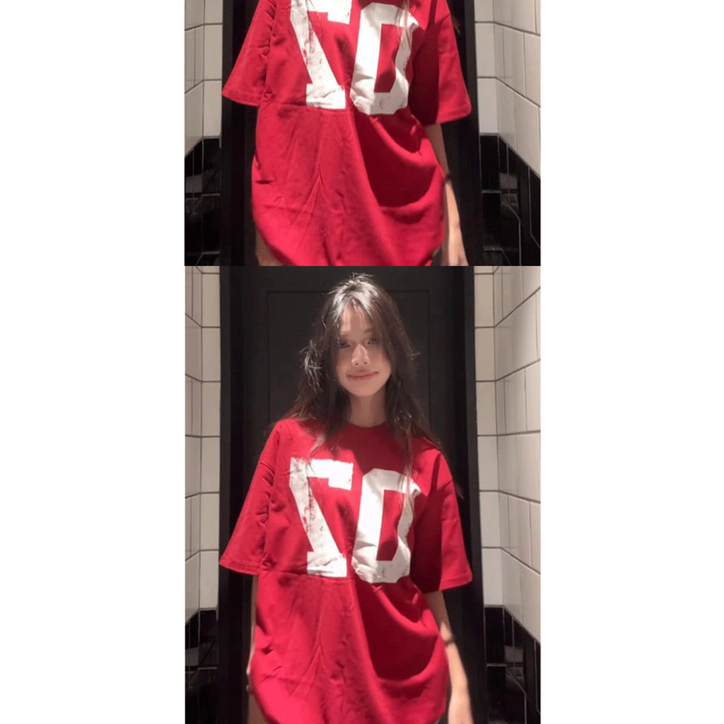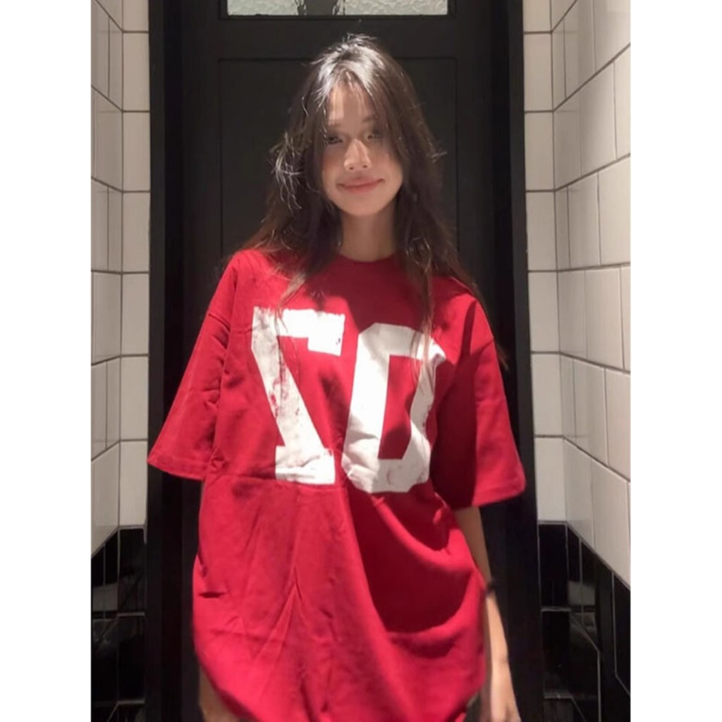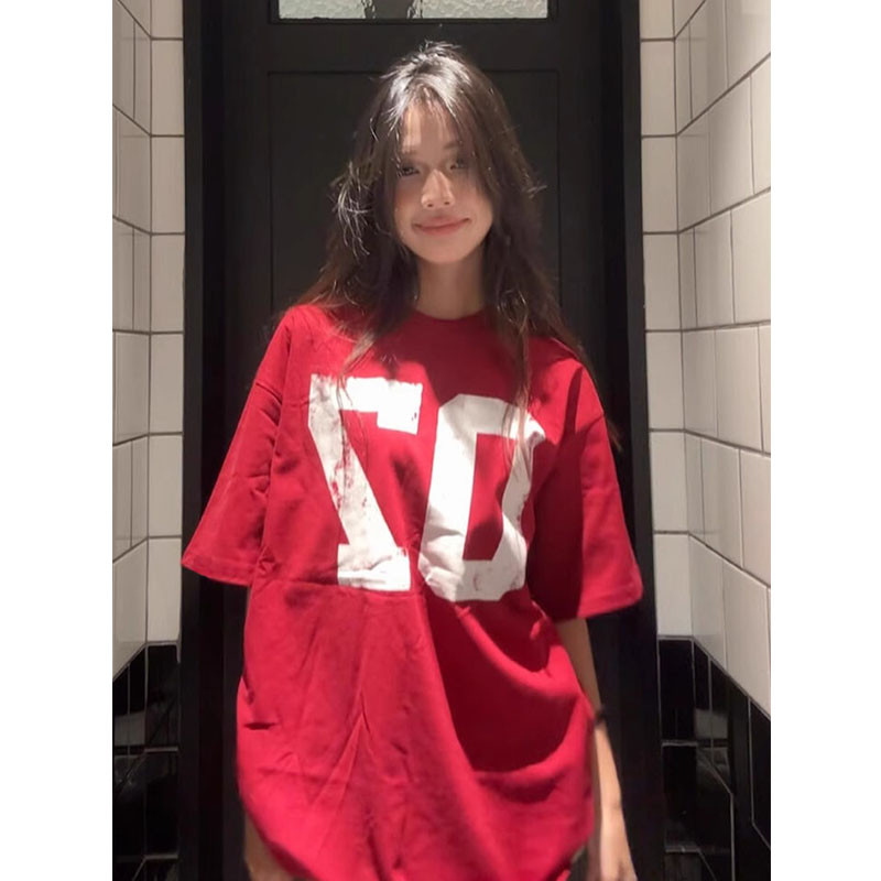 (จัดส่งตลอด 24 ชั่วโมง)Angle Official เสื้อยืดแขนสั้นสีแดงเบอร์วินเทจสไตล์อเมริกัน