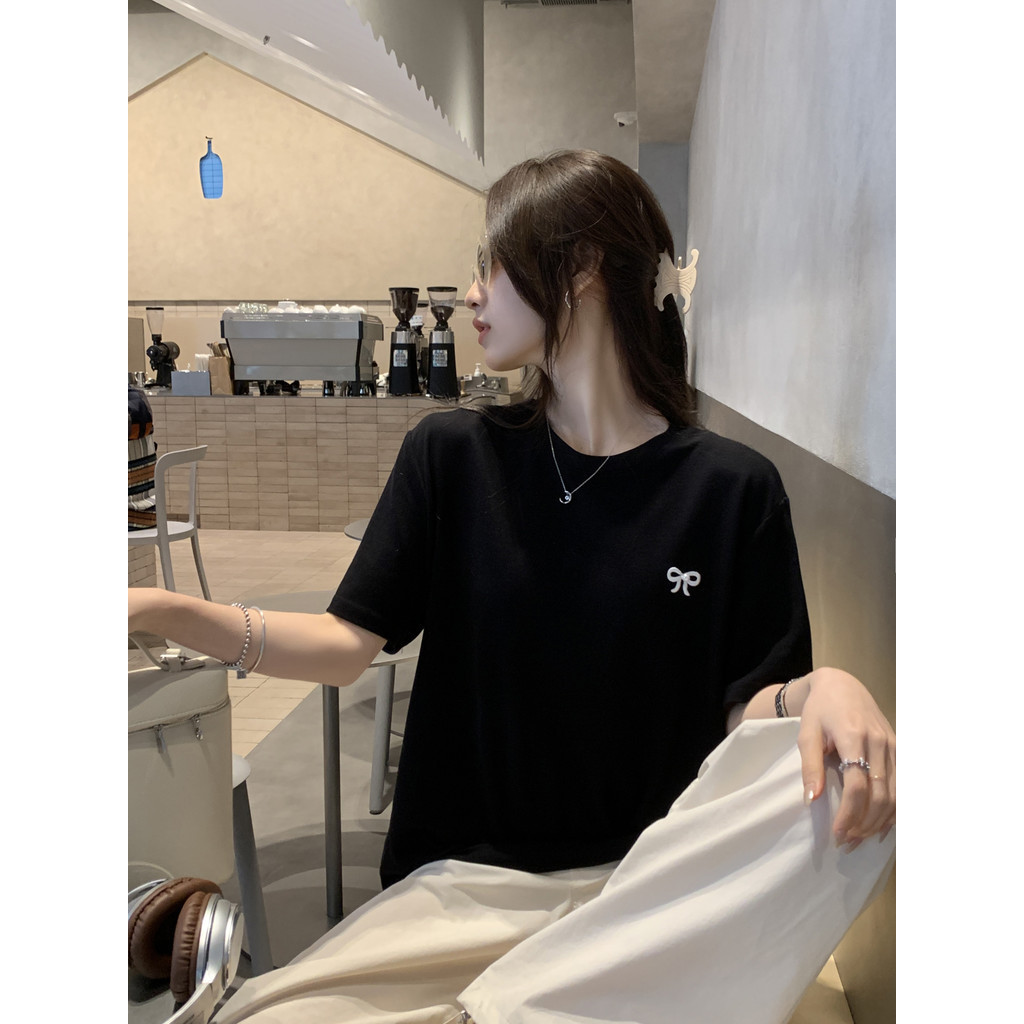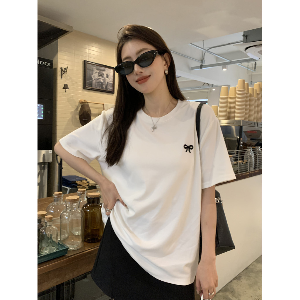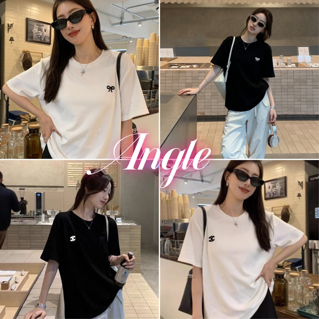 (จัดส่งตลอด 24 ชั่วโมง)Angle Official เสื้อยืดแขนสั้น ลายโบว์น่ารักๆมินิมอล oversize ผ้าcottonแท้นิ่มไม่กด ขาว ดำ แฟชั่