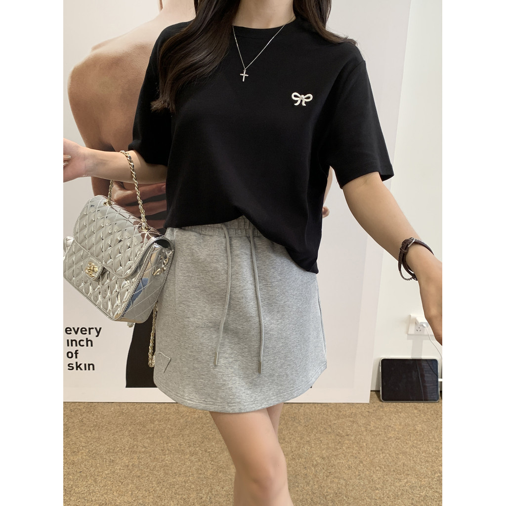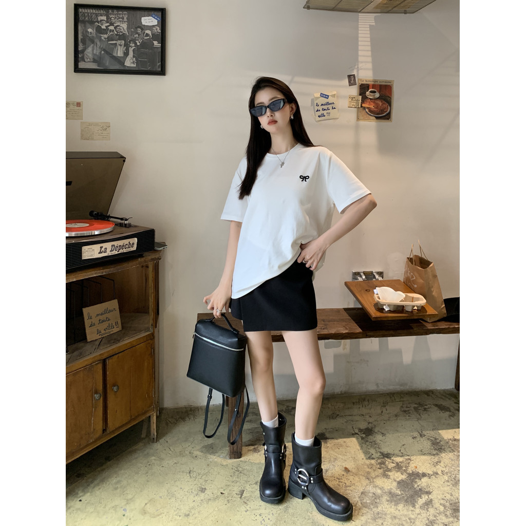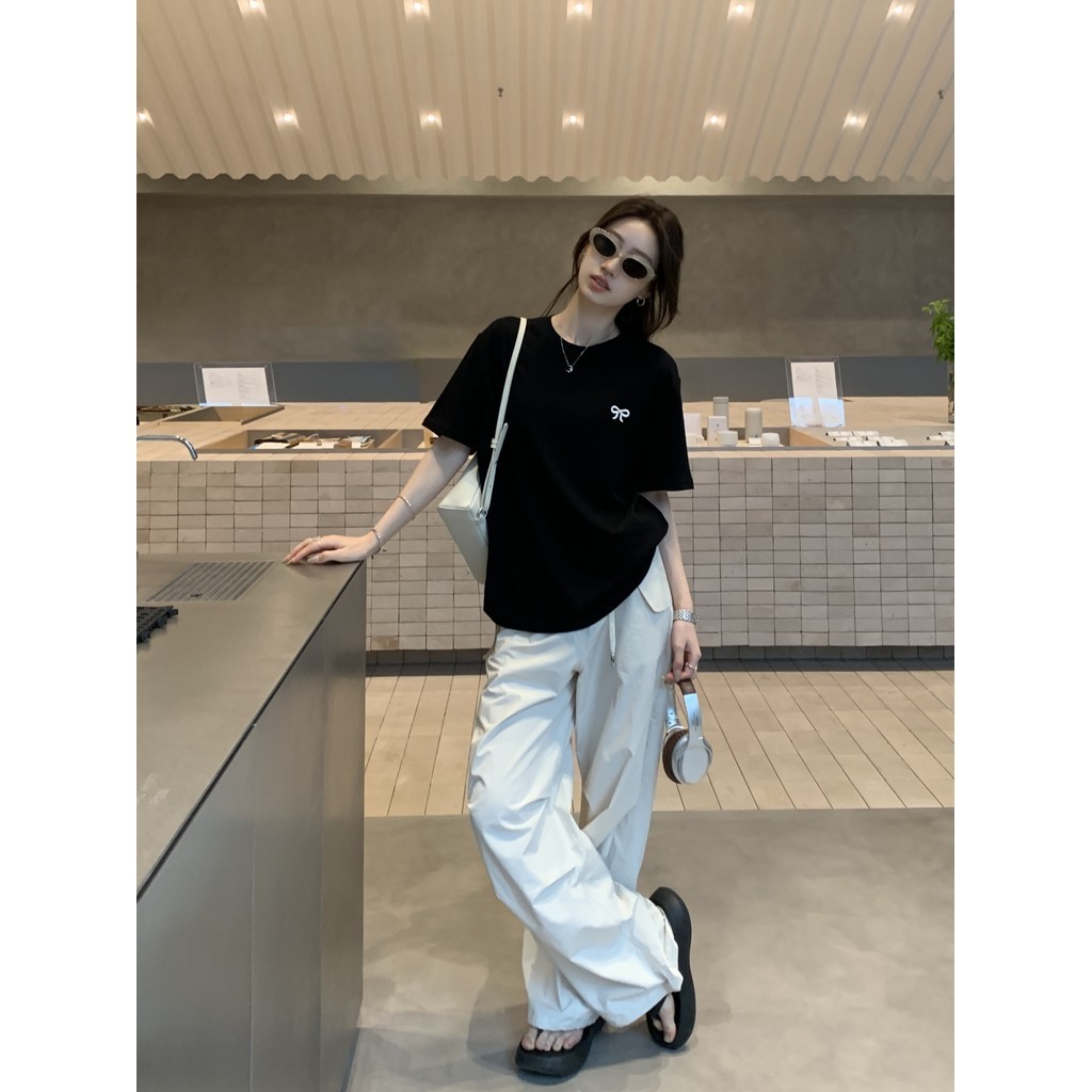 (จัดส่งตลอด 24 ชั่วโมง)Angle Official เสื้อยืดแขนสั้น ลายโบว์น่ารักๆมินิมอล oversize ผ้าcottonแท้นิ่มไม่กด ขาว ดำ แฟชั่