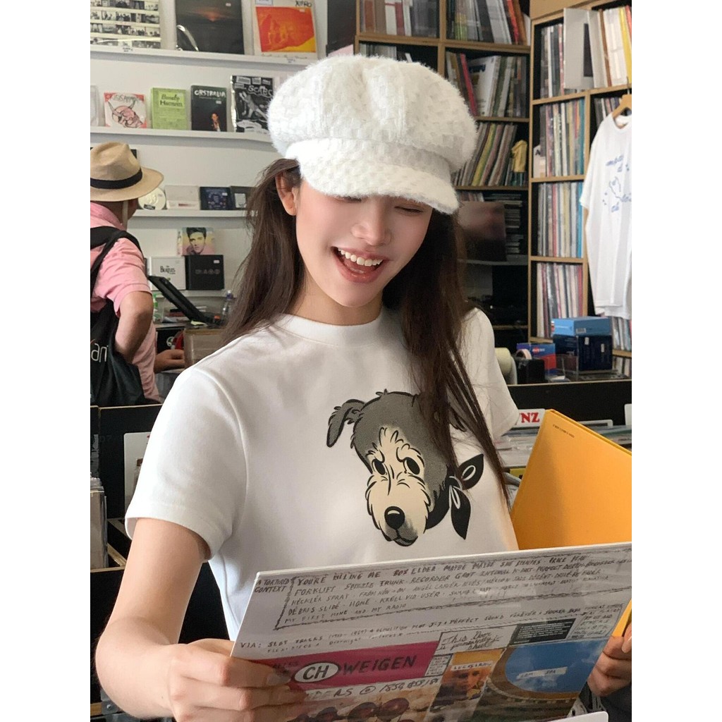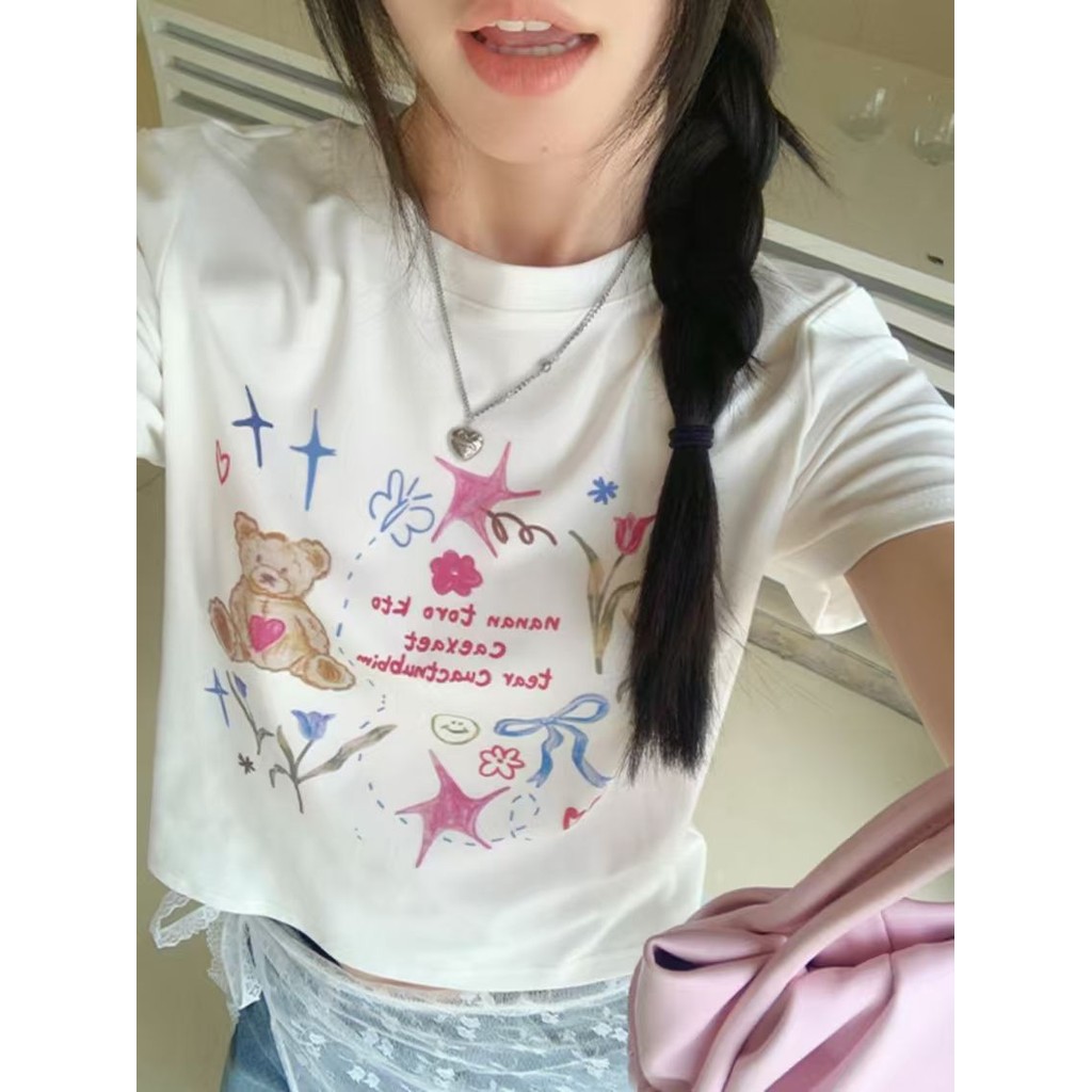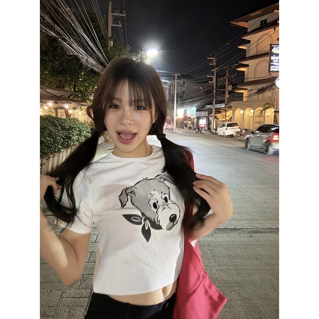 (จัดส่งตลอด 24 ชั่วโมง)เกาหลีผูกโบว์ลูกสุนัขการ์ตูนพิมพ์ไหล่ด้านหน้าสั้นบางและบางเสื้อยืดแขนสั้นยืดหยุ่นสูง