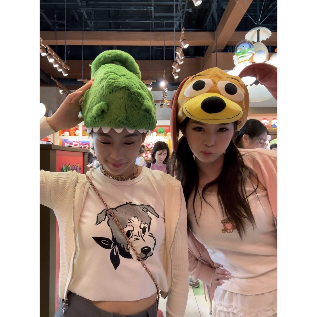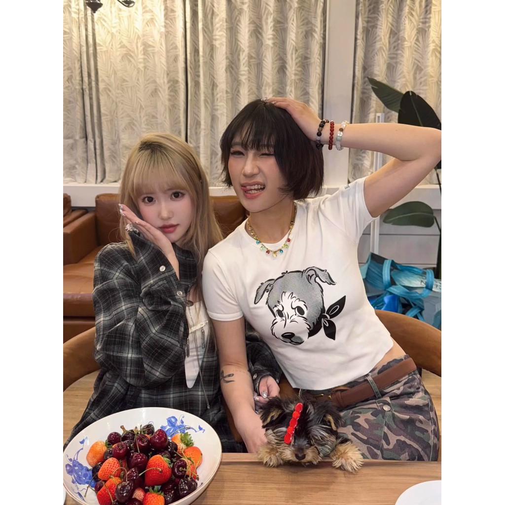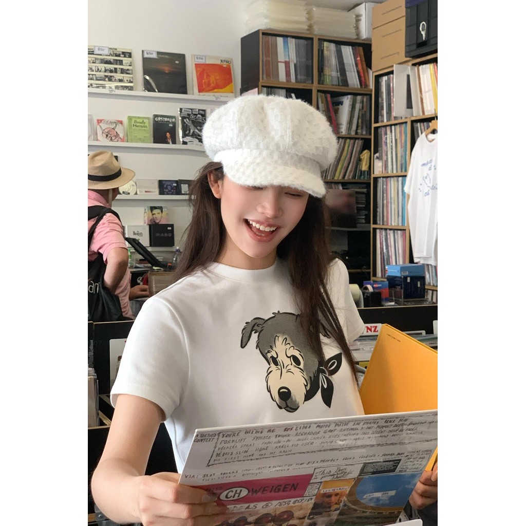 (จัดส่งตลอด 24 ชั่วโมง)เกาหลีผูกโบว์ลูกสุนัขการ์ตูนพิมพ์ไหล่ด้านหน้าสั้นบางและบางเสื้อยืดแขนสั้นยืดหยุ่นสูง