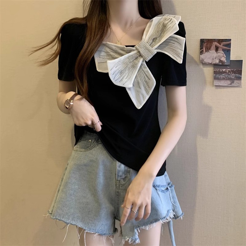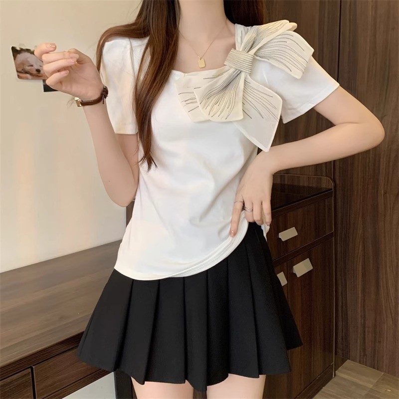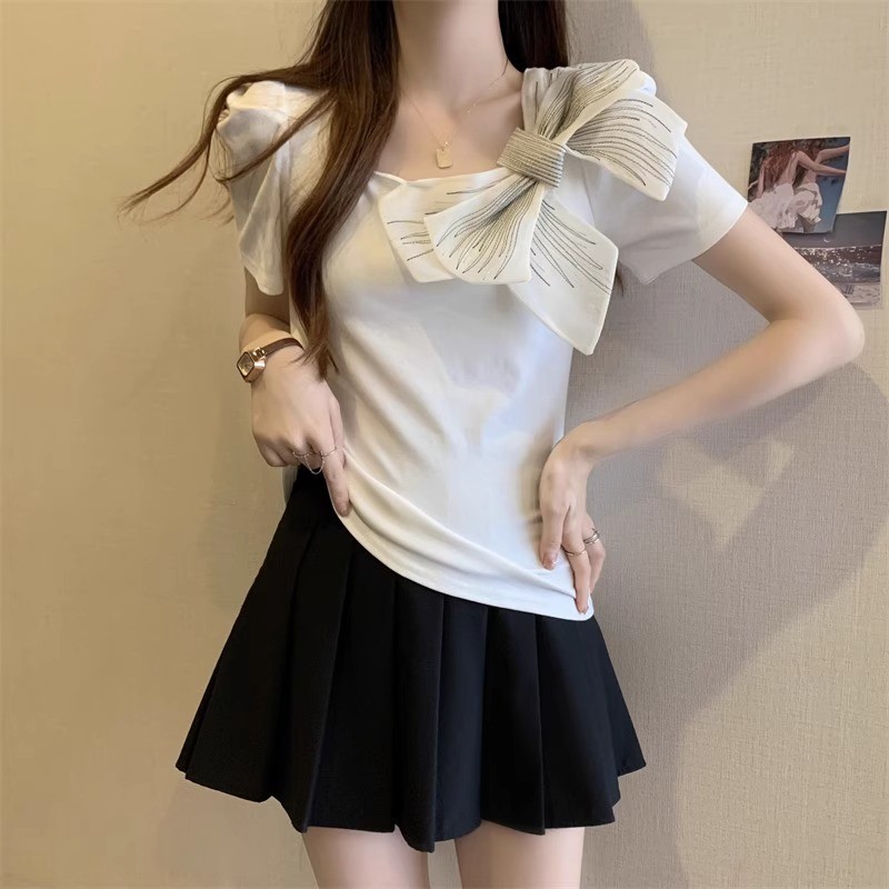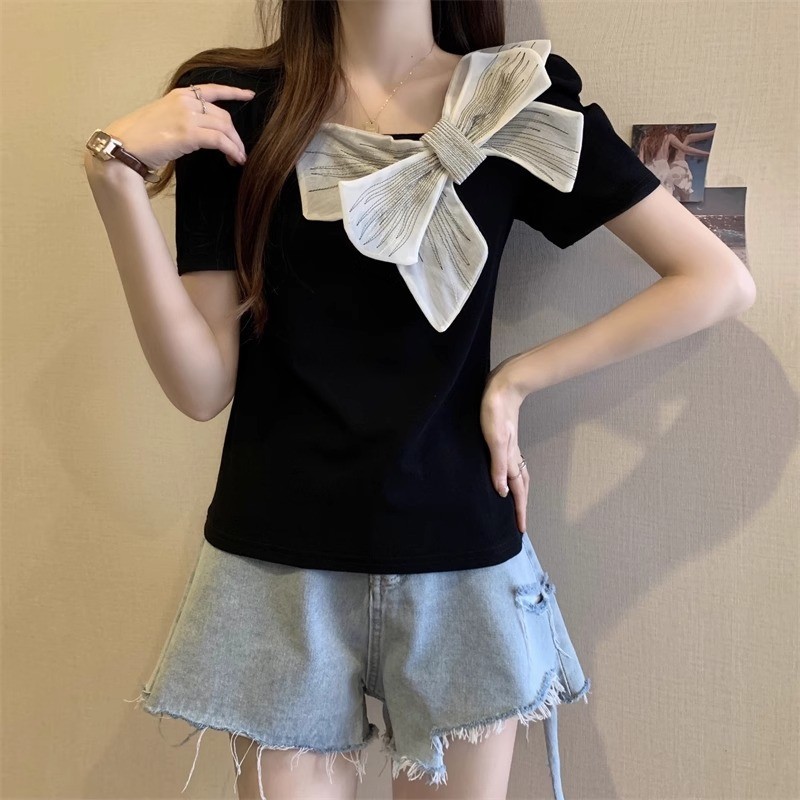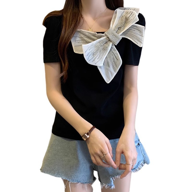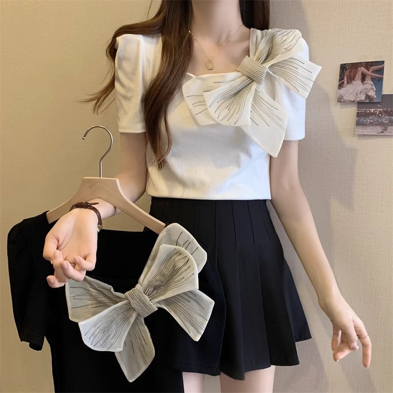 [ ฝีมือดั ้ งเดิม ] เสื ้ อยืดแขนสั ้ นโบว ์ คอเหลี ่ ยมฝรั ่ งเศสผู ้ หญิงสไตล ์ ฤดูร ้ อนขนาดใหญ ่ Slimmer ดูเสื ้ อขนาดเล ็ กที ่ ไม ่ ซ ้ ํากัน
