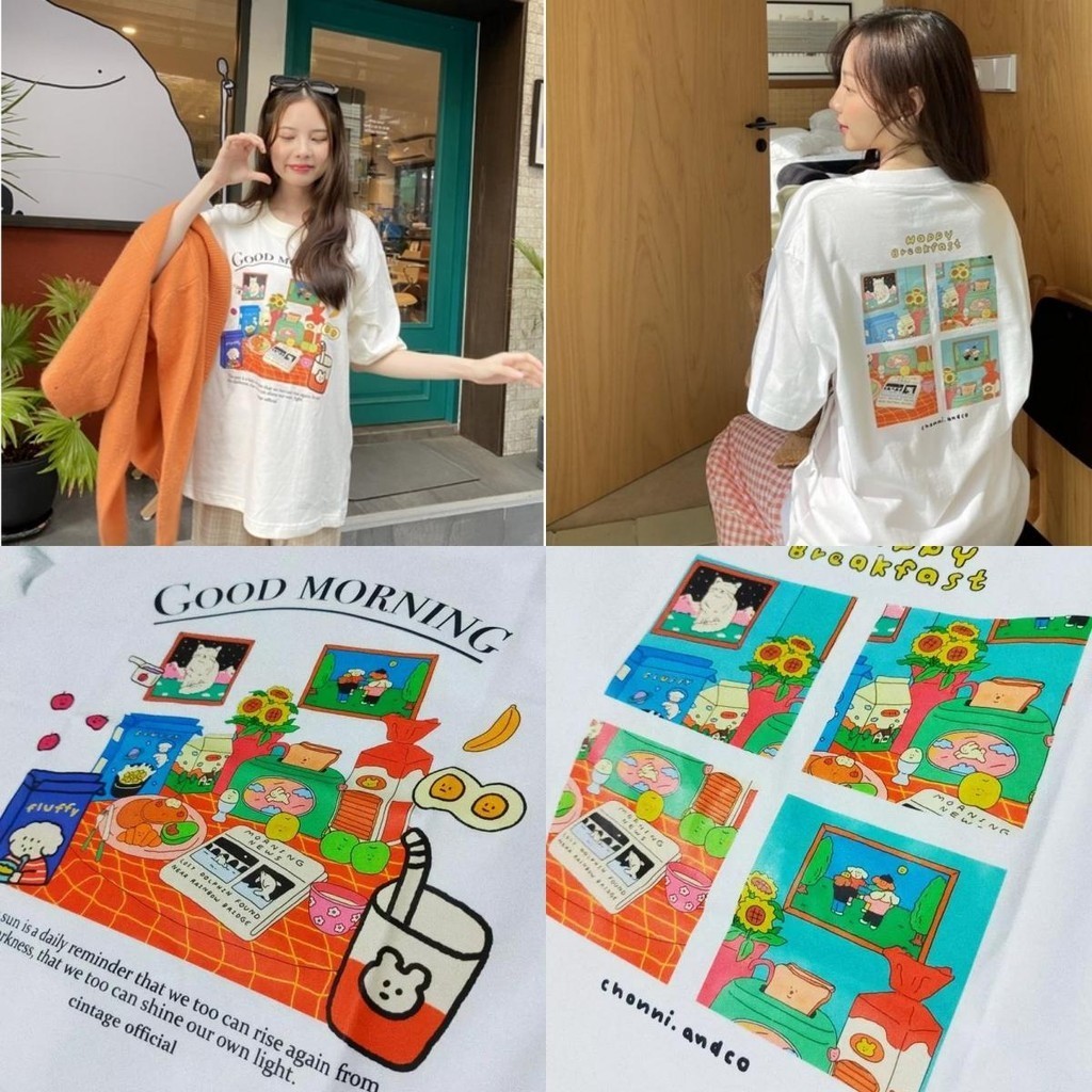 (พร้อมส่ง) oversize เสื้อยืด เสื้อแขนสั้นคอกลม เสื้อยืด GOOD MORNING ลายการ์ตูน COTTON100% ผ้าแบบนุ่มพิเศษ