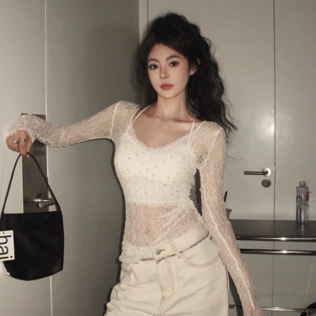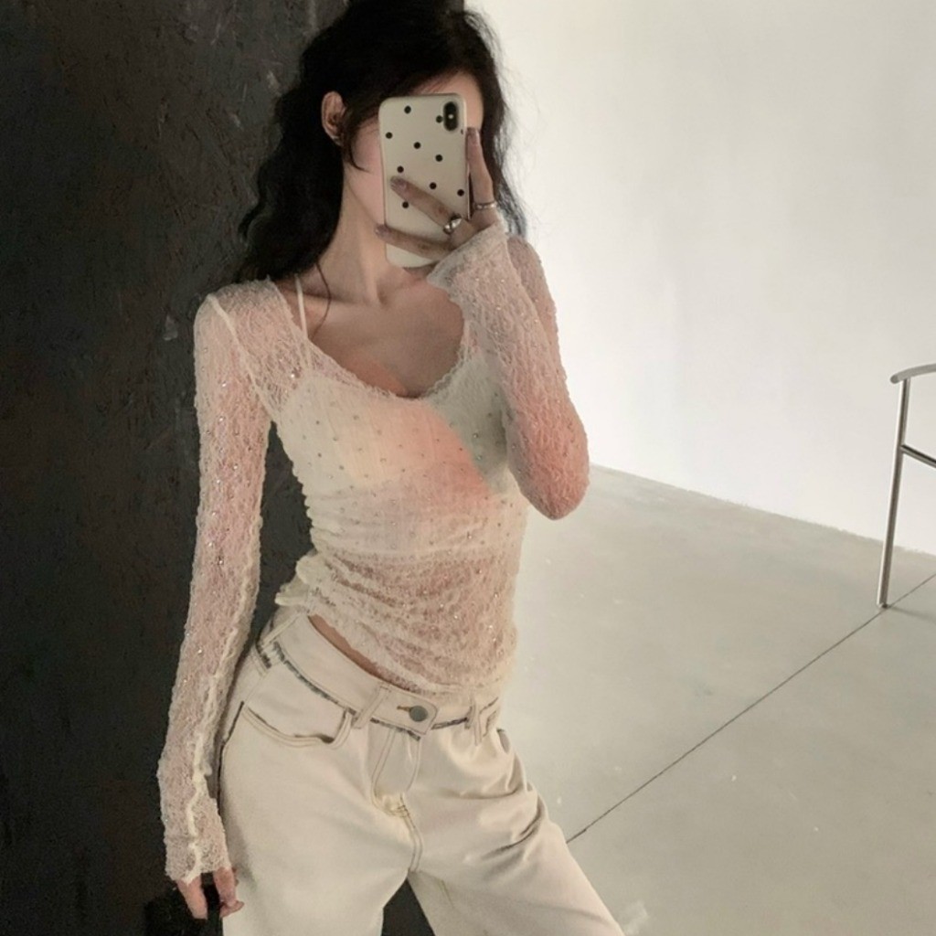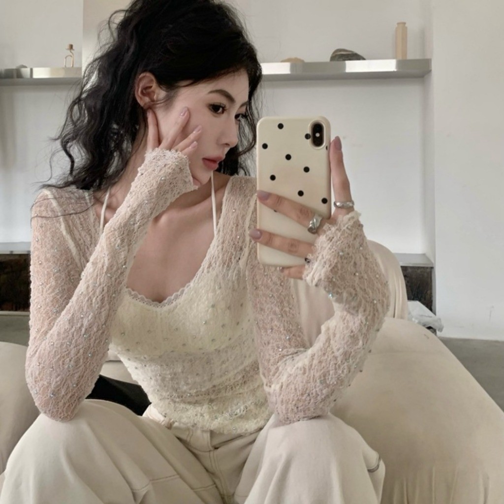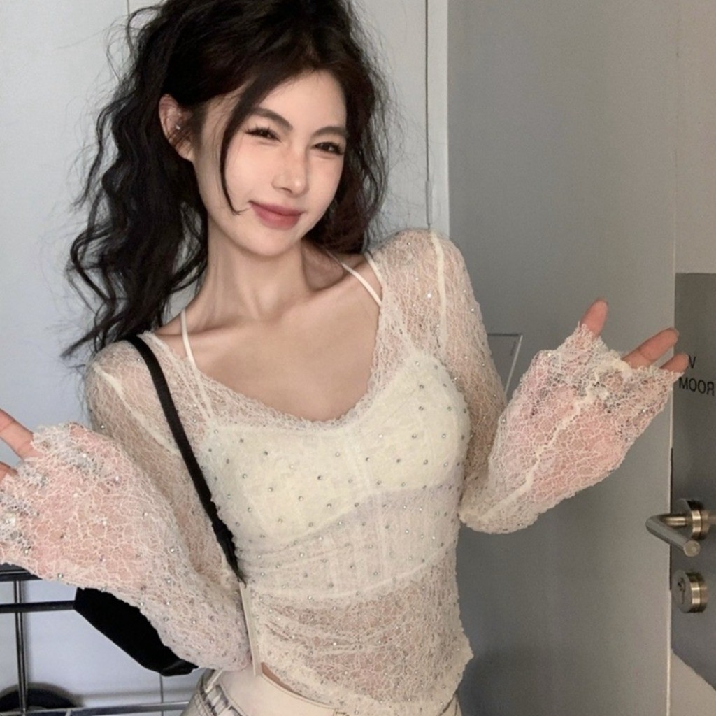 (พร้อมส่งจากกรุงเทพ🇹🇭) เสื้อลูกไม้สีทึบของผู้หญิง เสื้อยืดแขนยาวกันแดดแบบซีทรู เสื้อเบลาส์เว้าหลังทรงเข้ารูปพอดีตัว