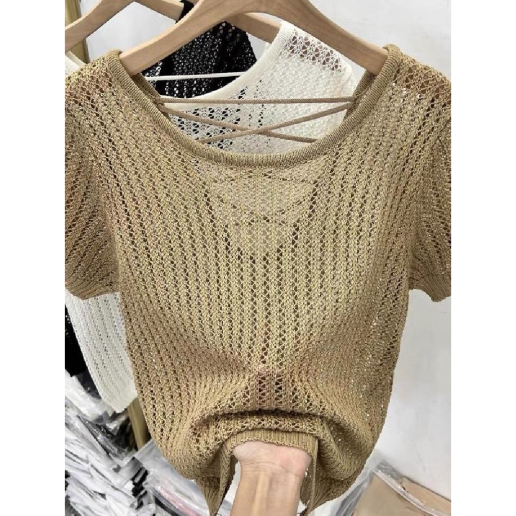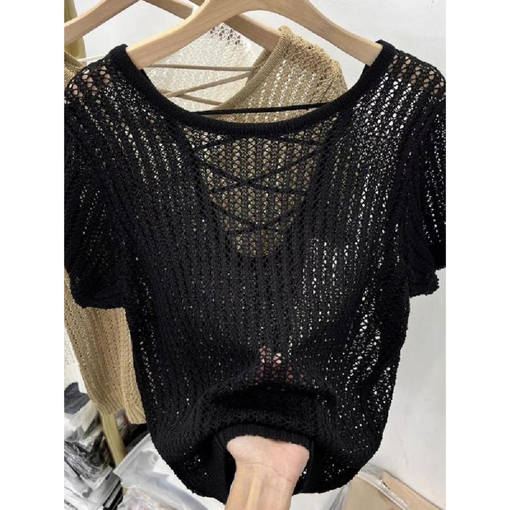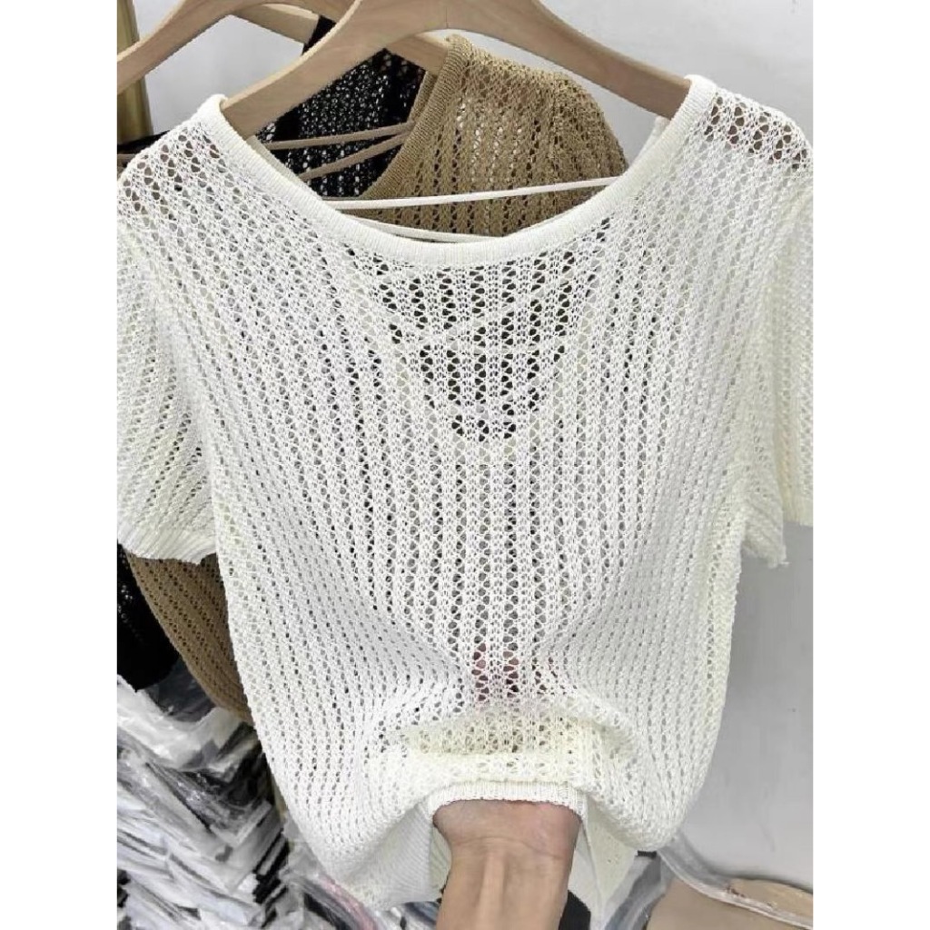 (พร้อมส่งที่ไทย#E326)เสื้อถักไหมพรมผู้หญิงแขนสั้นคอกลมลายตระข่าย ใส่คลุมBikiniได้เซ็กซี่น่ารัก