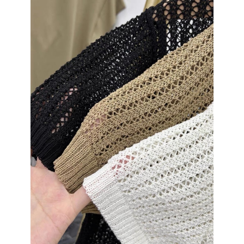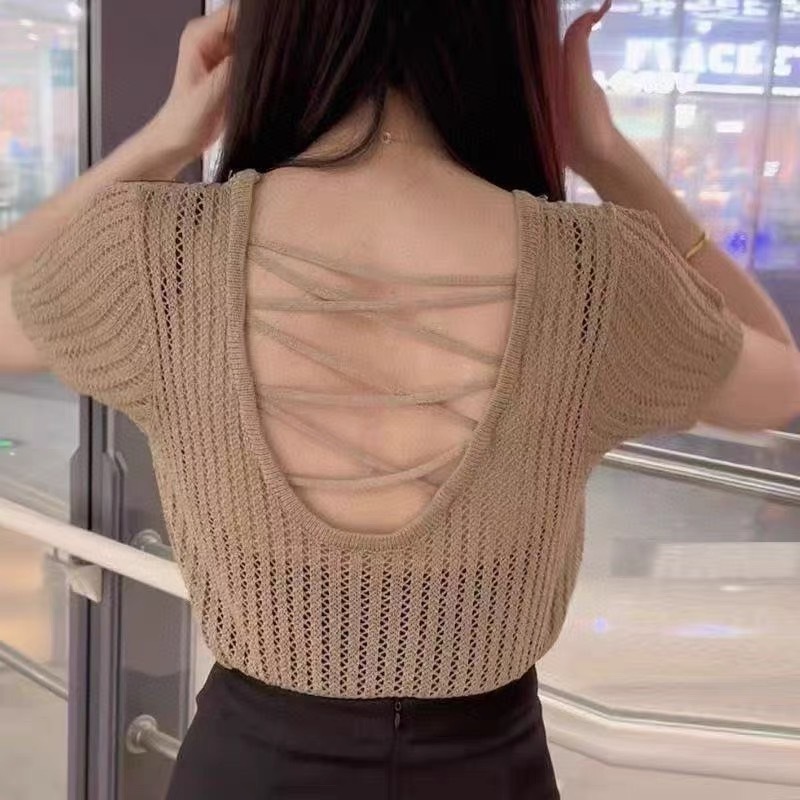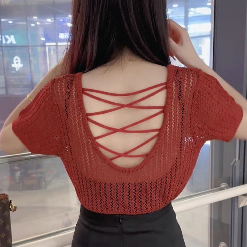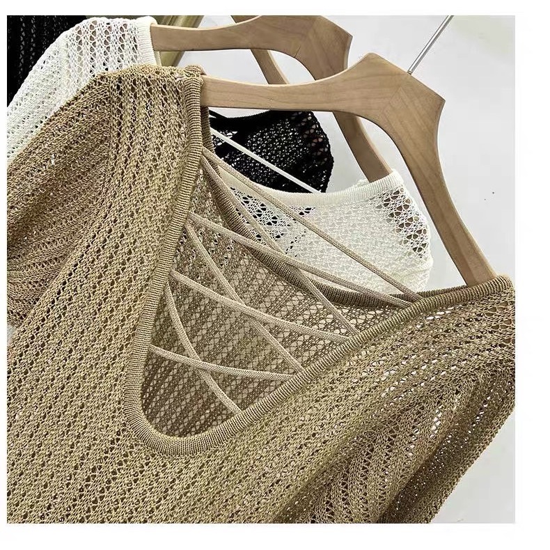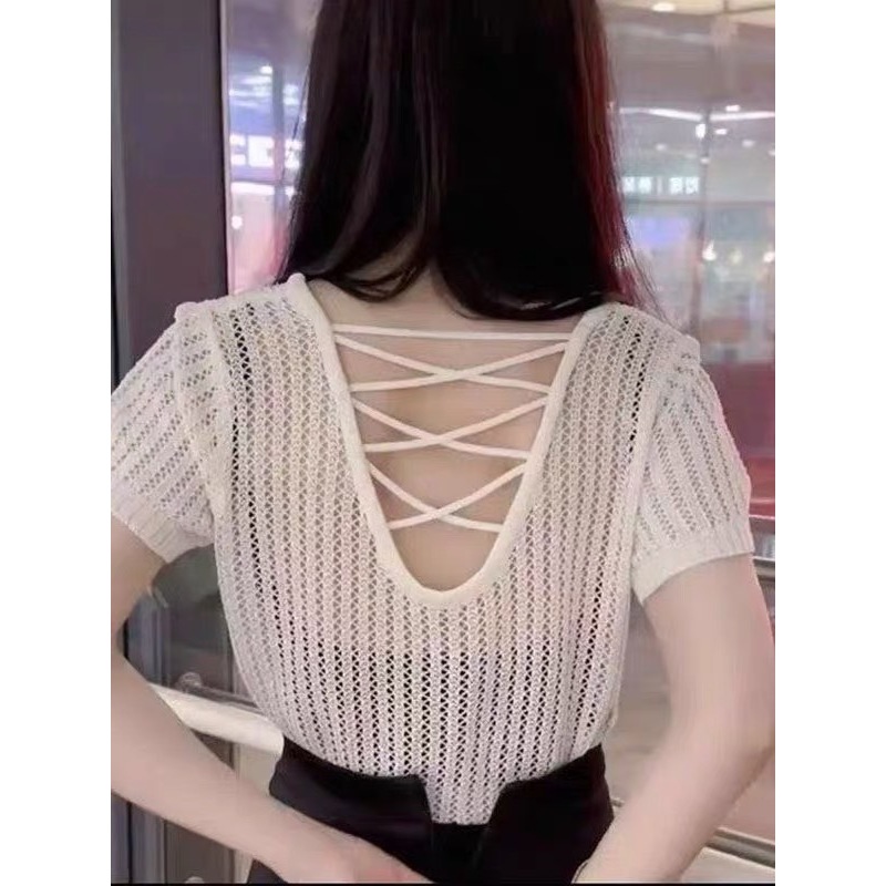 (พร้อมส่งที่ไทย#E326)เสื้อถักไหมพรมผู้หญิงแขนสั้นคอกลมลายตระข่าย ใส่คลุมBikiniได้เซ็กซี่น่ารัก