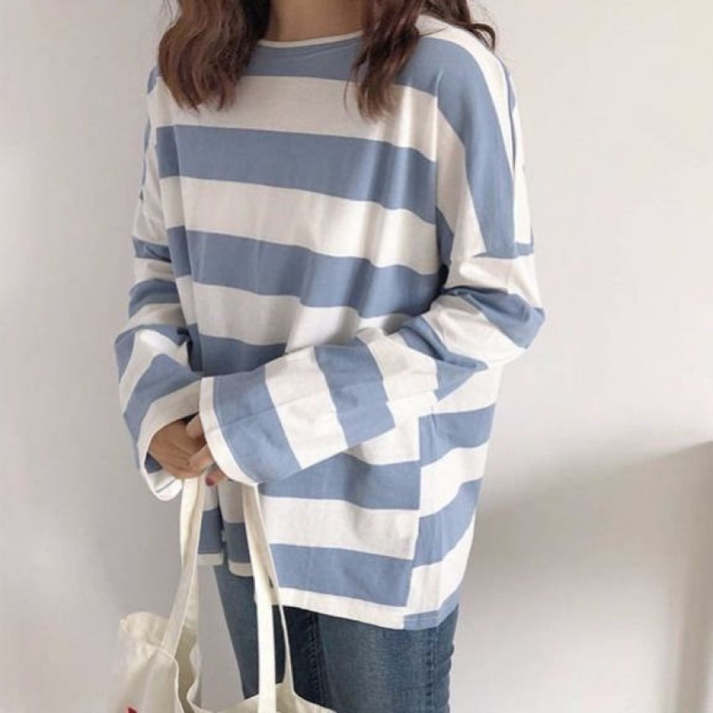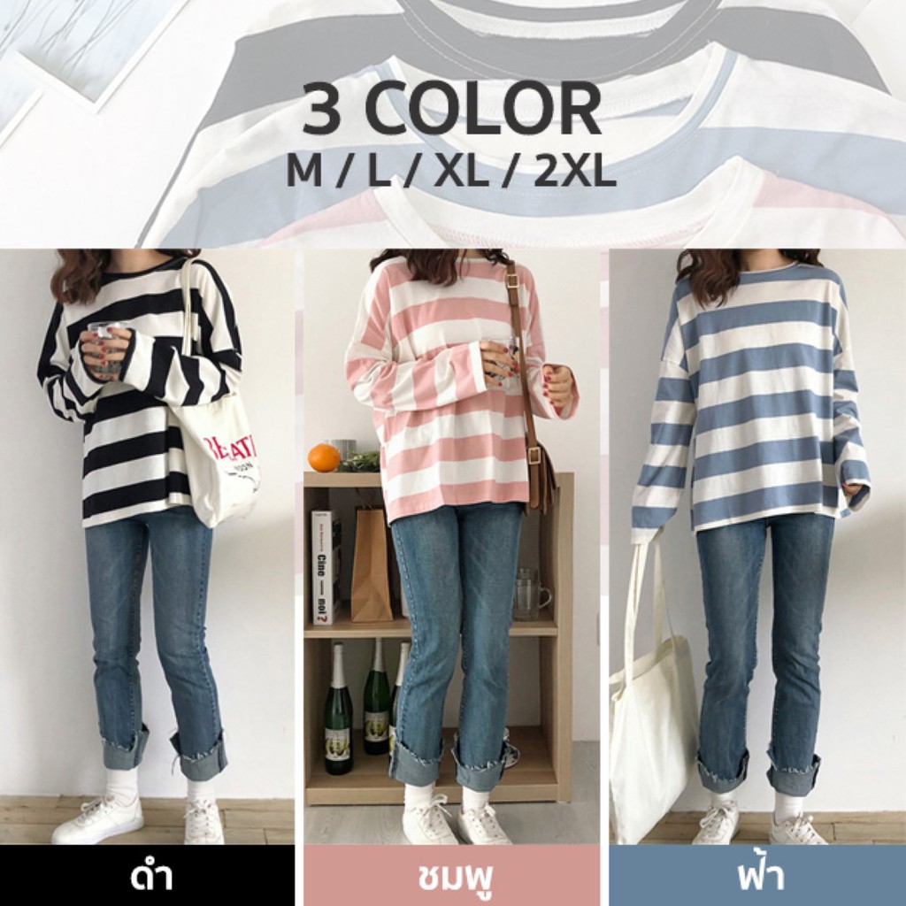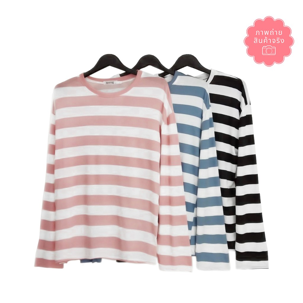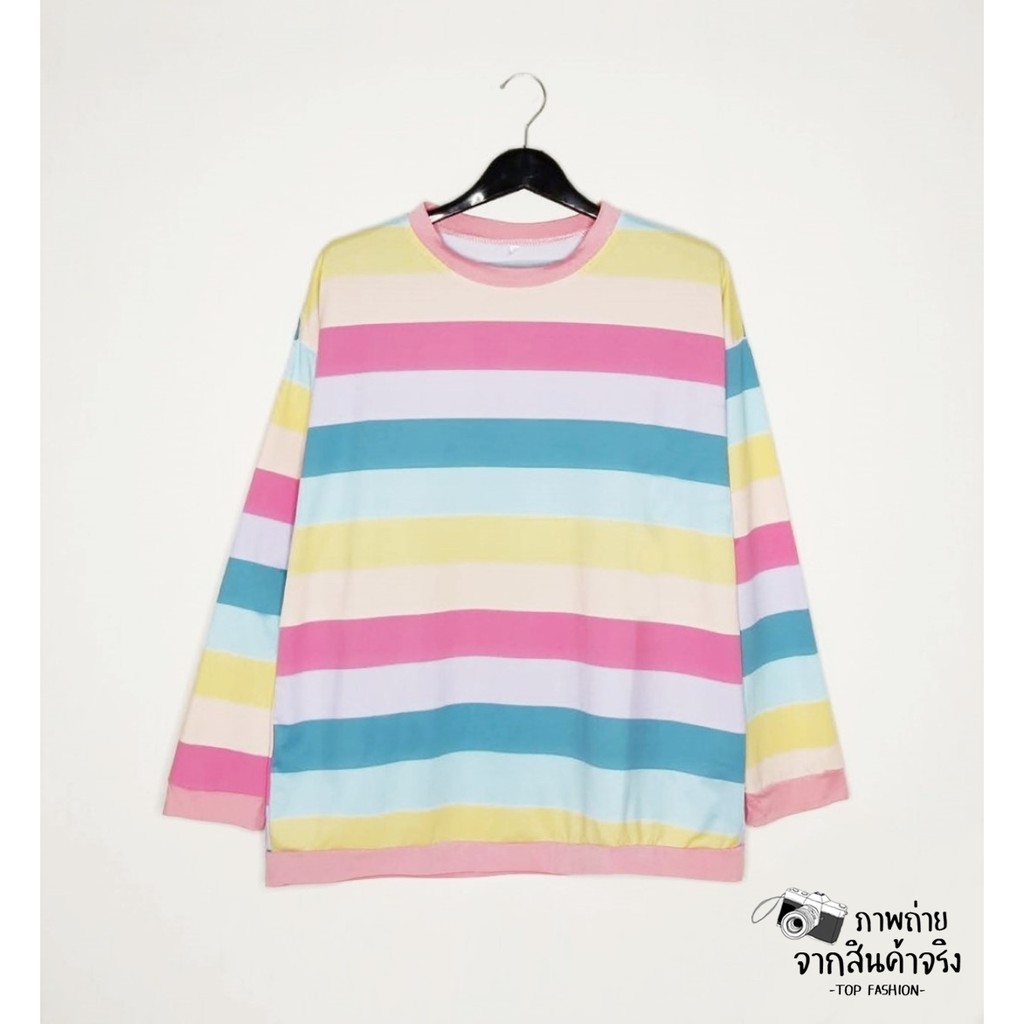 🔥พร้อมส่งไทย ราคาถูก🔥เสื้อยืด แขนยาวทรงโอเวอร์ไซส์ ผ้าคอตตอน ใส่สบาย ลายทางสีพาสเทล แฟชั่น