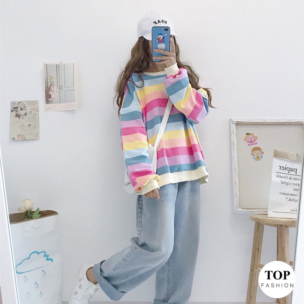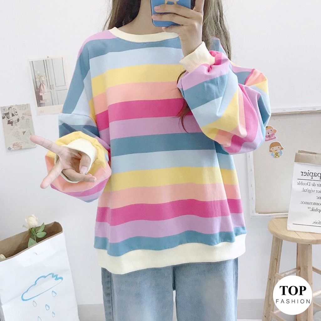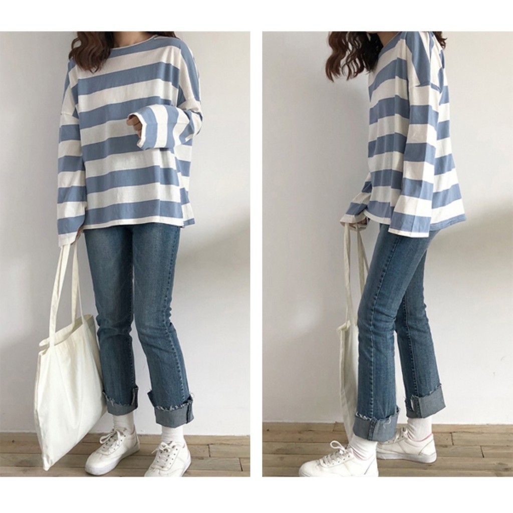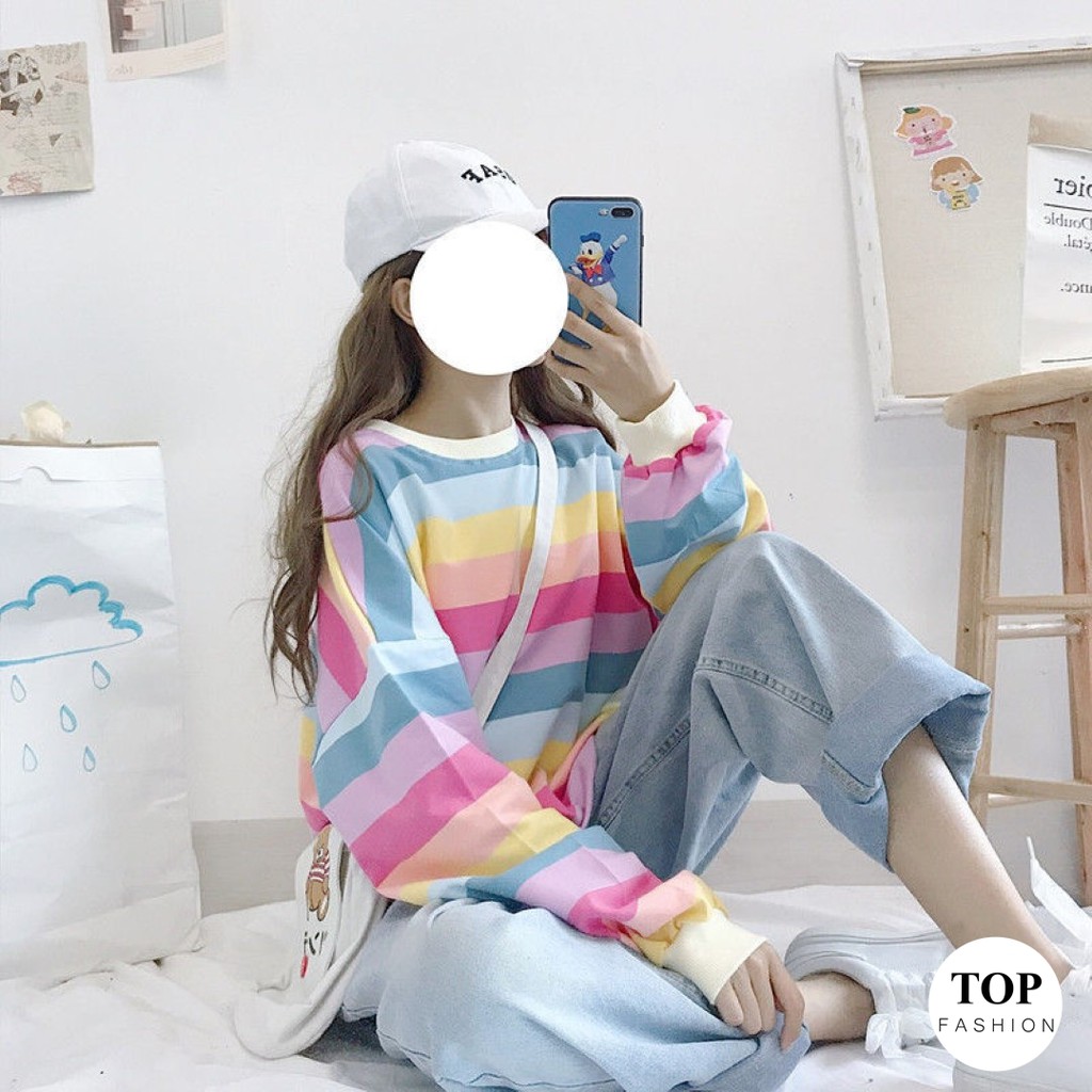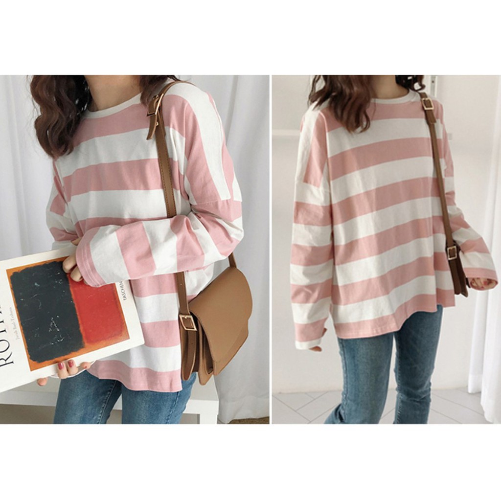 🔥พร้อมส่งไทย ราคาถูก🔥เสื้อยืด แขนยาวทรงโอเวอร์ไซส์ ผ้าคอตตอน ใส่สบาย ลายทางสีพาสเทล แฟชั่น