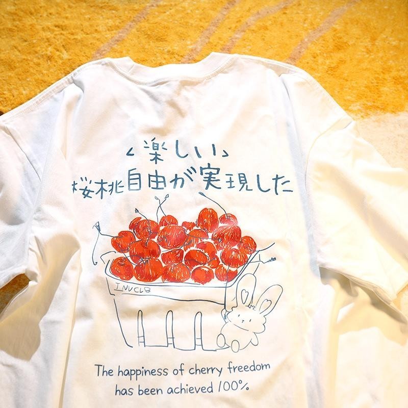 🚚【จัดส่งจากไทย】เสื้อยืดพิมพ์ลายเชอร์รี่สไตล์เกาหลีไฮเอนด์ แขนสั้น คอกลม ผ้าเนื้อนุ่ม สวมใส่สบาย