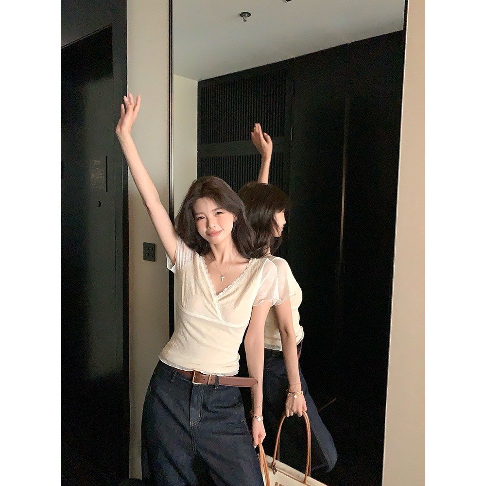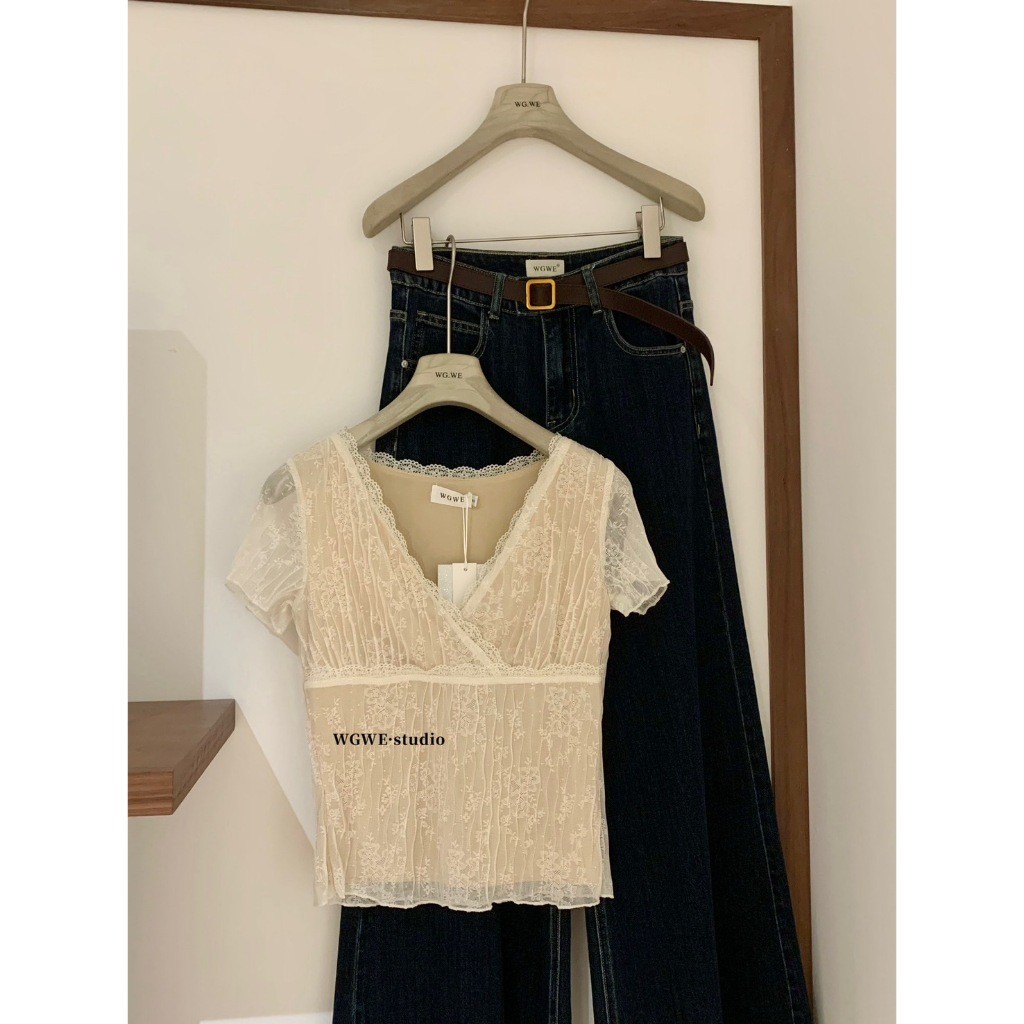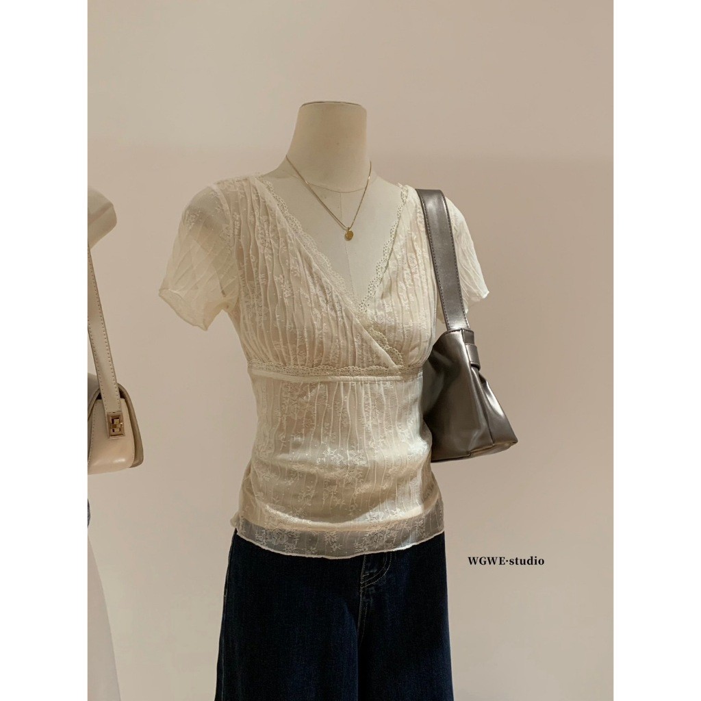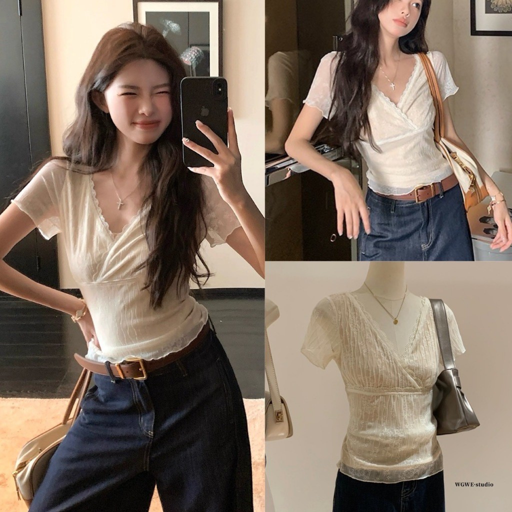 🤎 W6405 เสื้อแขนสั้น แต่งผ้าลูกไม้ทั้งตัว มีซับในสีครีม ผ้านิ่ม งานสวยเก๋มากๆค่า แฟชั่นเกาหลี TAG WG.WE 🤎 🤎