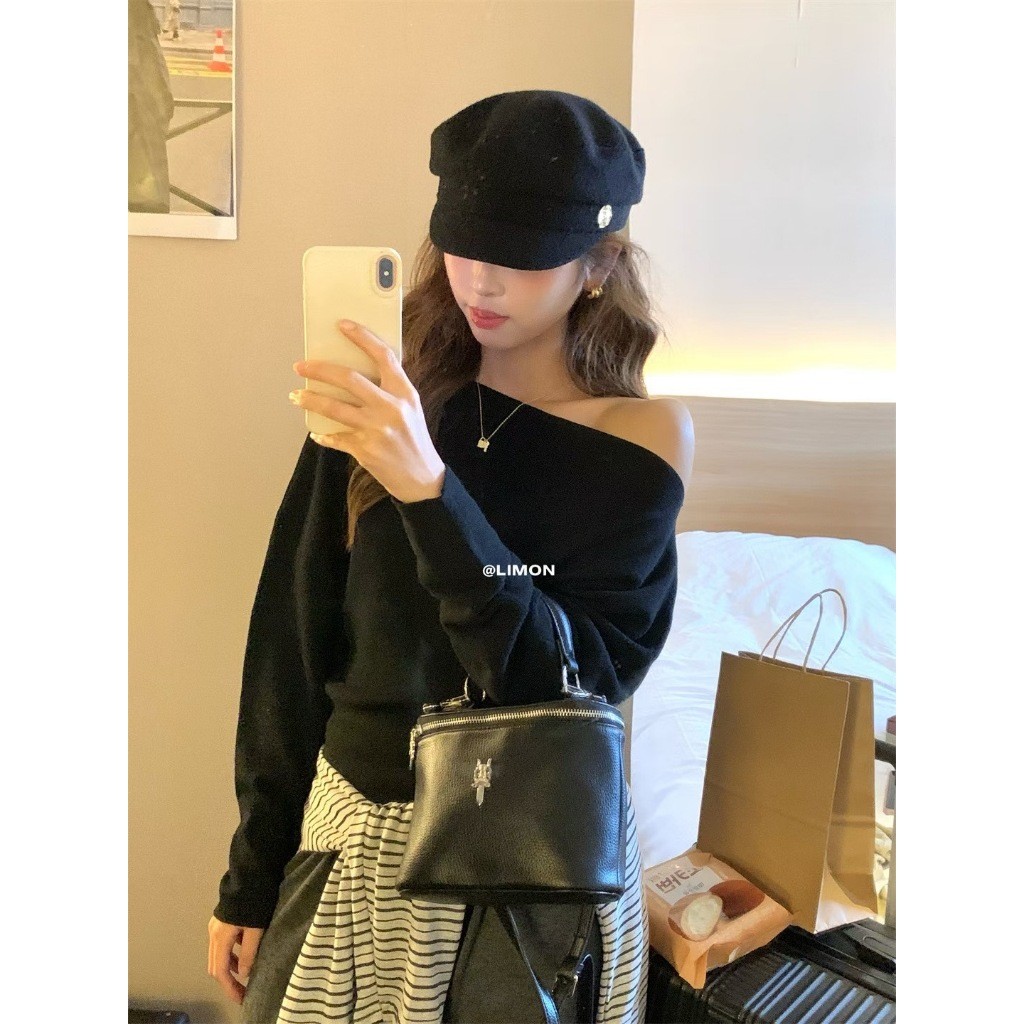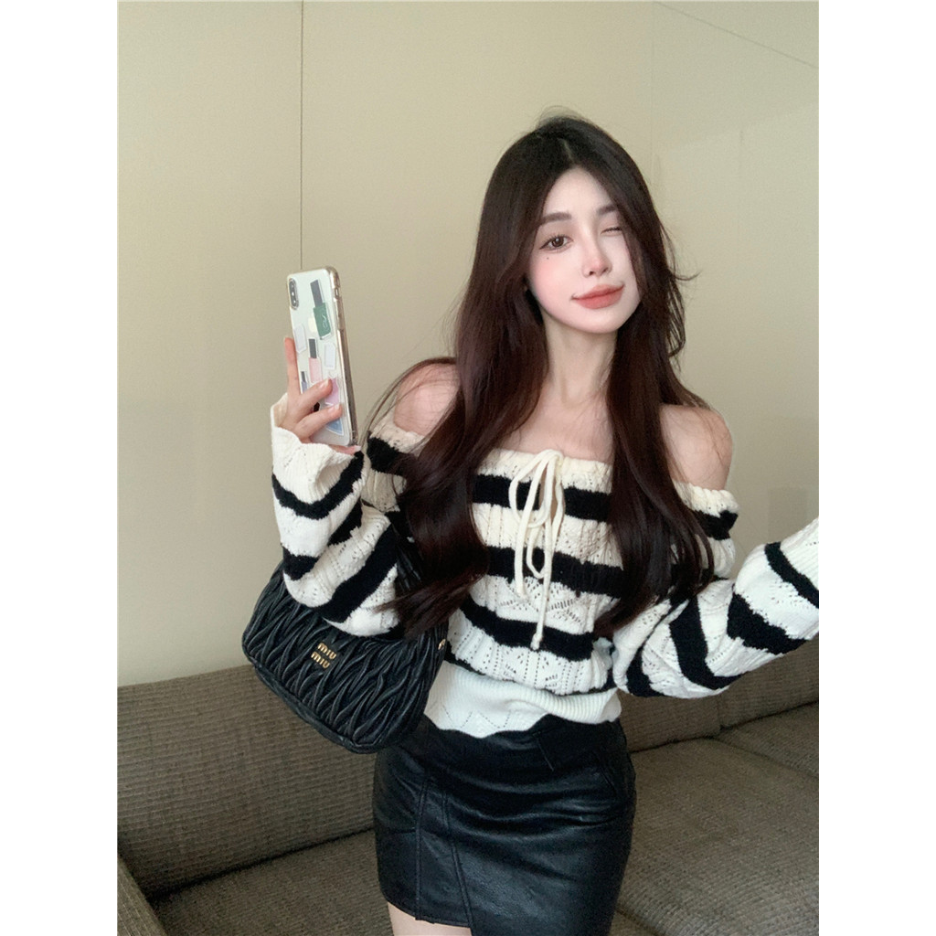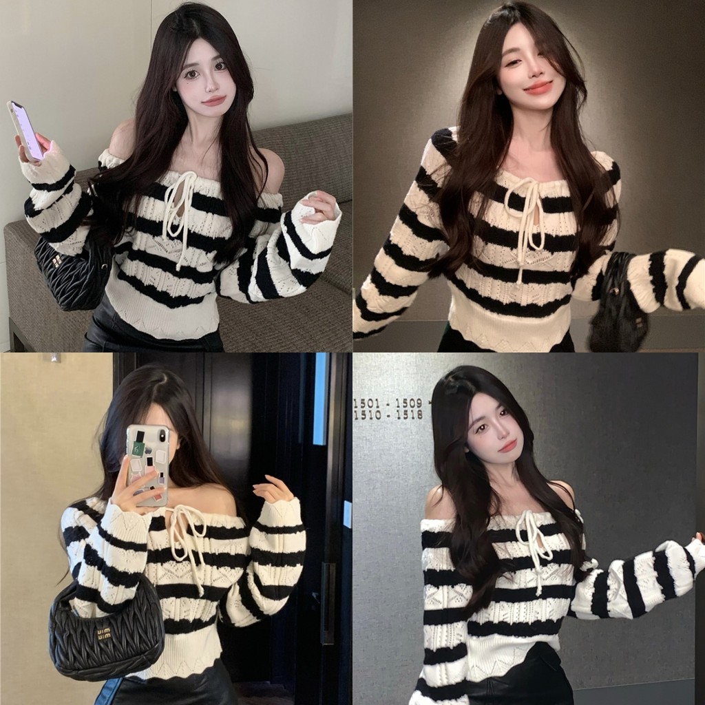 🖤Kayla🖤เสื้อยืด ไหมพรม ลายขวาง เปิดไหล่ แขนยาว ผูกโบว์ เสื้อครอป สไตล์เกาหลี แฟชั่น น่ารัก#1682