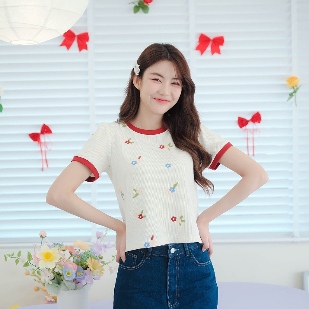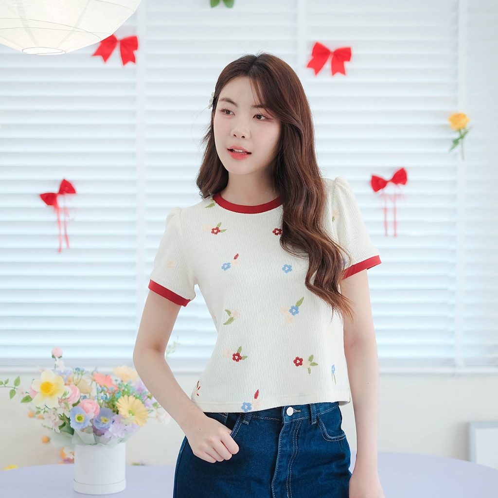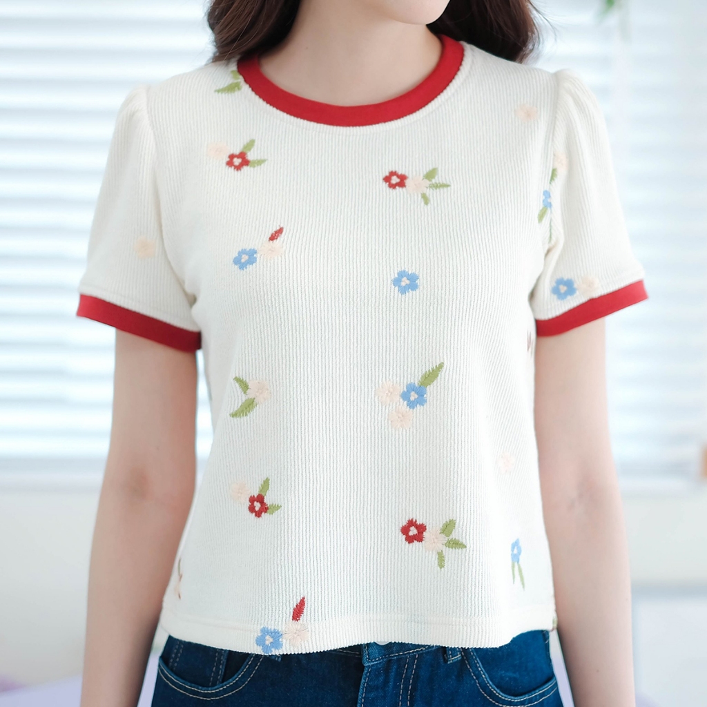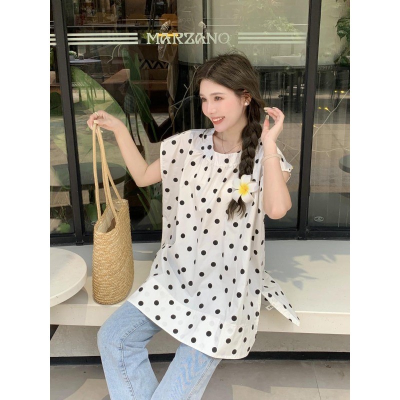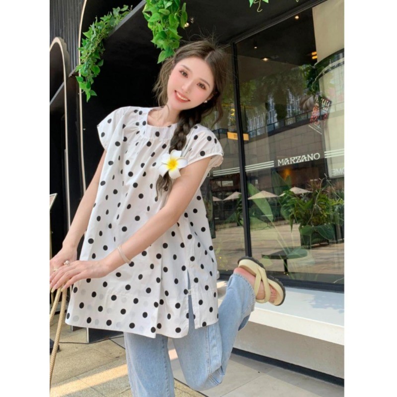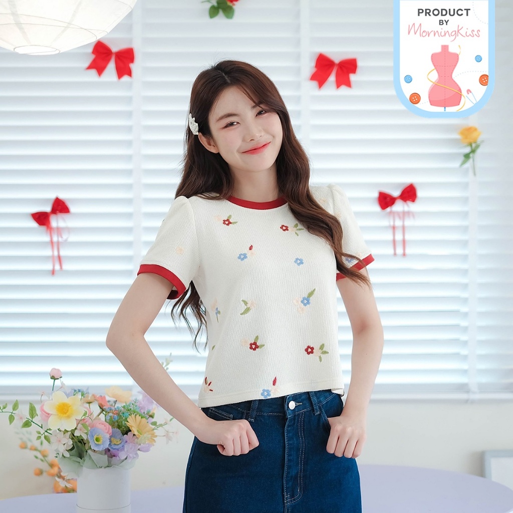 ⭐Fern Shop แขนสั้นพิมพ์ลายสีขาวไหล่บวกแบบฝรั่งเศส