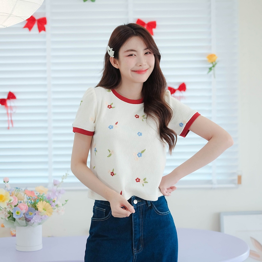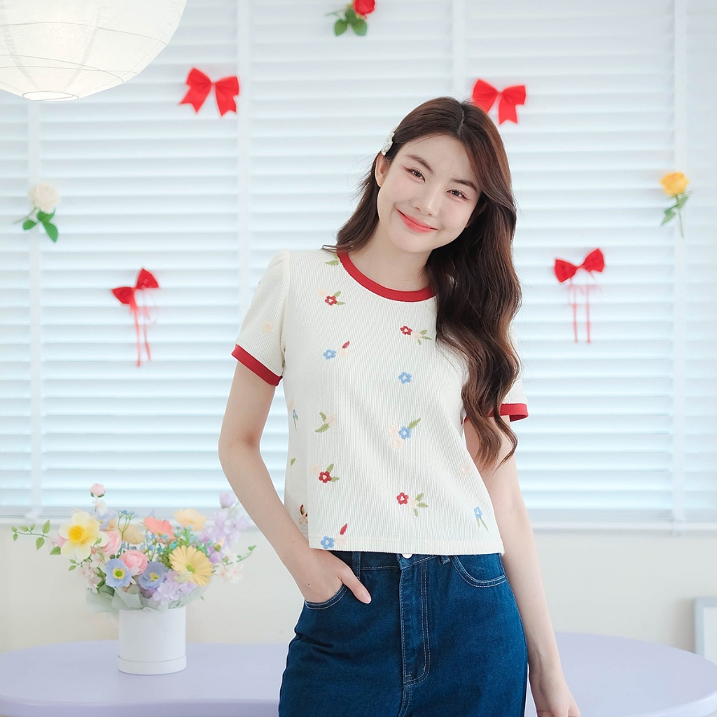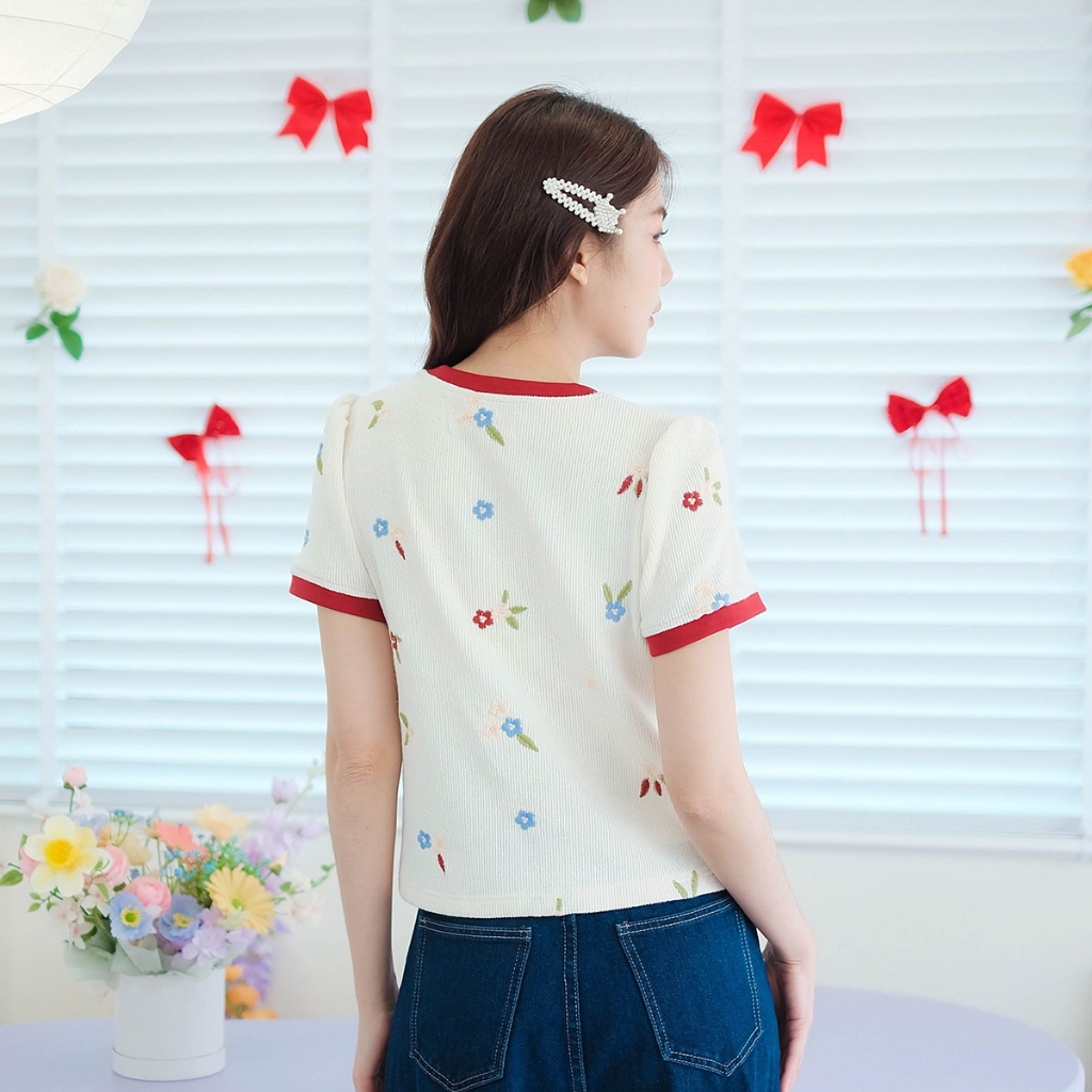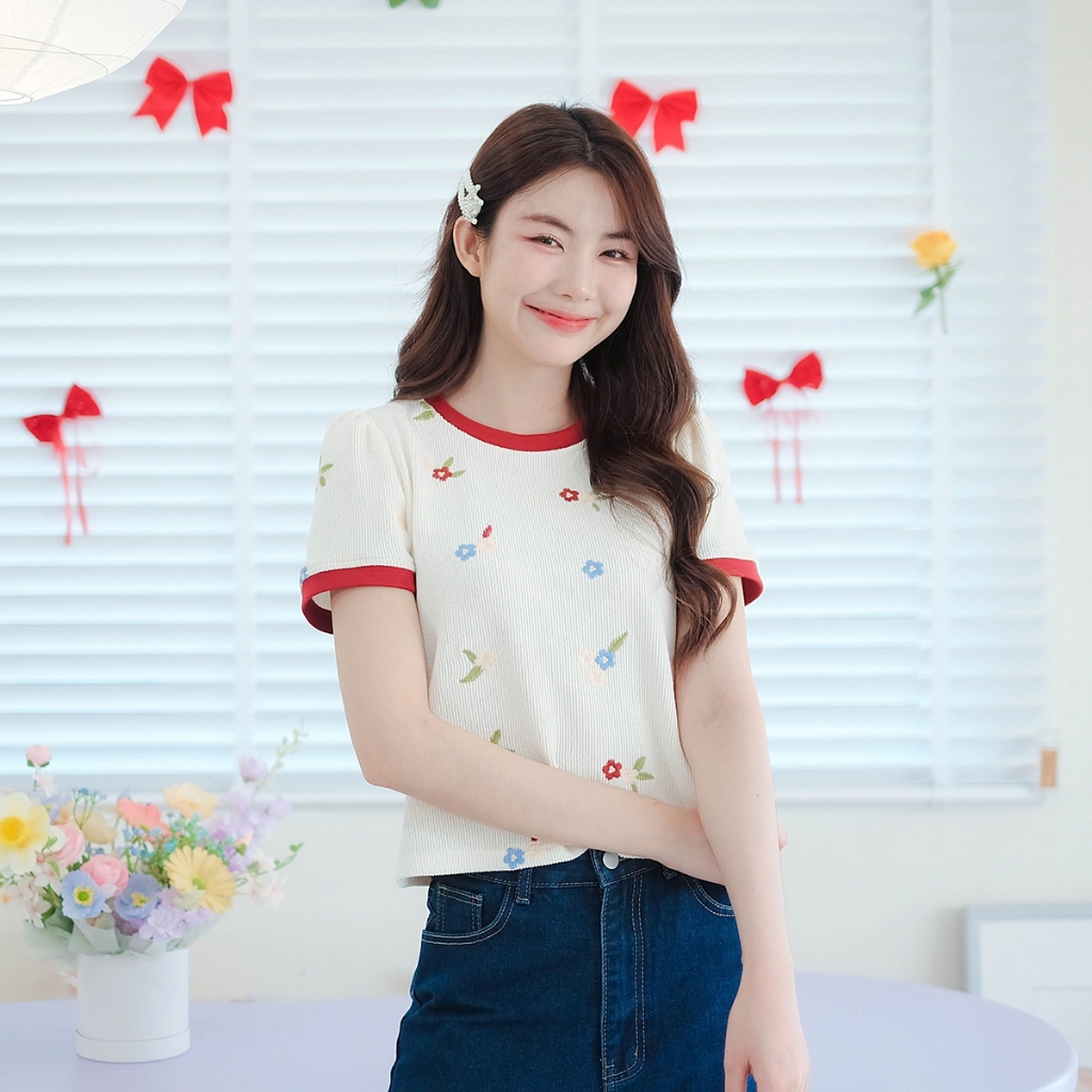 ⭐Fern Shop แขนสั้นพิมพ์ลายสีขาวไหล่บวกแบบฝรั่งเศส