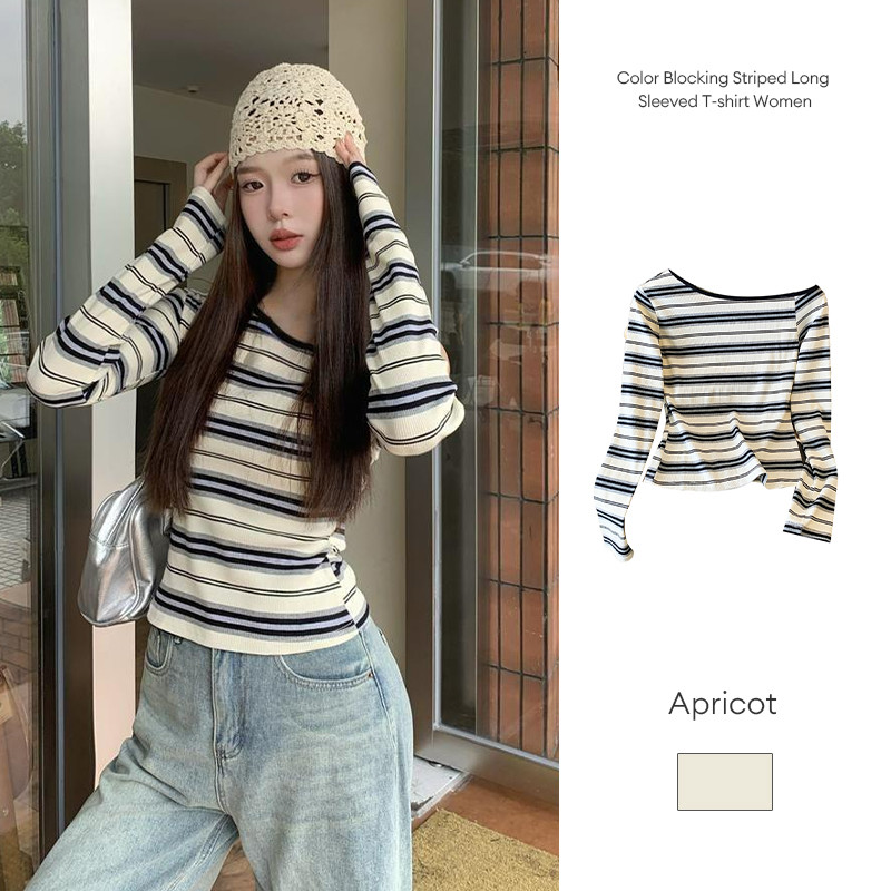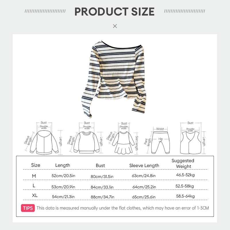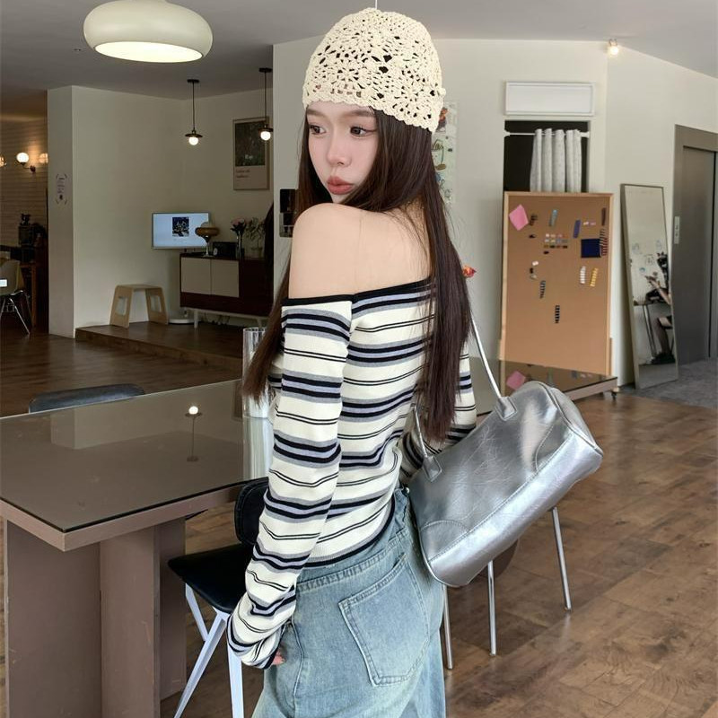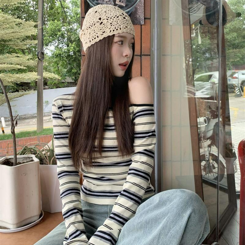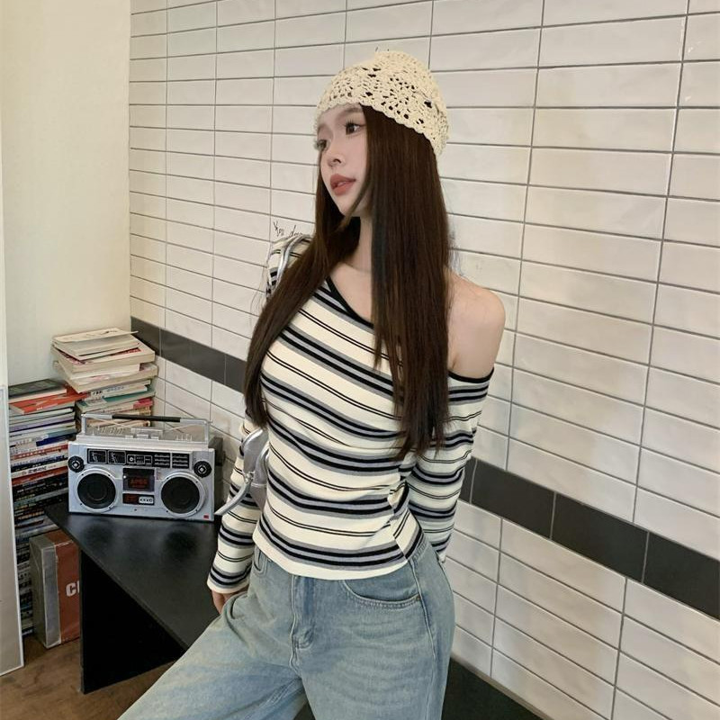 เสื้อแขนยาวลายทางดีไซน์เปิดไหล่ที่ทันสมัยและเซ็กซี่ของผู้หญิง-MTY