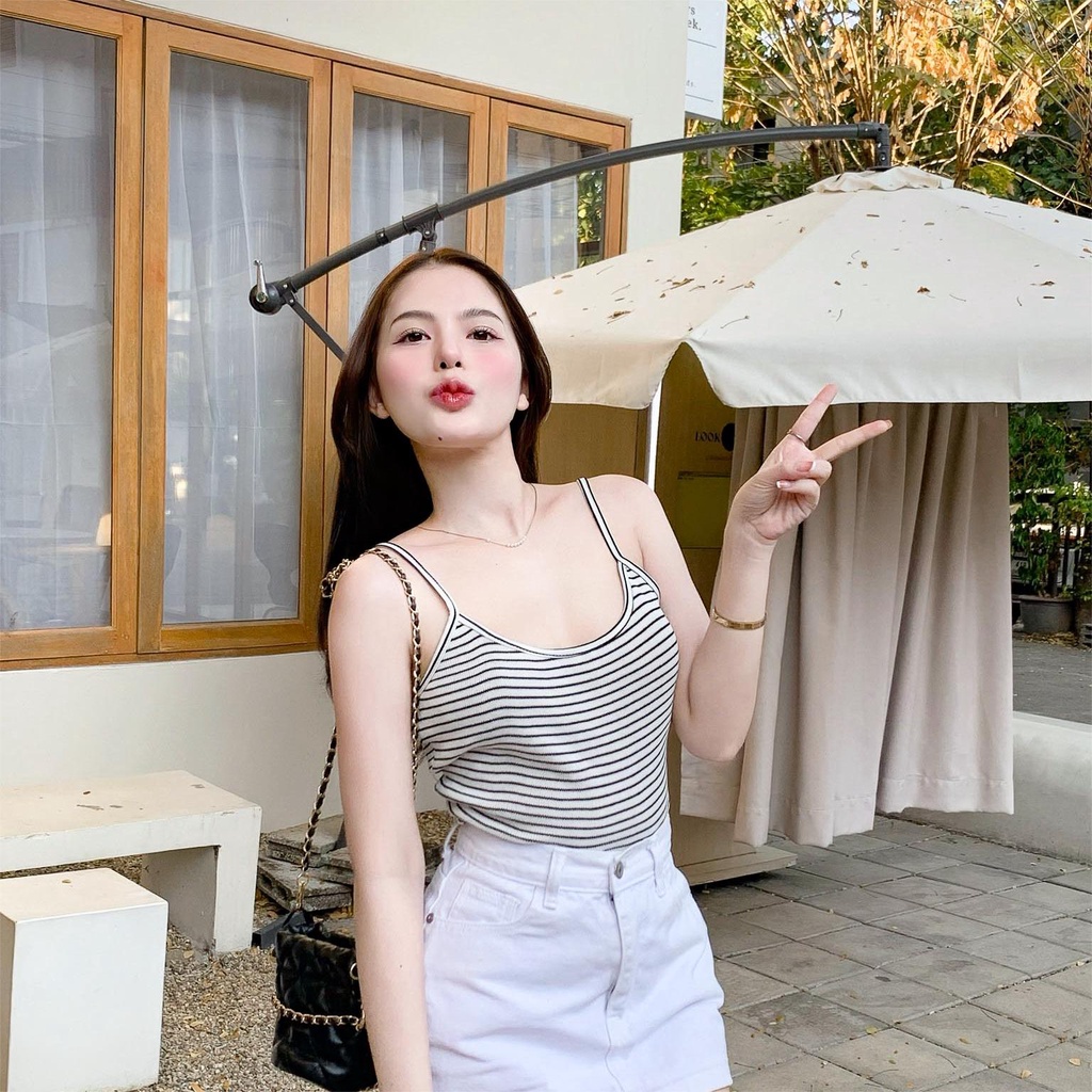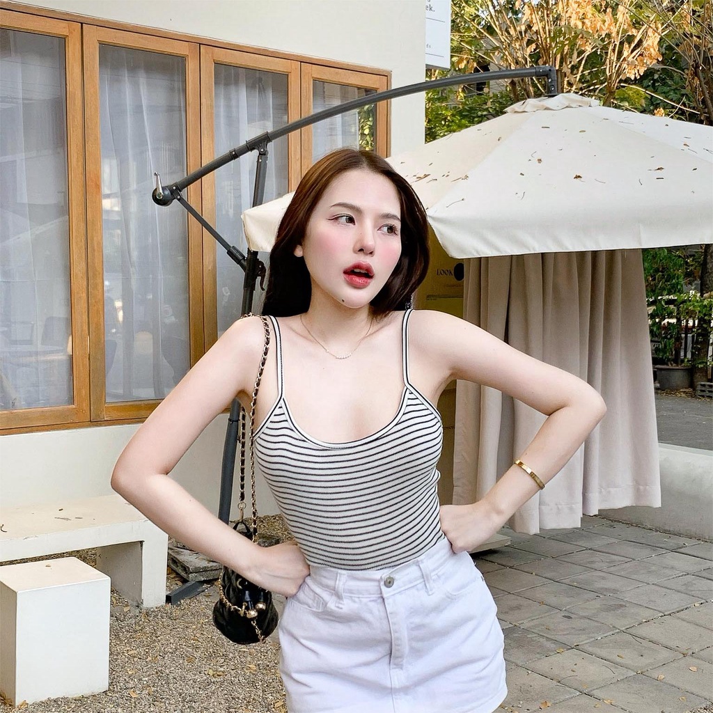 Aurora 🛒พร้อมส่ง🚚 เสื้อสายเดี่ยว ไหมพรม ลายทางเล็กๆ เข้ารูป สวยงาม โชว์อกลุคเเซ่บ ดีเทลเว้าหลังเซ็กซี่เบาๆ 85143