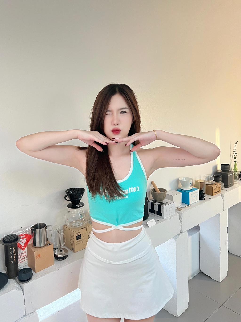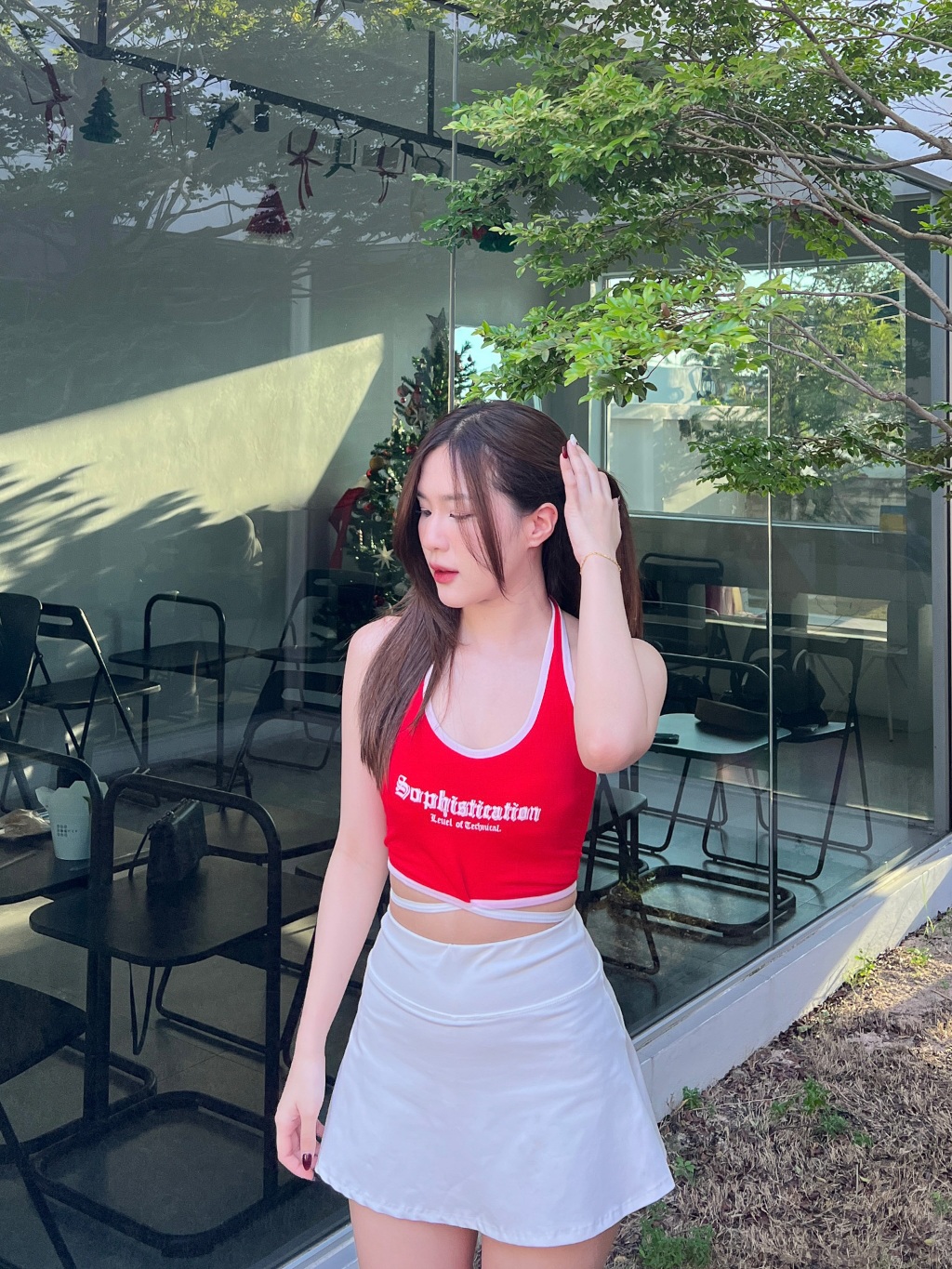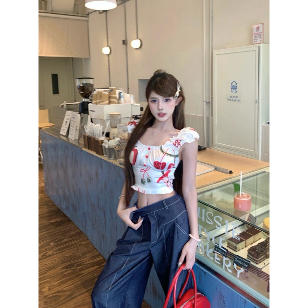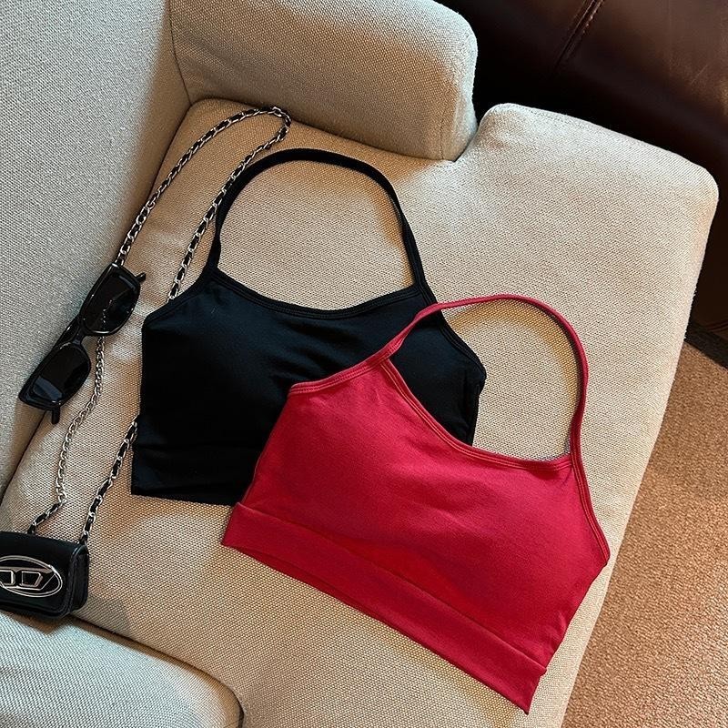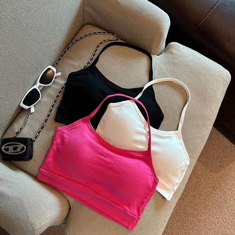 Aurora🛒พร้อมส่ง เสื้อครอป สายเดี่ยว ครอปสีพื้น มีฟองในตัว สไตล์ พิมพ์ลายสตรีท ดีเทลแต่งเชือกมัดเอว y2k สาวสตรีทสุด2489