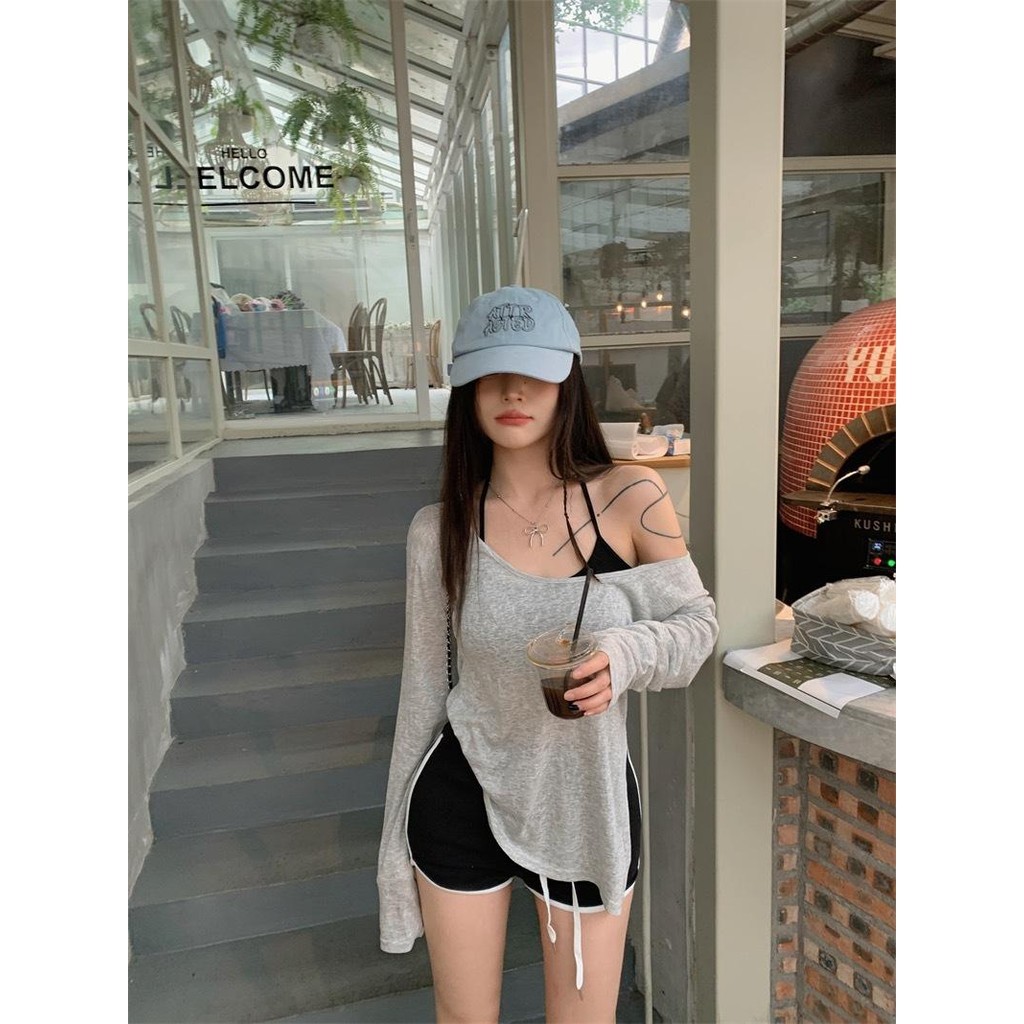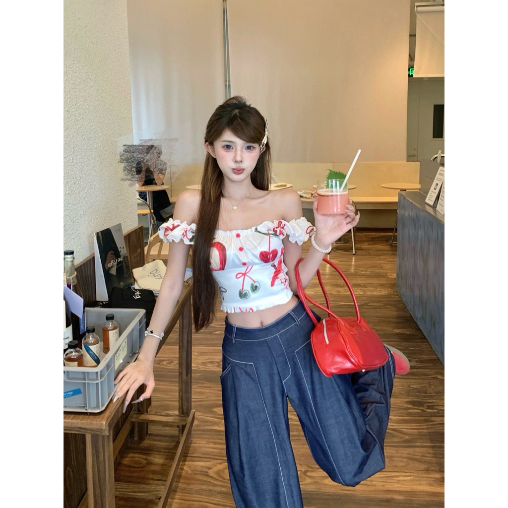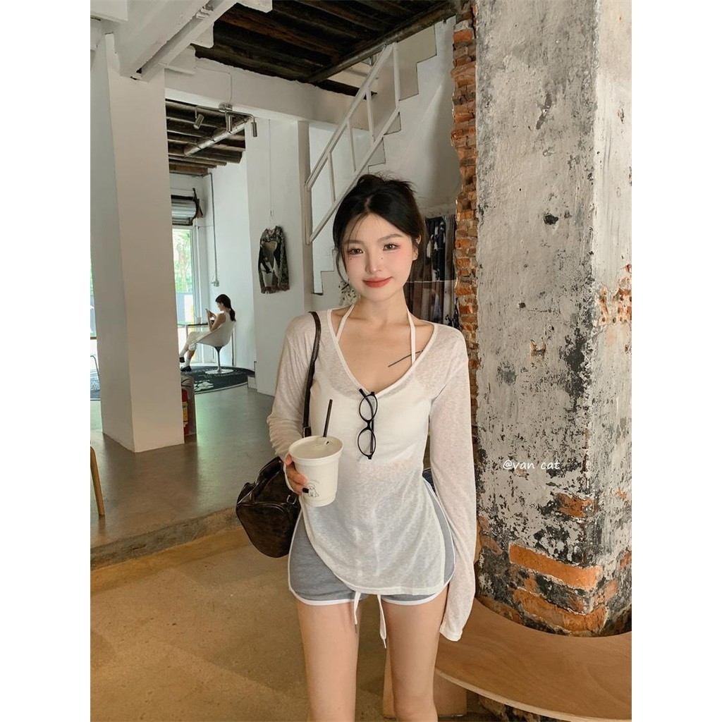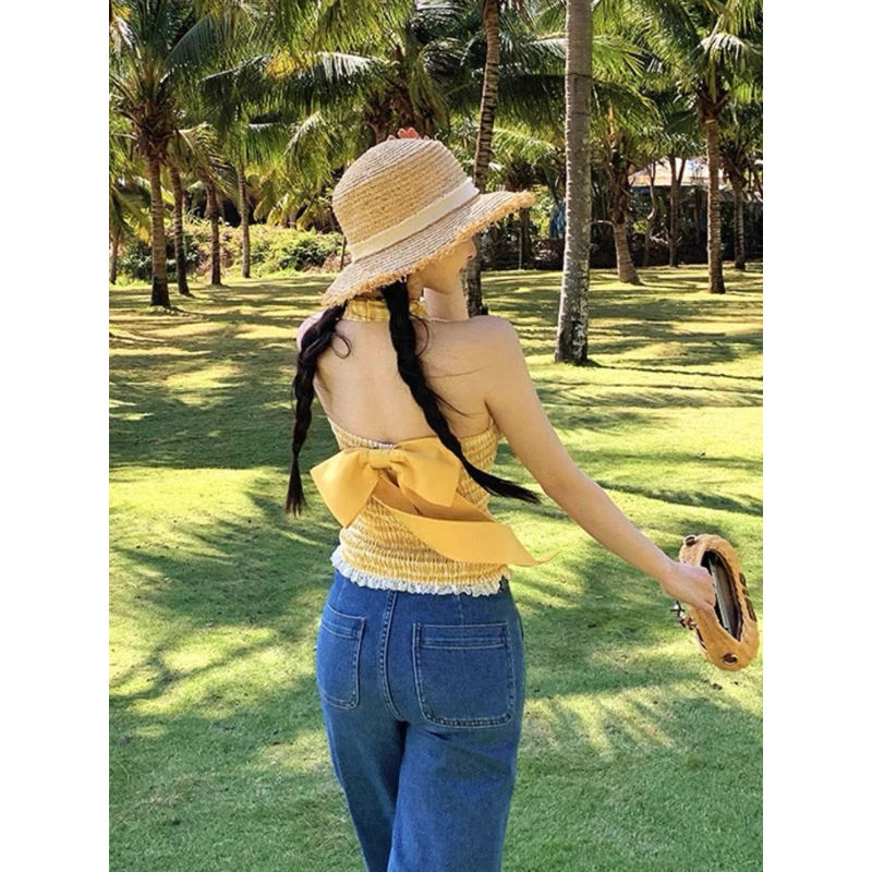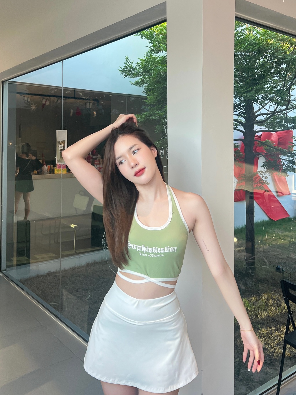 Aurora🛒พร้อมส่ง เสื้อครอป สายเดี่ยว ครอปสีพื้น มีฟองในตัว สไตล์ พิมพ์ลายสตรีท ดีเทลแต่งเชือกมัดเอว y2k สาวสตรีทสุด2489