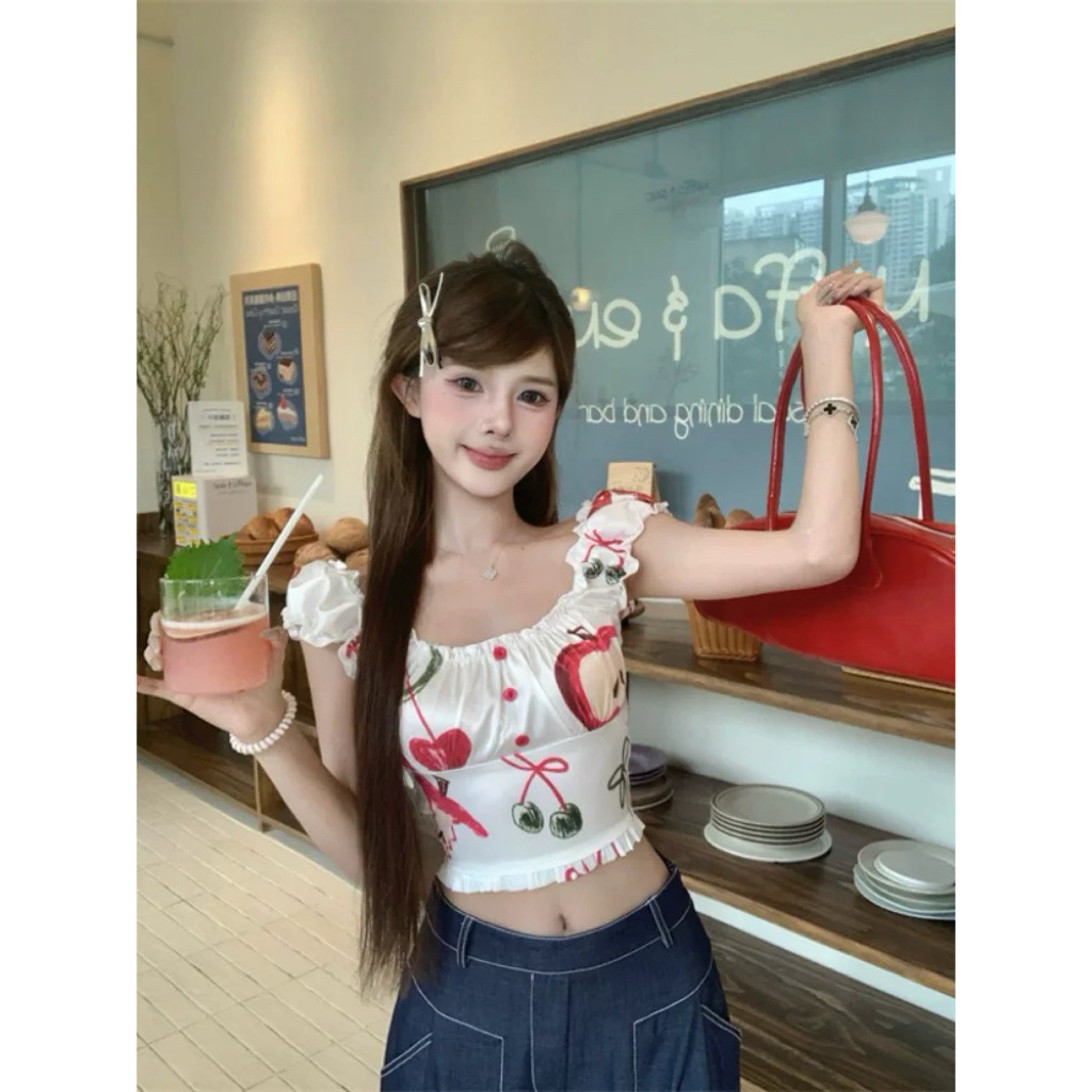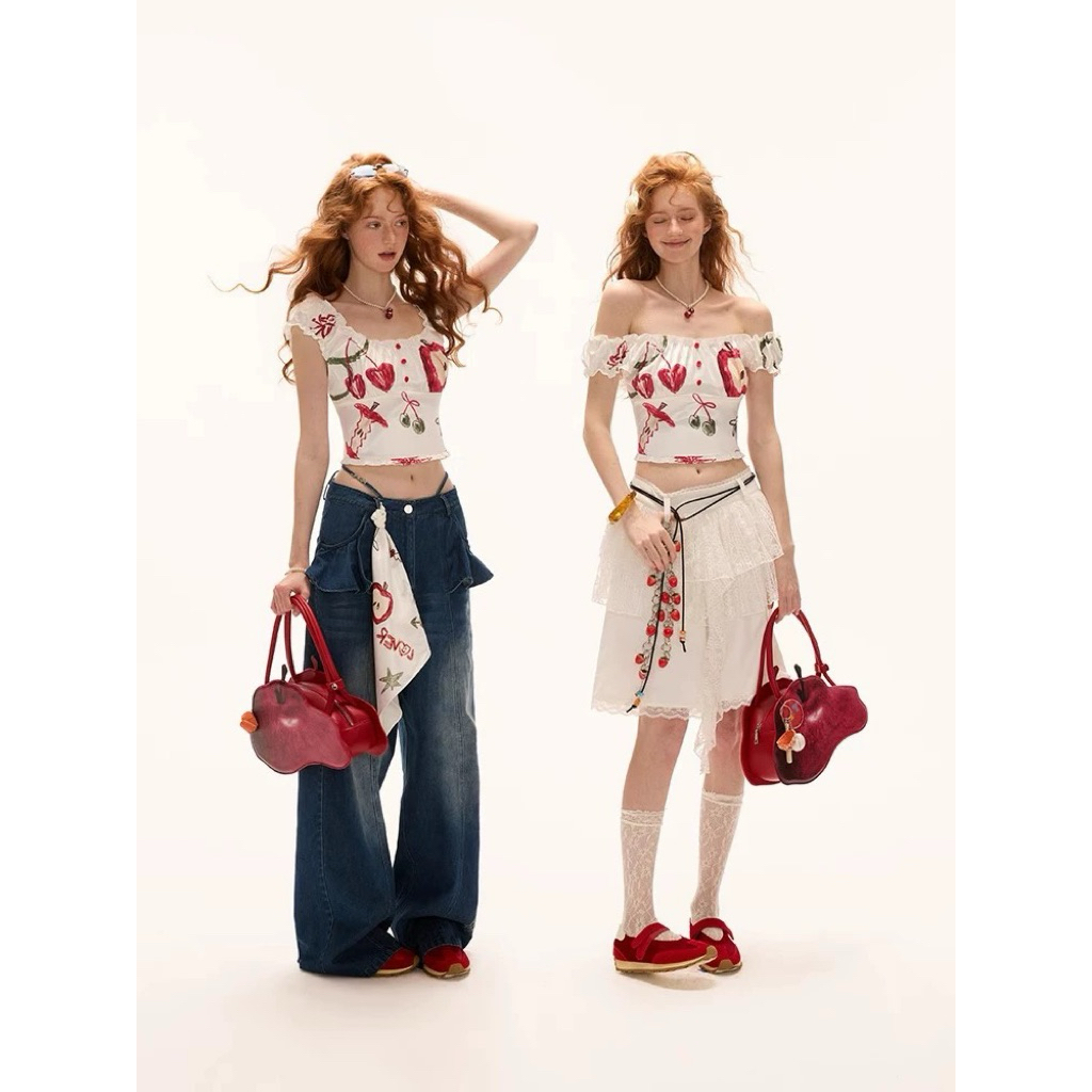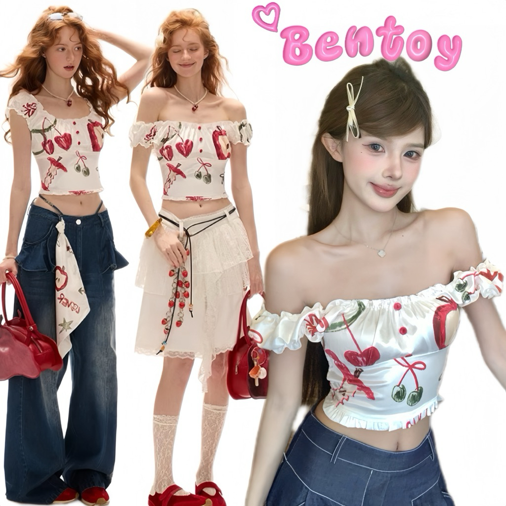Bentoy(1515)เสื้อครอปลายแอปเปิ้ล น่ารักมาก ใส่เป็นปาดไหล่ได้ แขนมีการยืดหยุ่นได้ ใส่สบาย