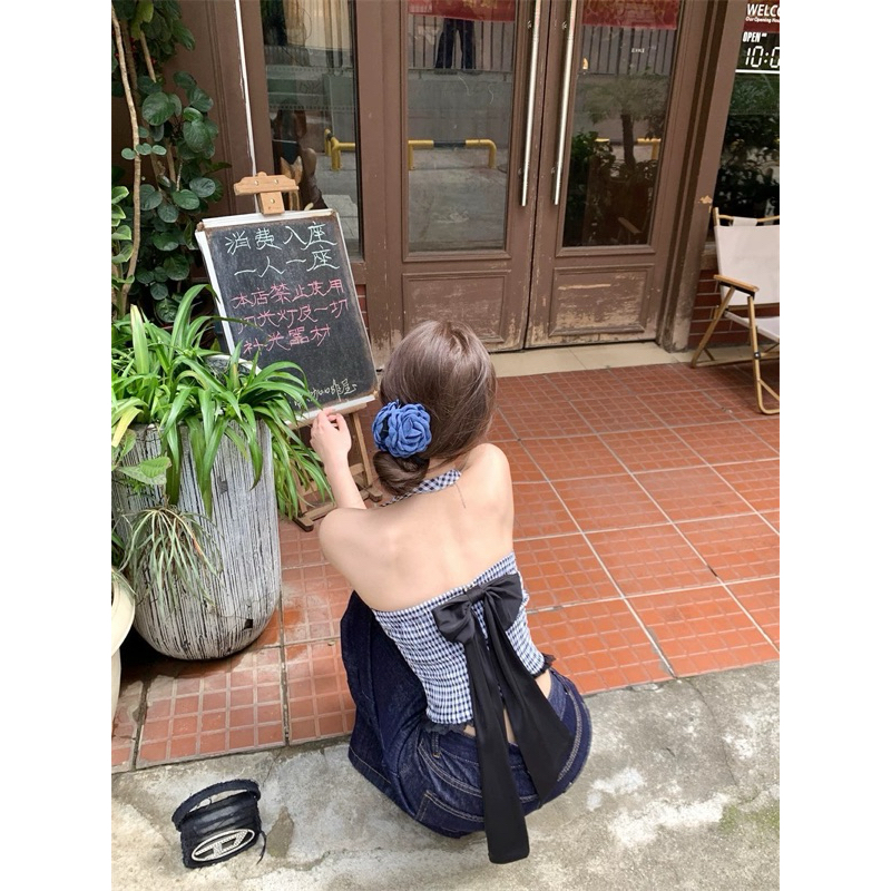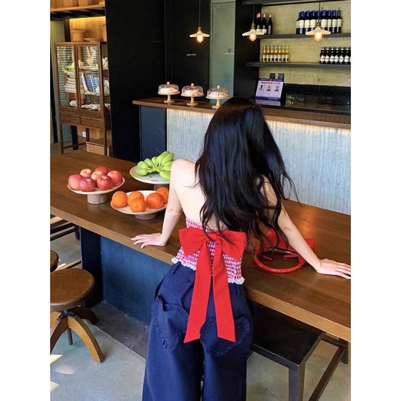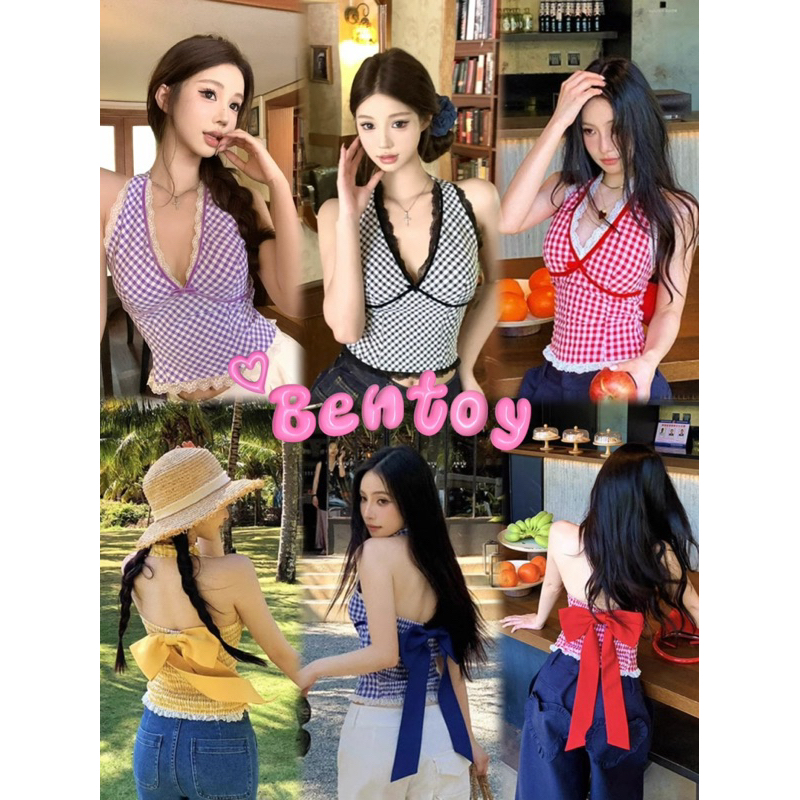 Bentoy(bratop855)ฟองน้ำในตัว เสื้อกล้ามหน้าวีลึก ลายสก๊อต หลังสม็อคยืดตามตัว ติดโบว์ใหญ่สามารถถอดได้ ใส่สบาย