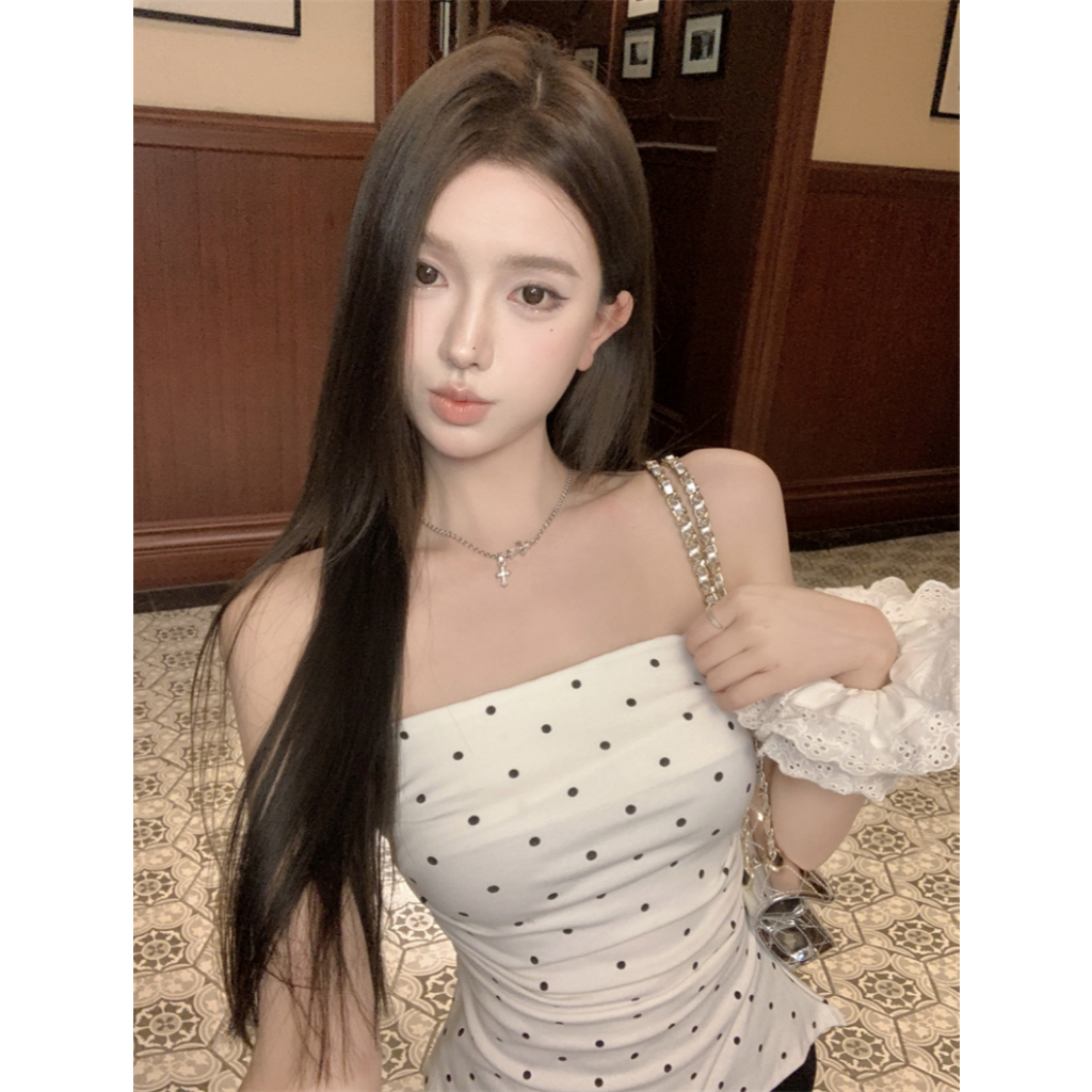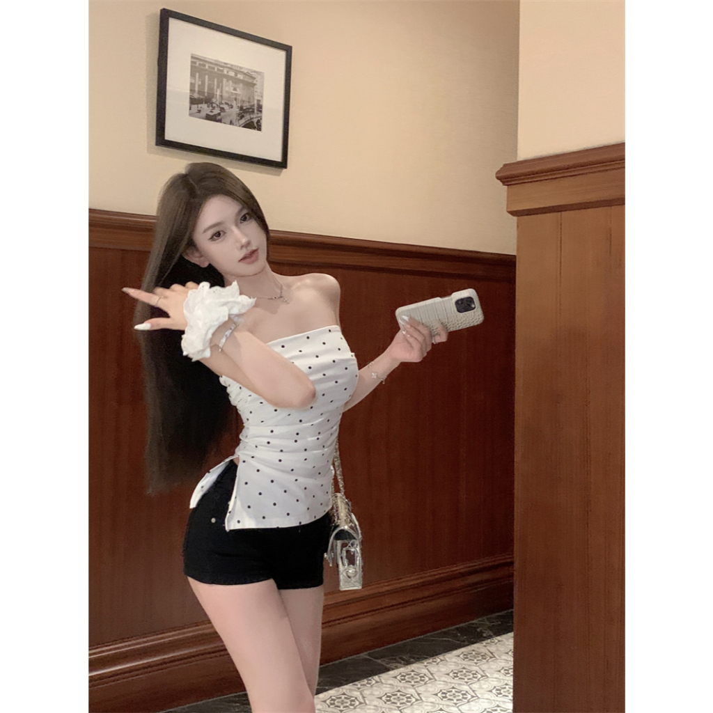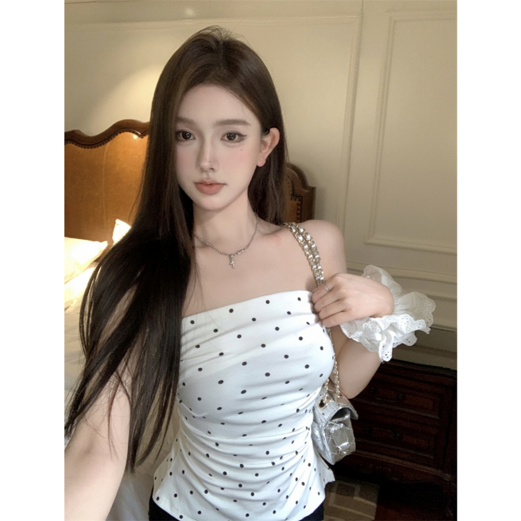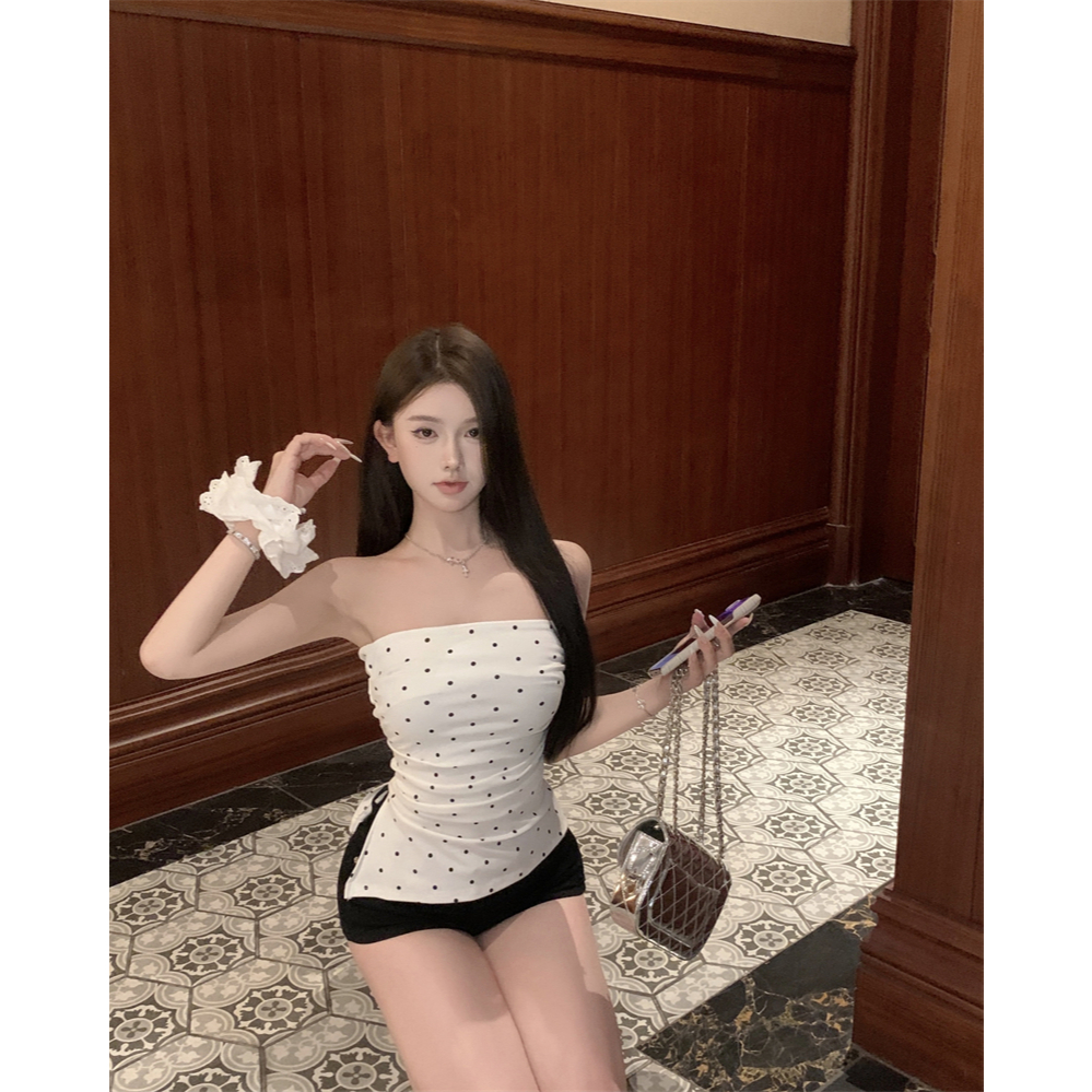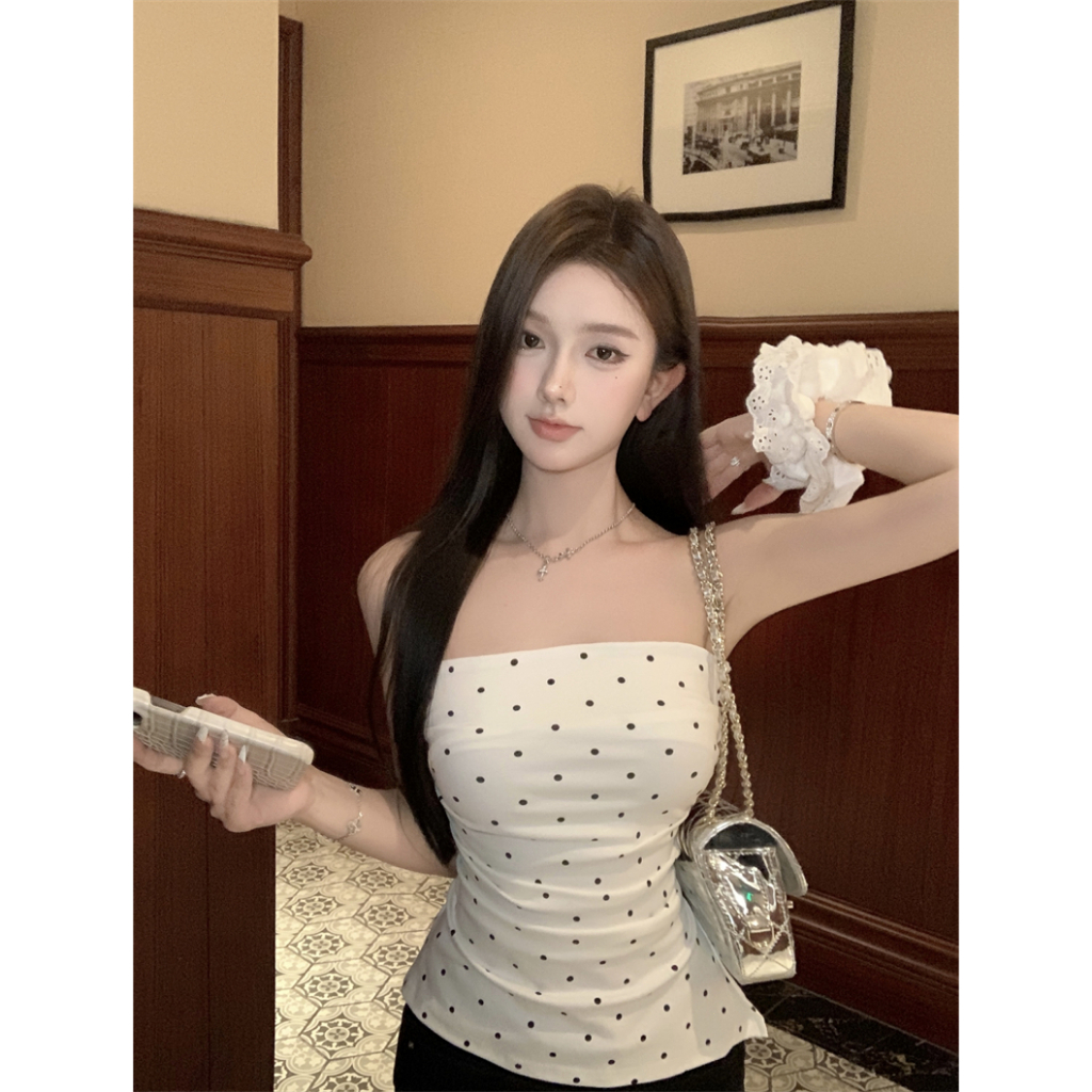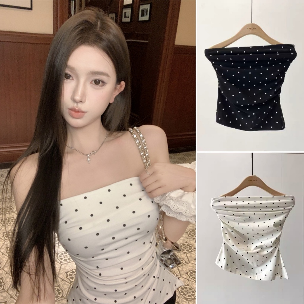 Bella shop เสื้อกล้ามผู้หญิง เสื้อครอป สไตล์เกาหลี แขนกุด ปาดไหล่ ลายจุดตัดกัน เซ็กซี่ เข้ารูป ปาดไหล่
