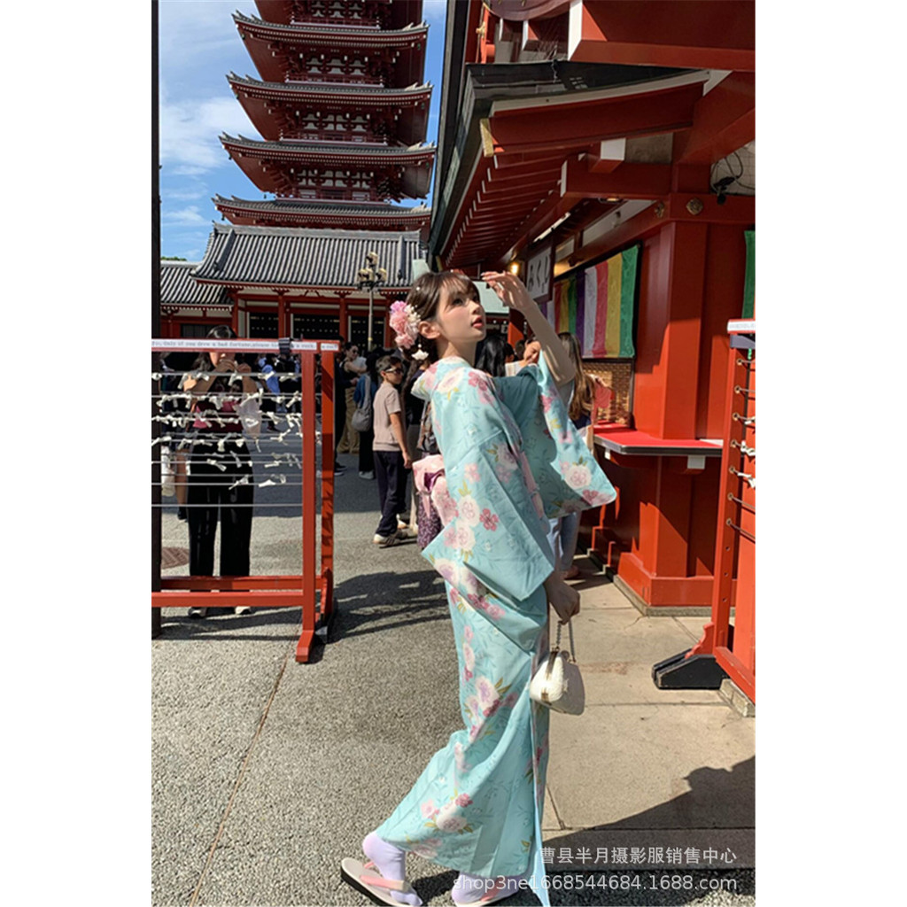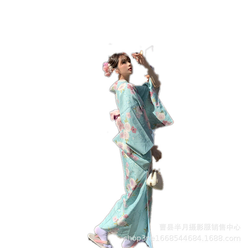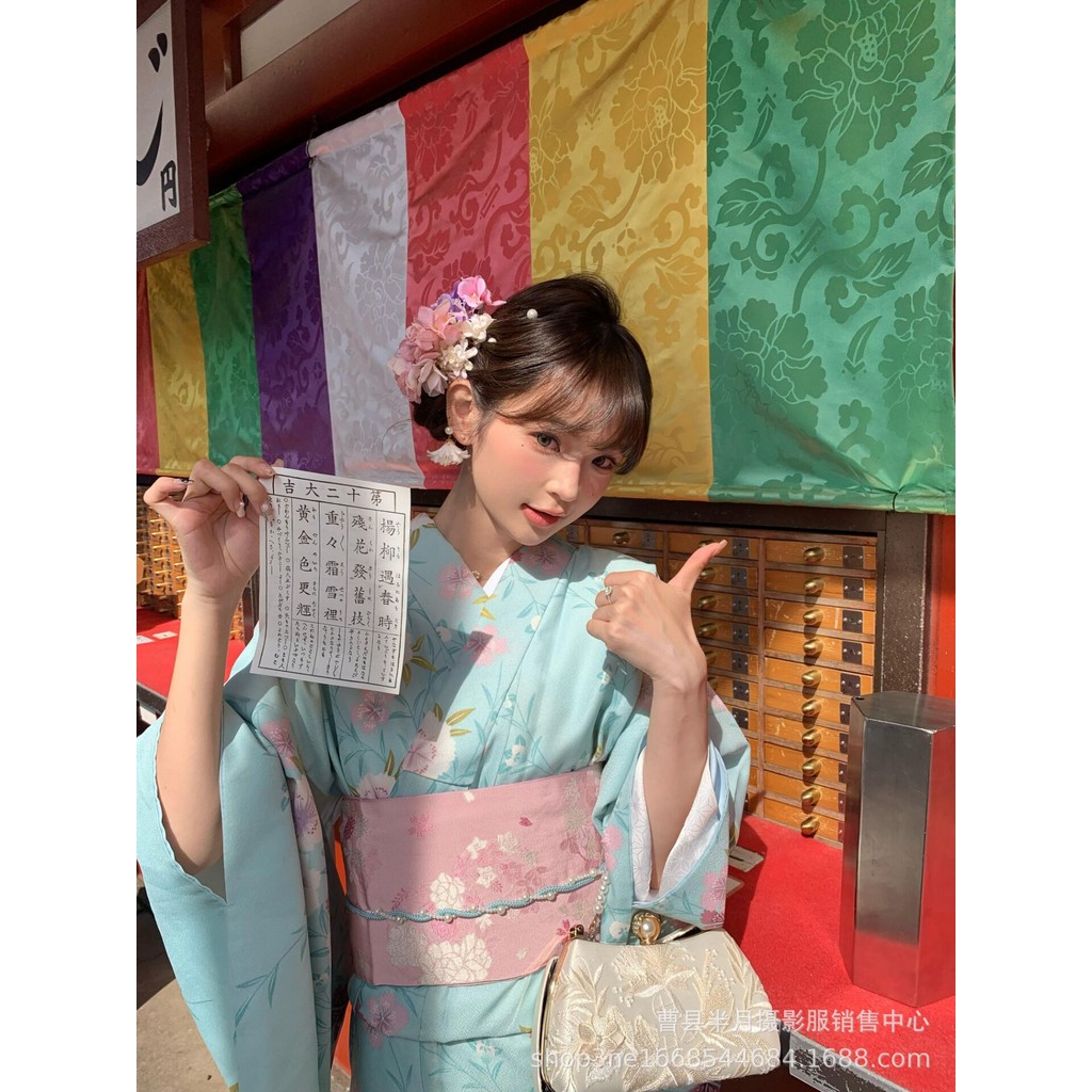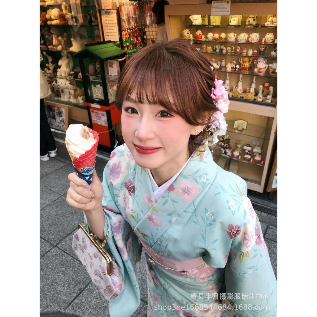 ชุดกิโมโน สไตล์ญี่ปุ่น กิโมโนย้อนยุคญี่ปุ่น สำหรับการถ่ายภาพ และยูกาตะสำหรับหญิง ชุดกิโมโน + คาดเอวธรรมดา + พัดลม + หมวกกันน็อค