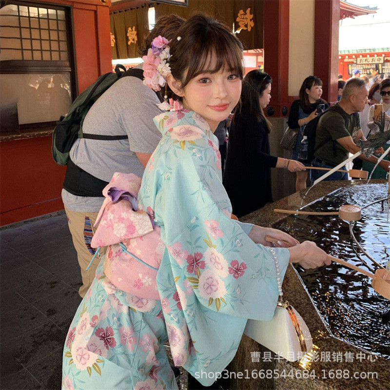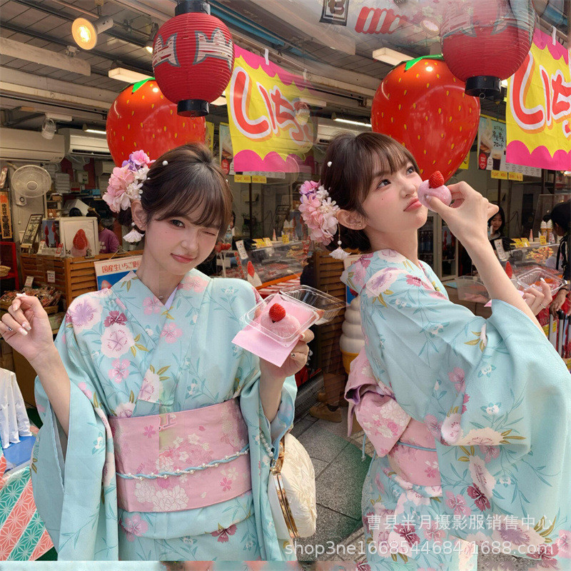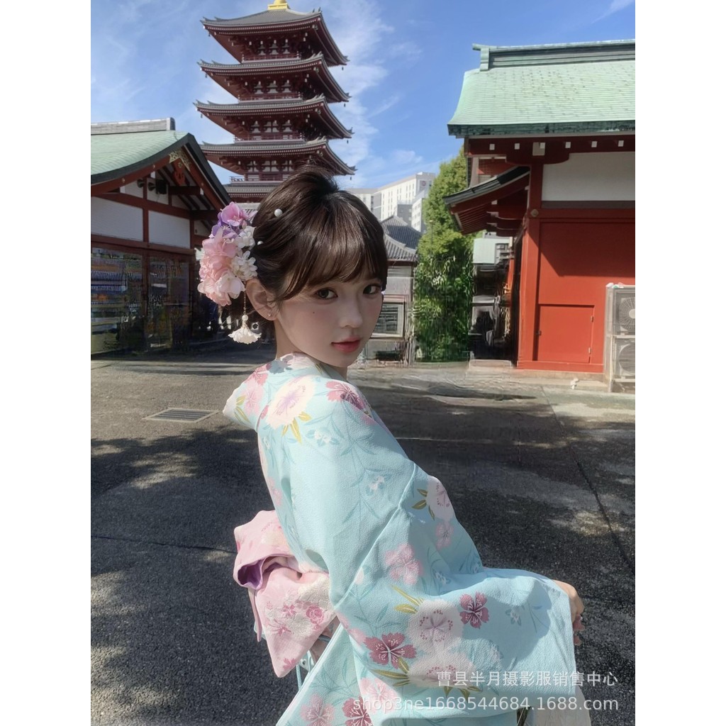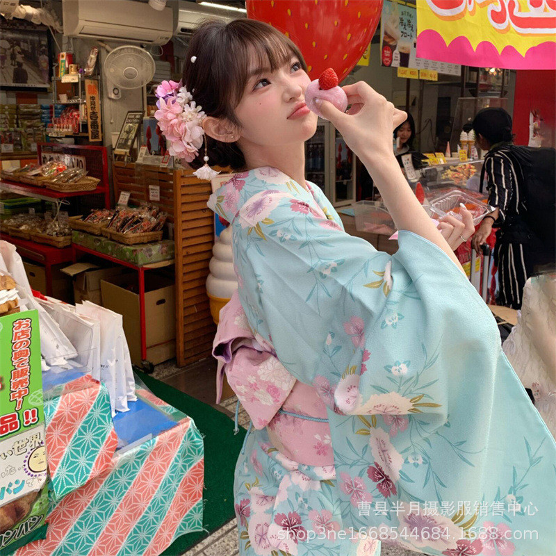 ชุดกิโมโน สไตล์ญี่ปุ่น กิโมโนย้อนยุคญี่ปุ่น สำหรับการถ่ายภาพ และยูกาตะสำหรับหญิง ชุดกิโมโน + คาดเอวธรรมดา + พัดลม + หมวกกันน็อค