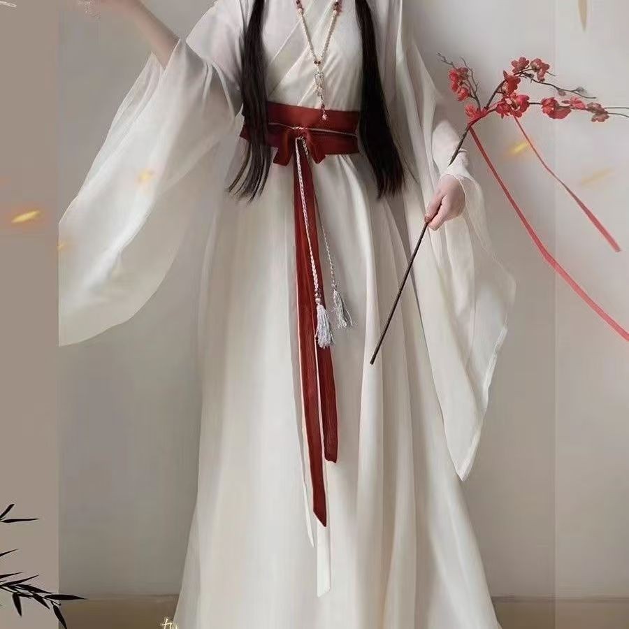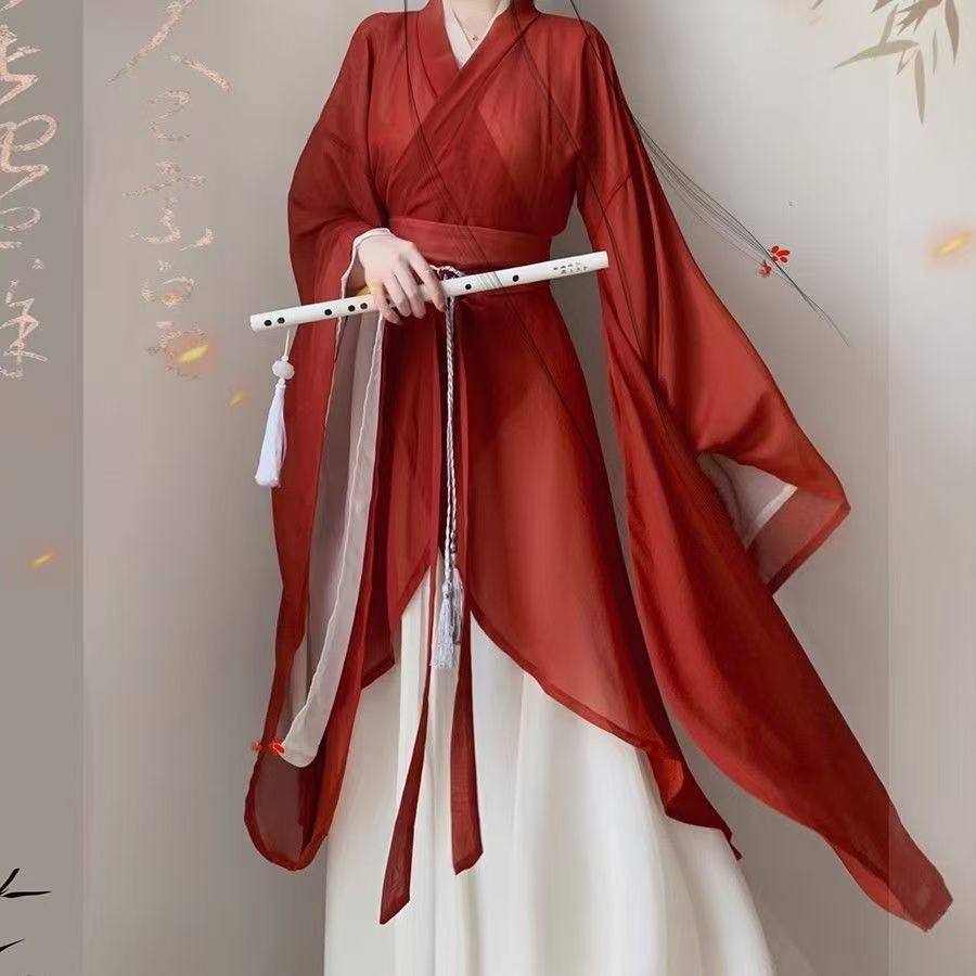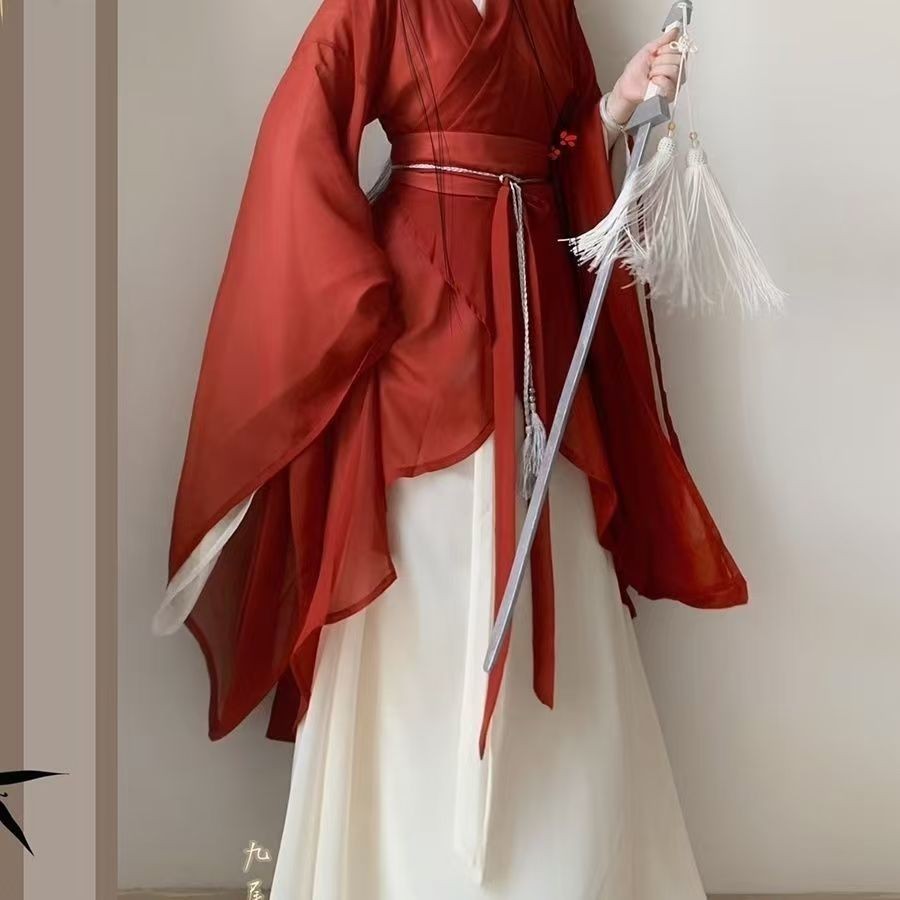 Hanfu [Nirvana] North South Dynasty Wei Jin สไตล์ Hanfu ผู้หญิงเสื้อแขนใหญ่ข้ามปกผ้ากันเปื้อนชุดสีแดง
