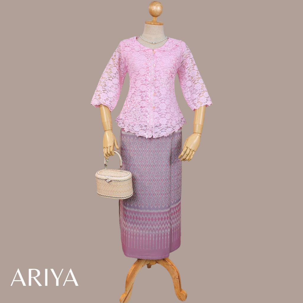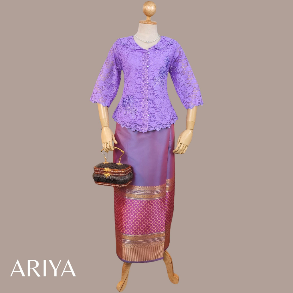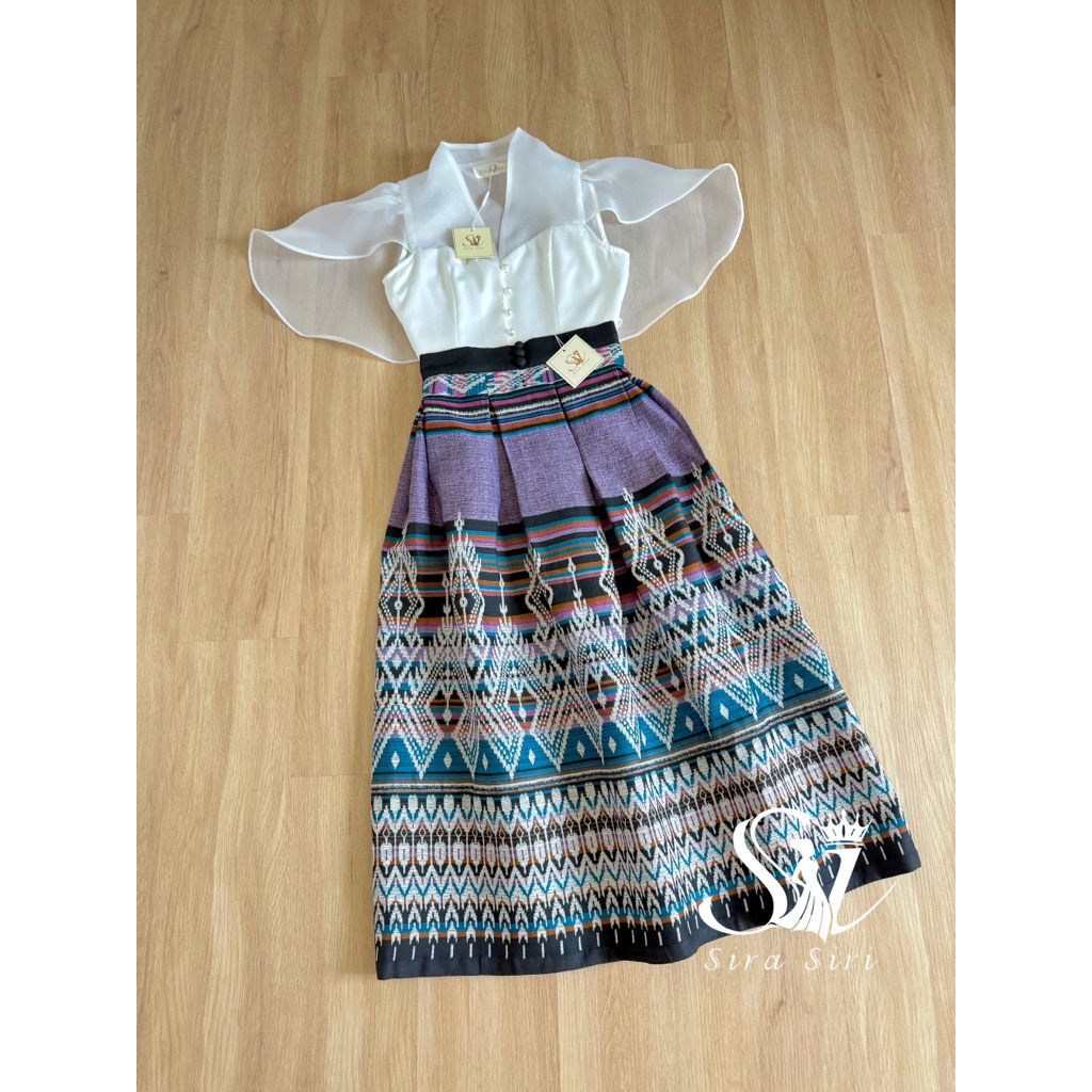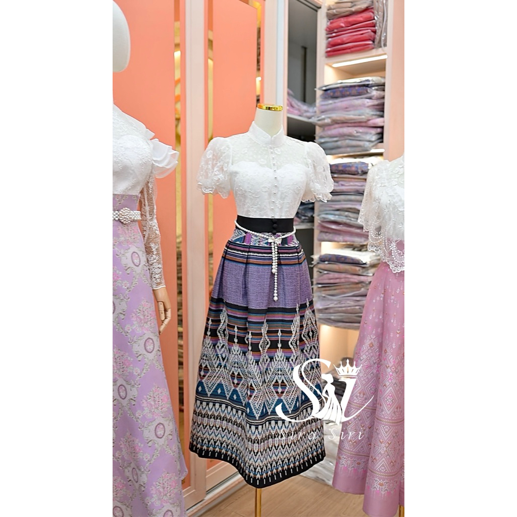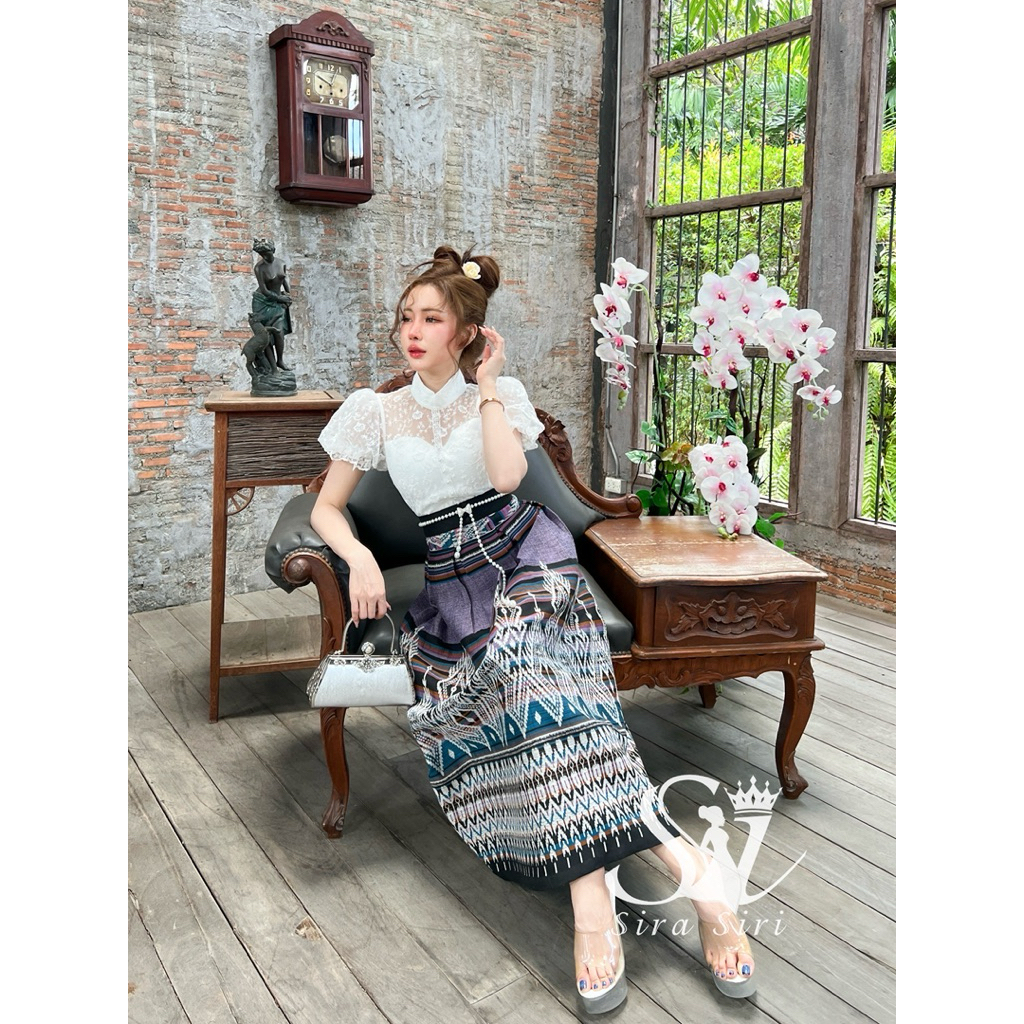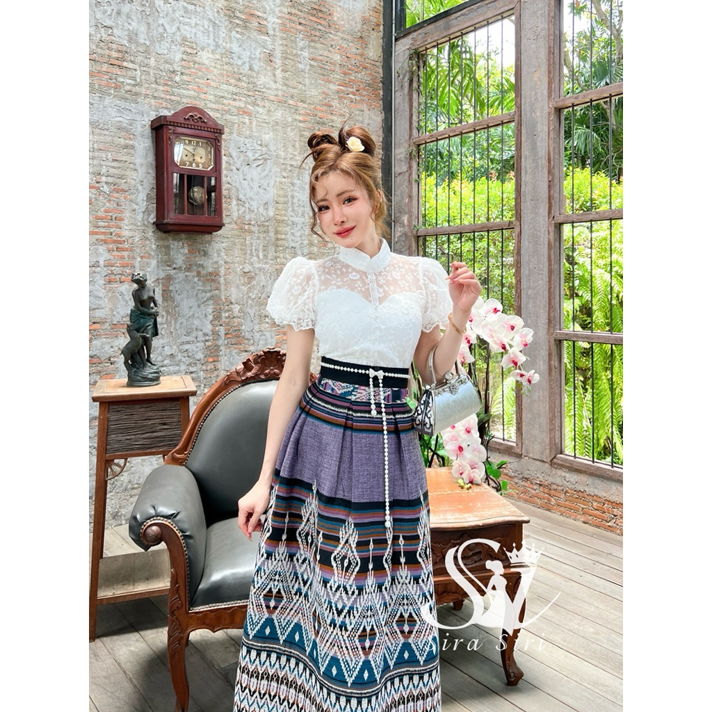 Sira Siri ชุดไทยเสื้อลูกไม้ แขนตุ๊กตาน่ารัก ใส่กับกระโปรงทอลายต้นสนสีม่วง สวยลงตัวมากๆจ้า