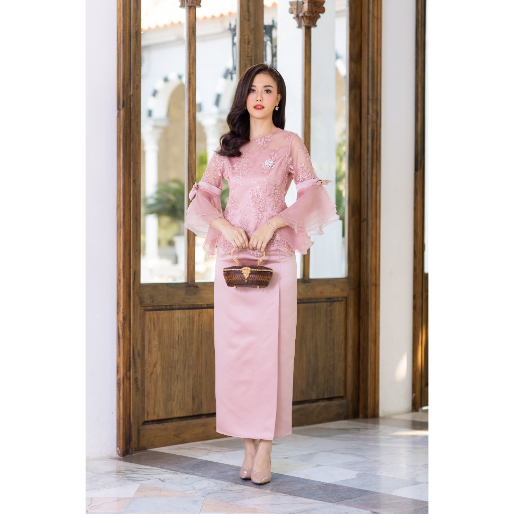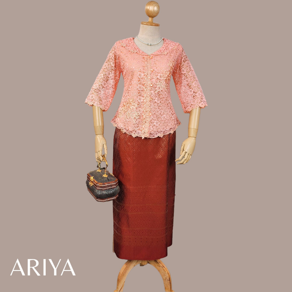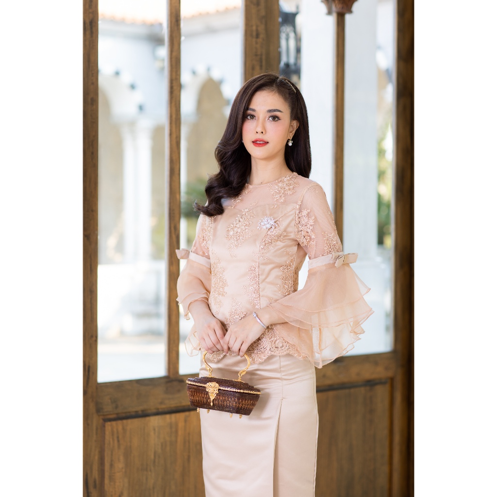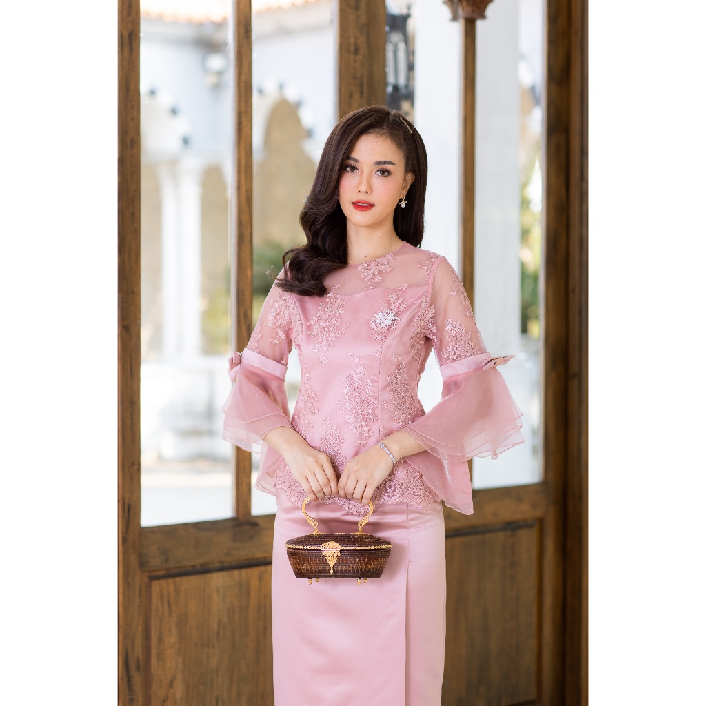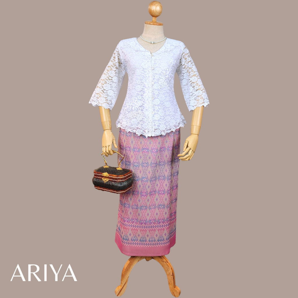 Sira Siri ชุดไทยเสื้อลูกไม้ แขนตุ๊กตาน่ารัก ใส่กับกระโปรงทอลายต้นสนสีม่วง สวยลงตัวมากๆจ้า