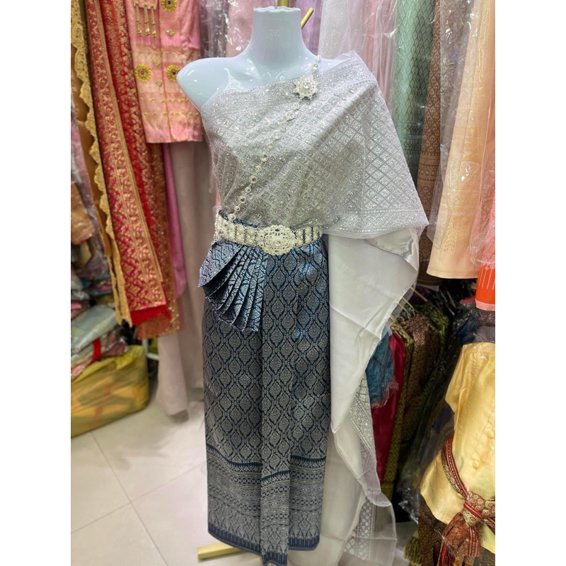 ชุดไทยเจ้าสาว สไบเลื่อม 2 ชั้น กระโปรงไหมทอสีกรมน้ำเงิน เงางาม ตรงปก♥️