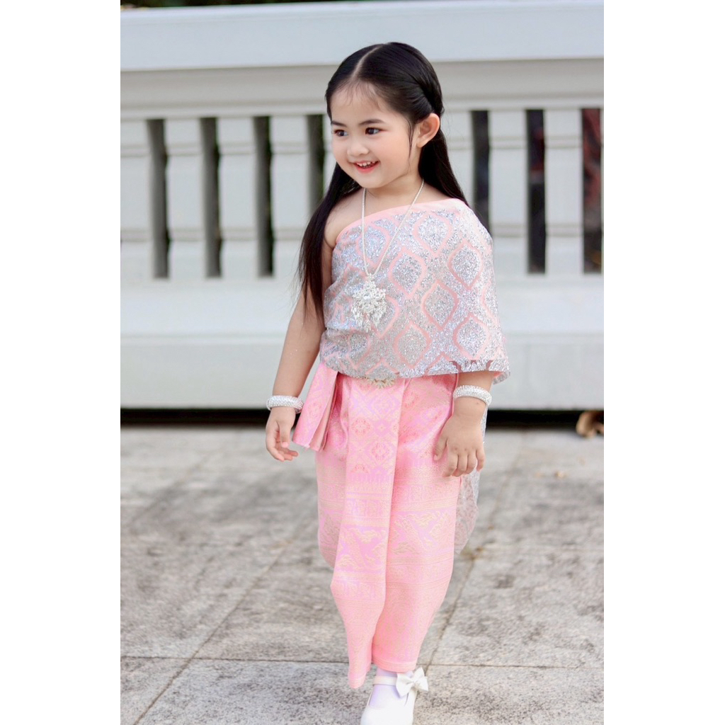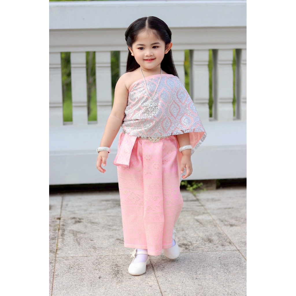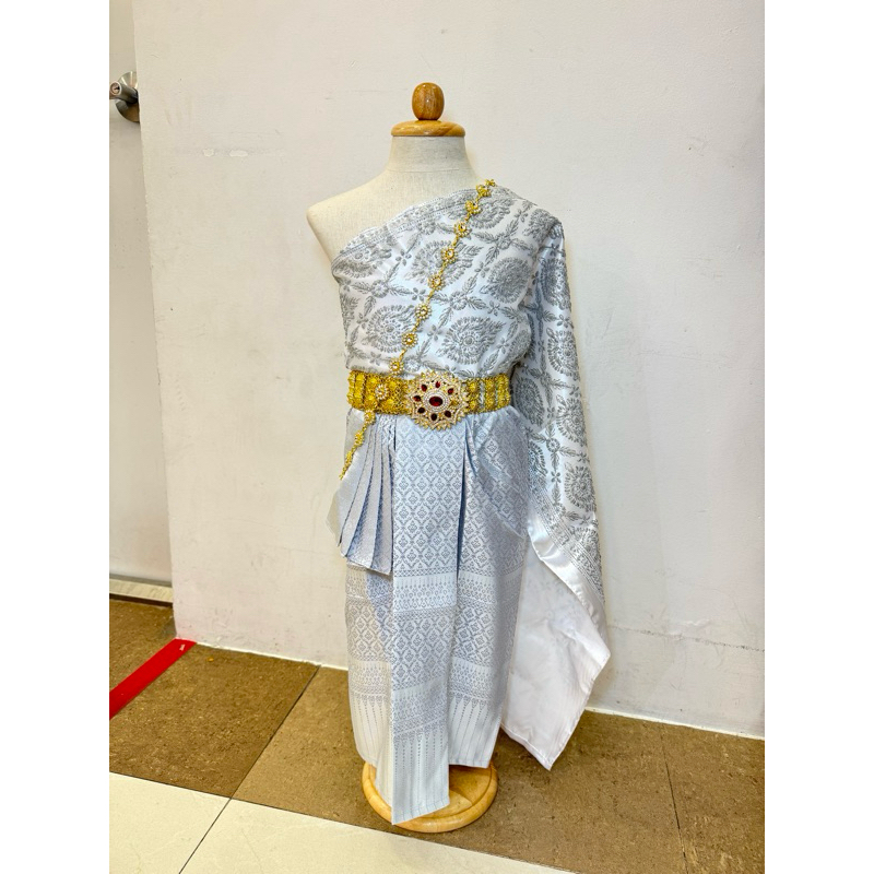 ชุดไทยเด็กผู้หญิงสีเทาขาว สไบเลื่อมเกาะอก 2 ชั้น กระโปรงไหมทอ สวยงาม ถ่ายจากสินค้าจริงทุกชุด🌷