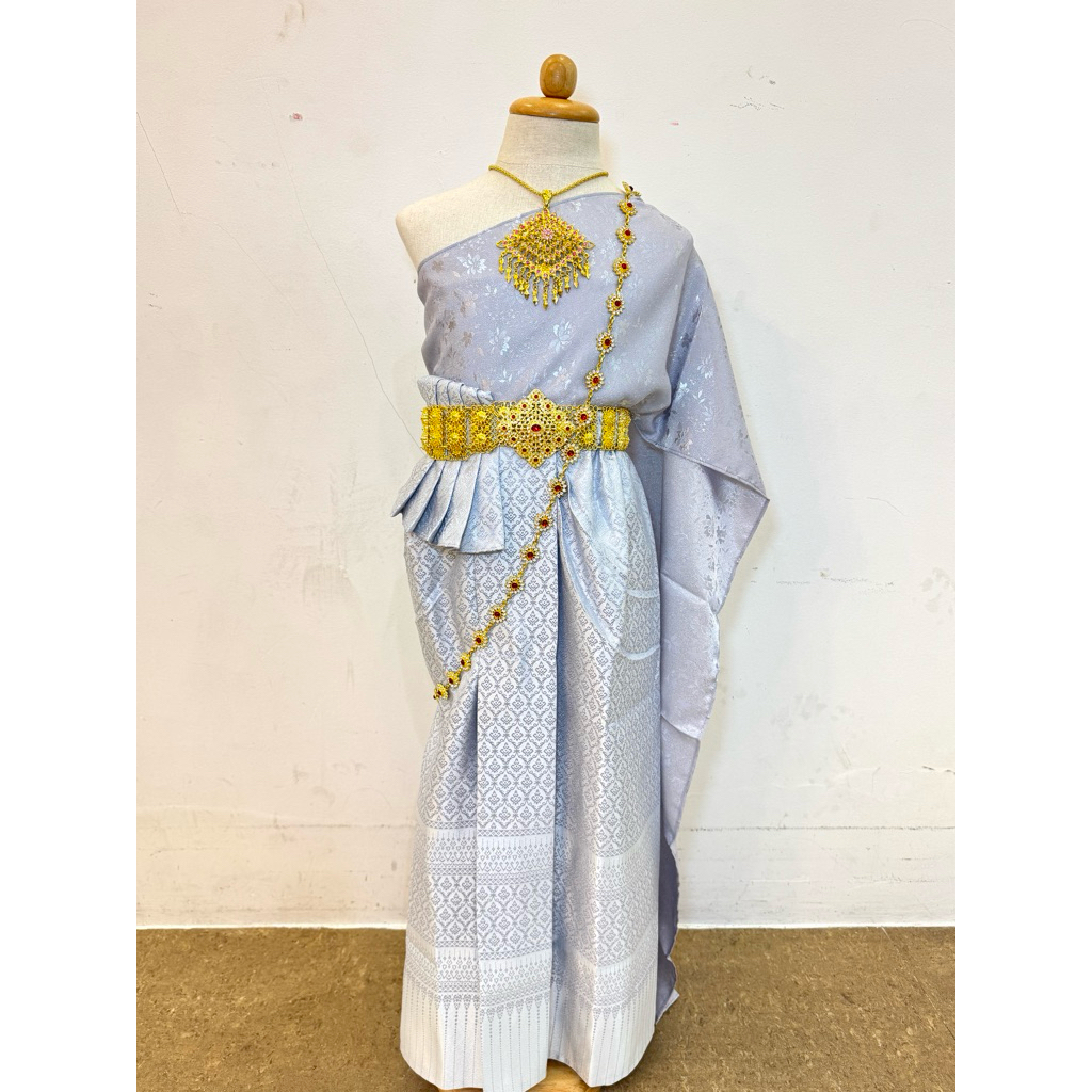 ชุดไทยเด็กสีเทา สไบออเจ้าเกาะอกสีเทาเงางาม แมตท์กระโปรงไหมทอ สวยหรู