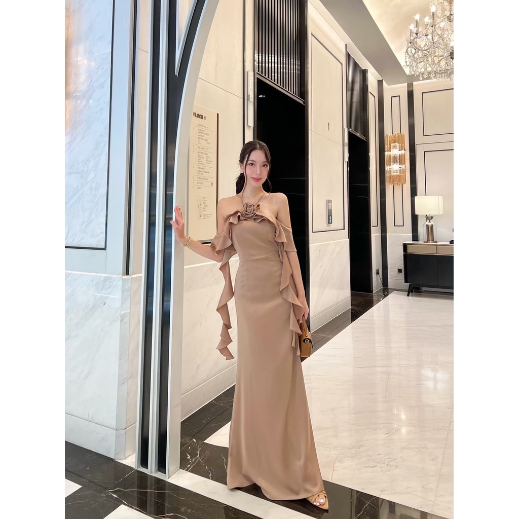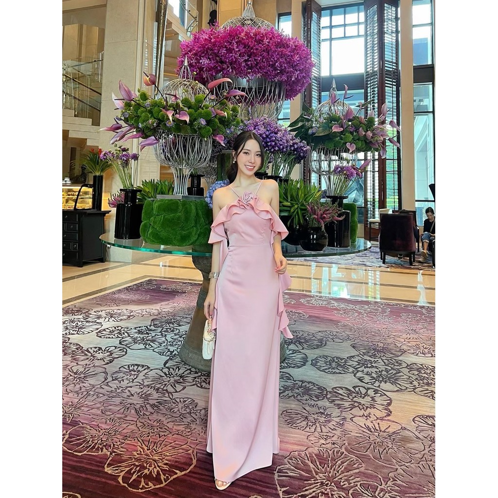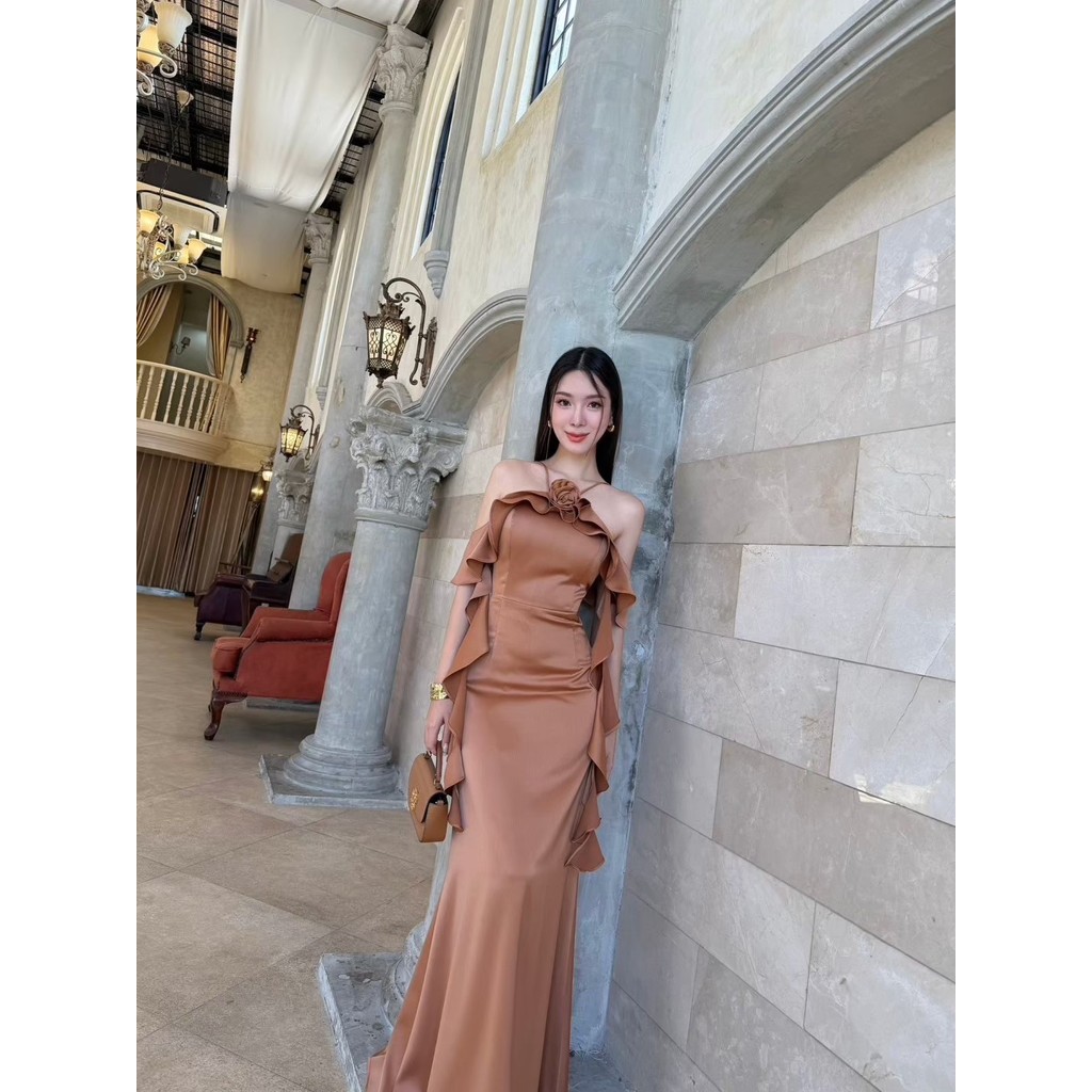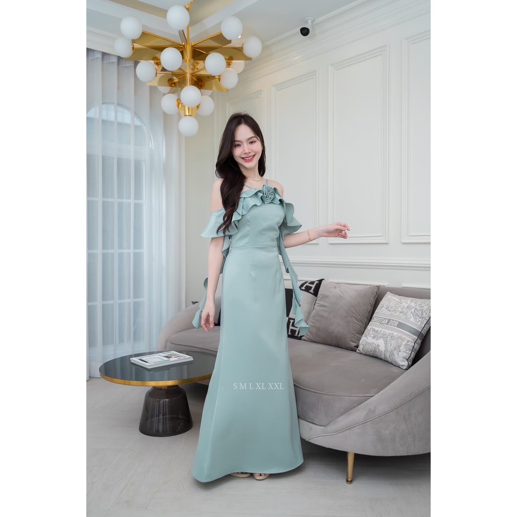 เดรสยาว ชุดราตรียาว เดรสออกงาน FIORA ผ้าเครป ซาติน สายเดี่ยว มีดอกไม้ สายเกลียว ผู้หญิง Woman Dress