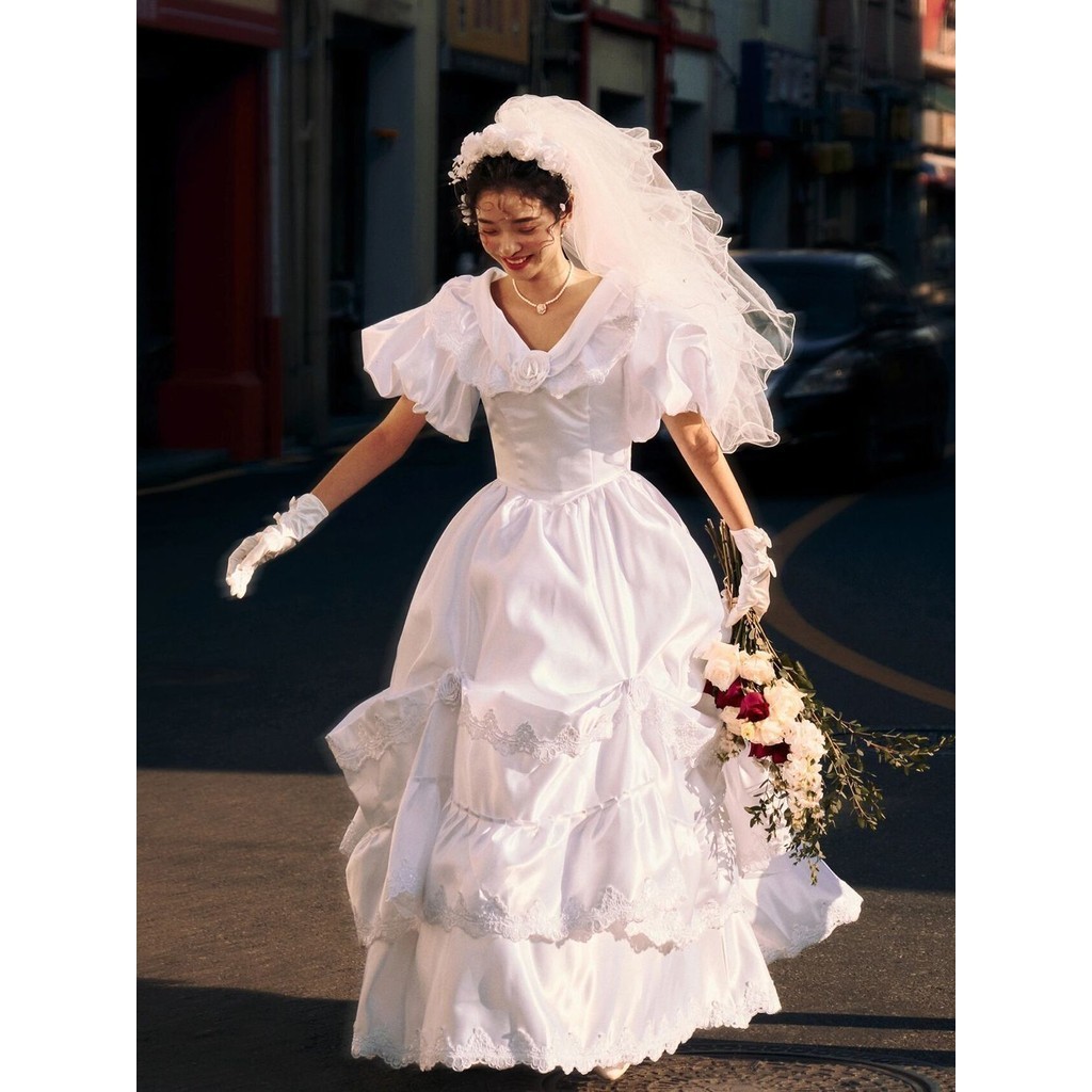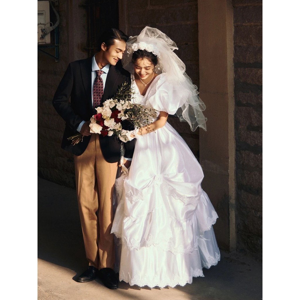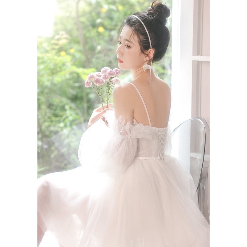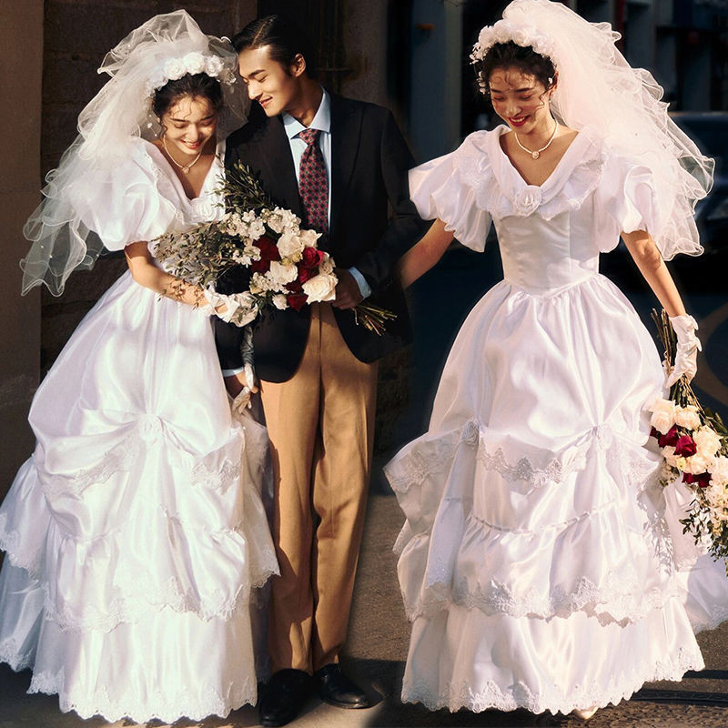 ชุดเดรสแต่งงาน สีขาว สไตล์ฝรั่งเศสเรโทร สําหรับถ่ายภาพ งานพรอม งานพรอม
