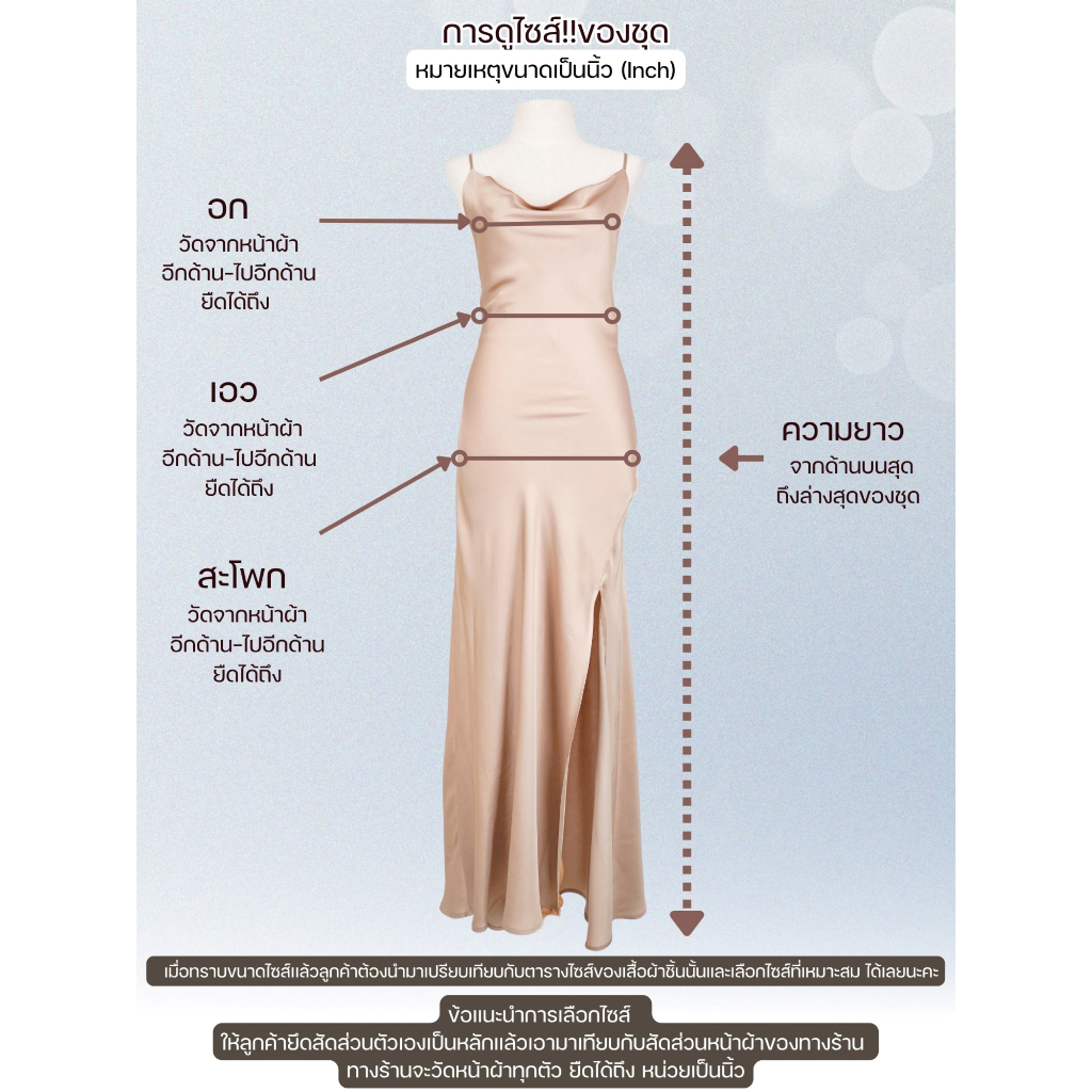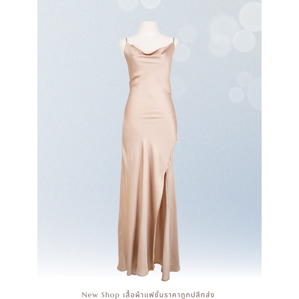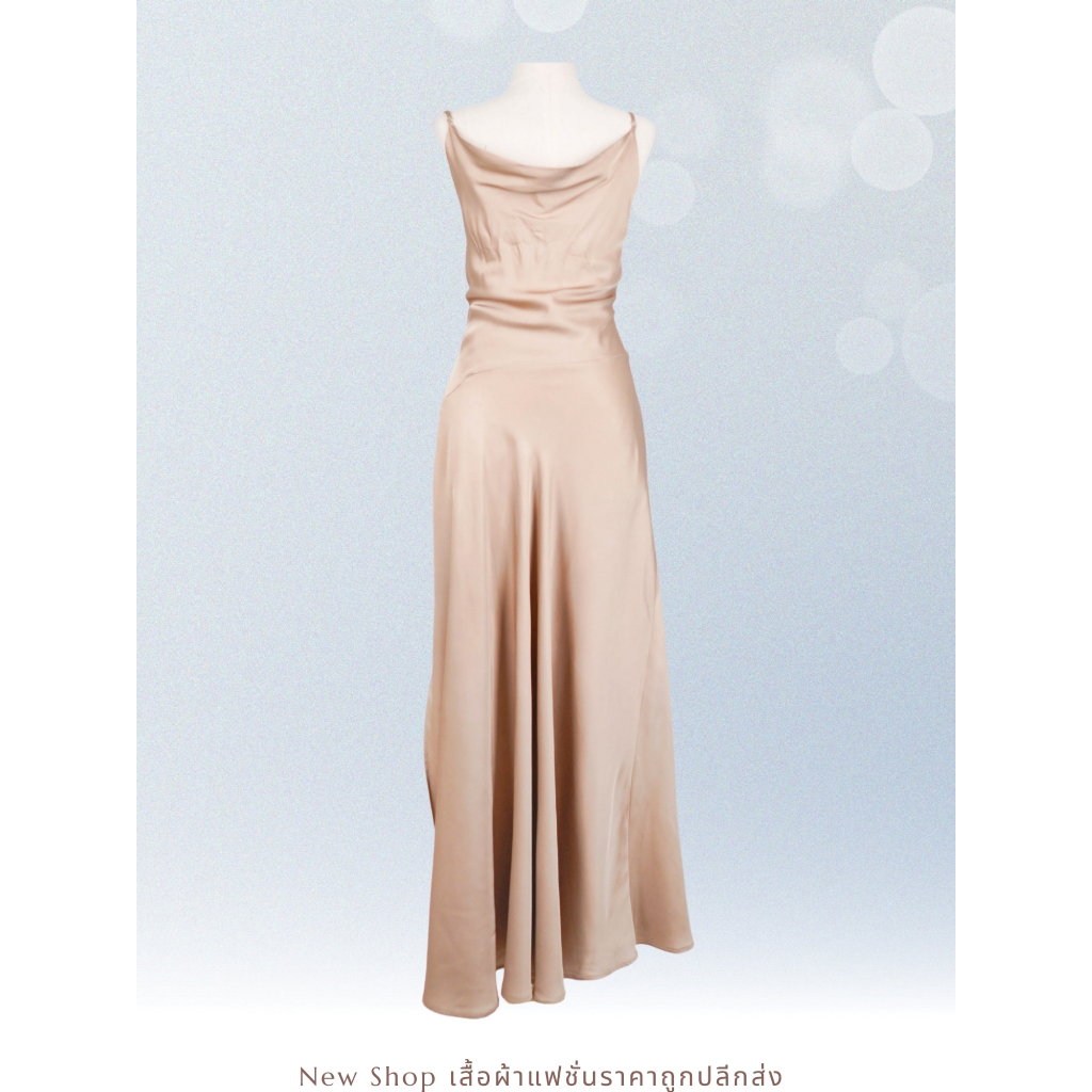 ชุดราตรี สีกากี สายเดี่ยว ผ้าซาติน ความยาวชุด 57