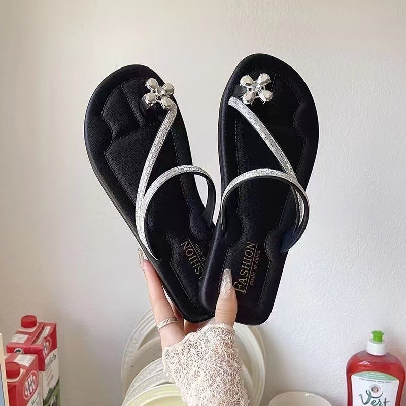 รองเท้าแตะ ส้นแบน ประดับคริสตัล สีดํา สีทอง สไตล์โบฮีเมียน แฟชั่นสําหรับผู้หญิง