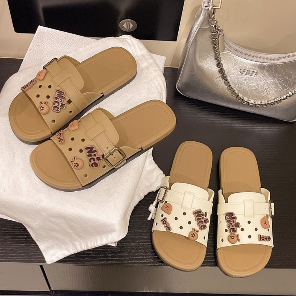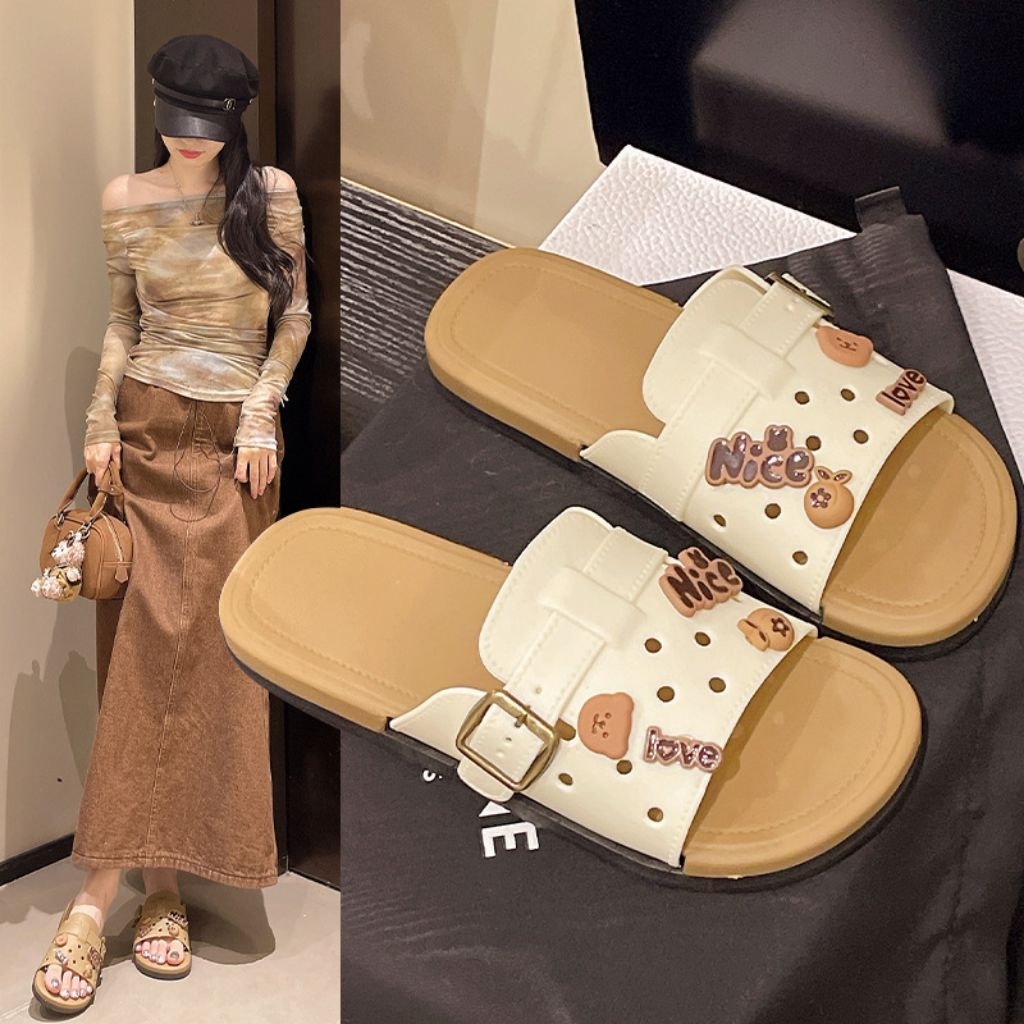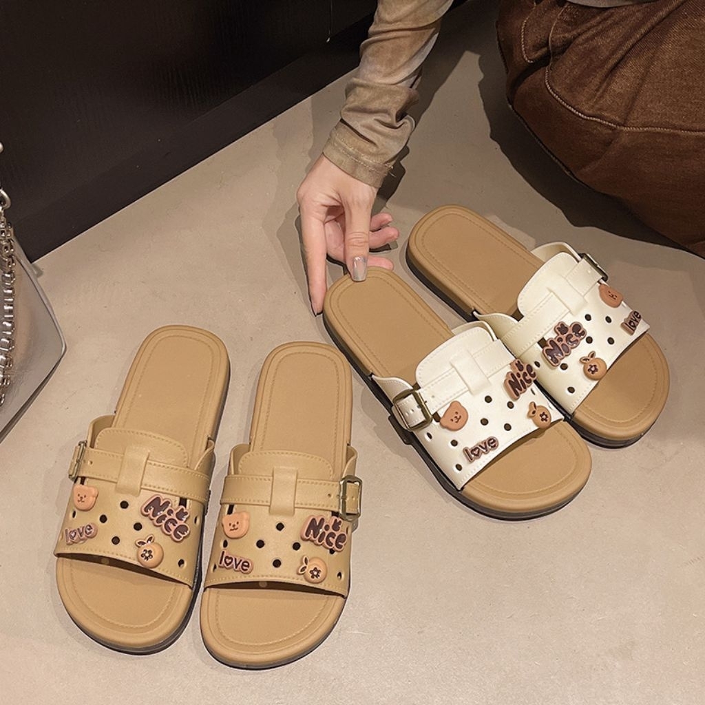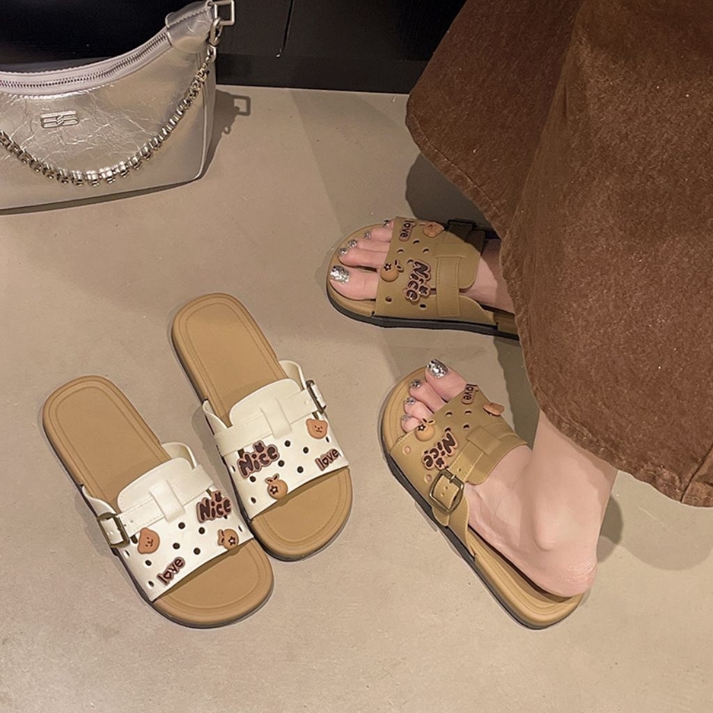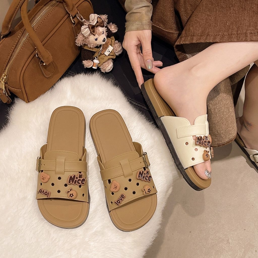 รองเท้าแตะสติกเกอร์รูปหมีน่ารักมาพร้อมเสน่ห์ 2 สี สีน้ําตาลครีม ผลิตจากพลาสติกกันน้ํา