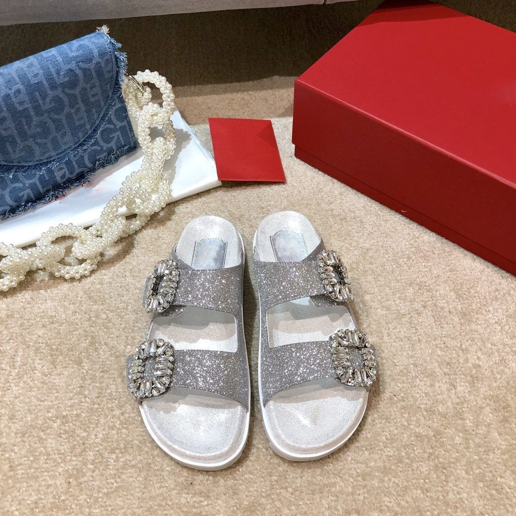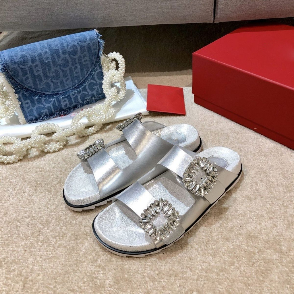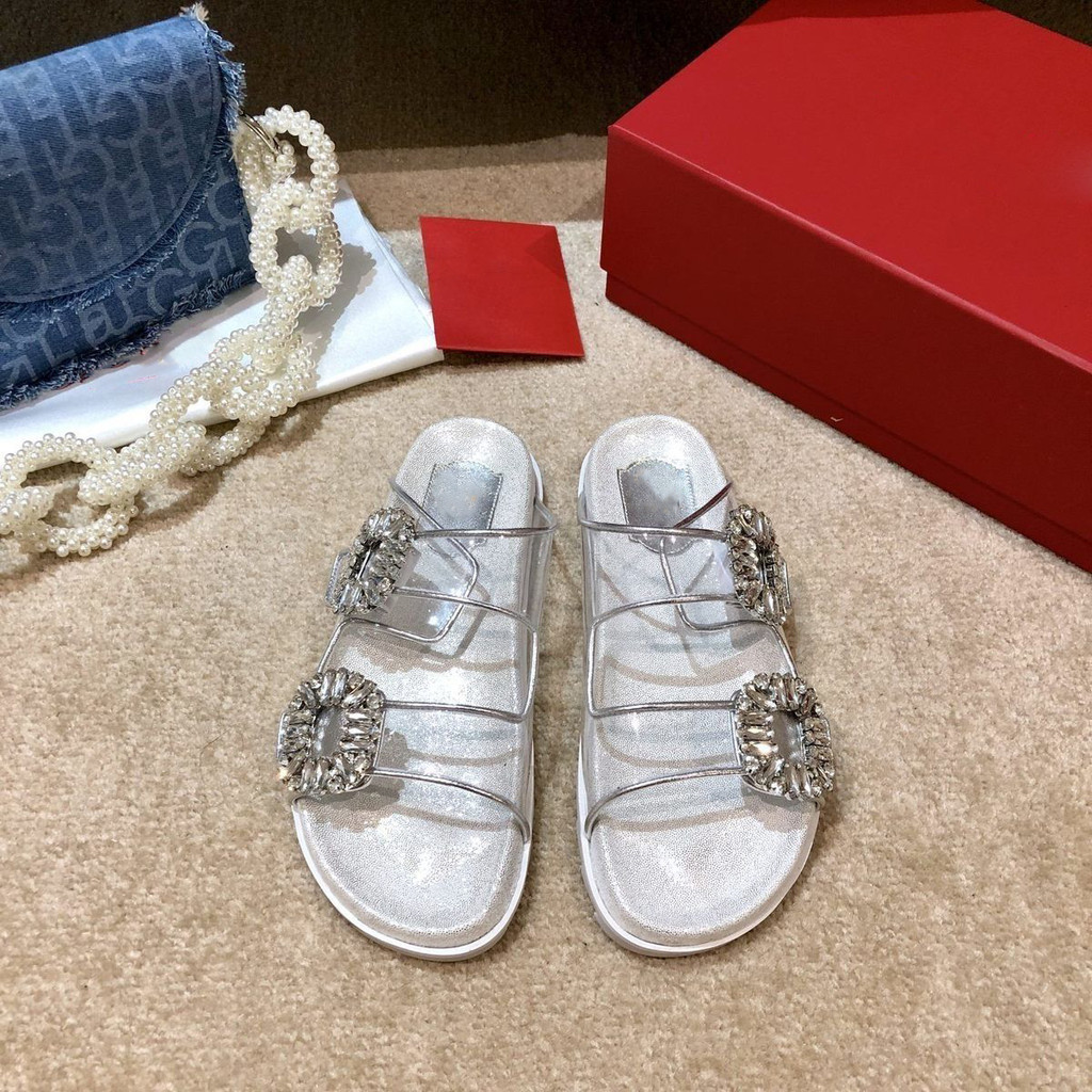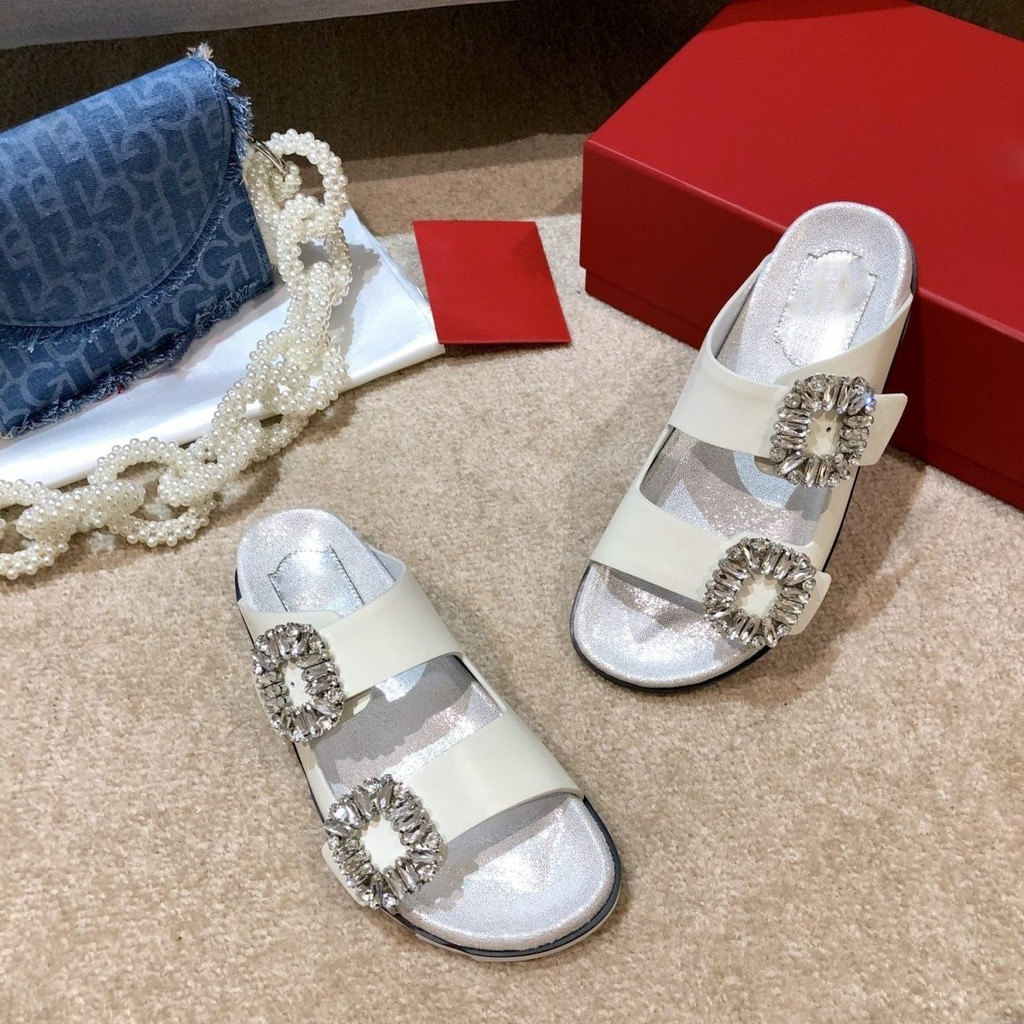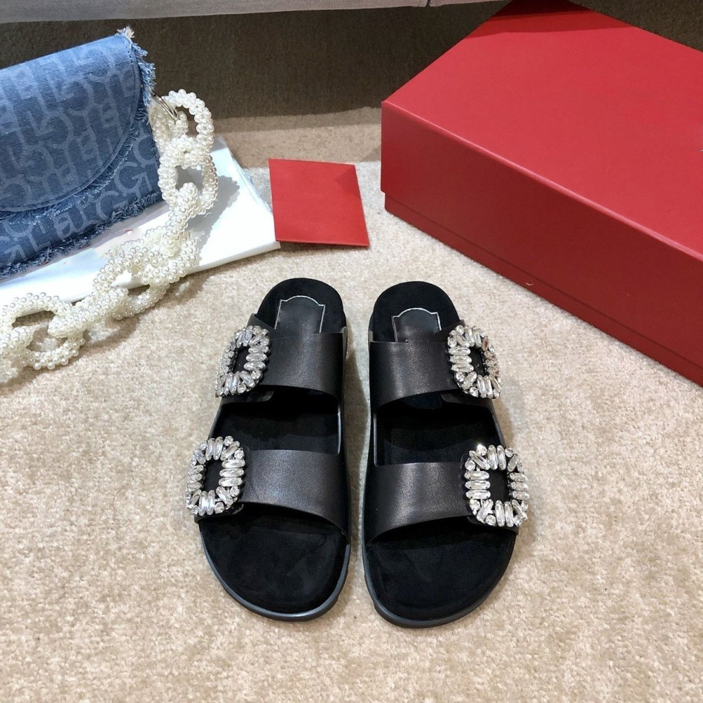 รองเท้าแตะฤดูร้อนแบบเปิดนิ้วเท้า หัวเข็มขัดสี่เหลี่ยมประดับคริสตัล แฟชั่นแบนไม่ลื่นสำหรับผู้หญิง