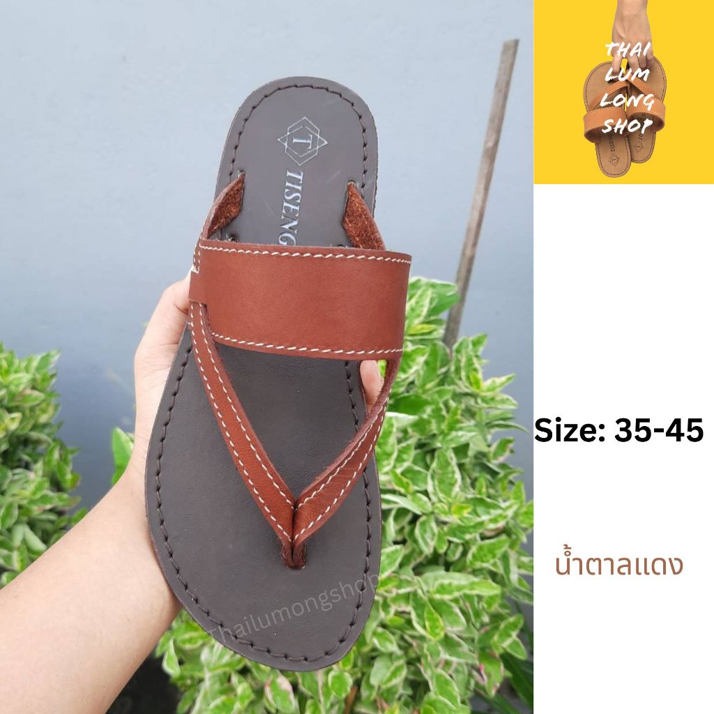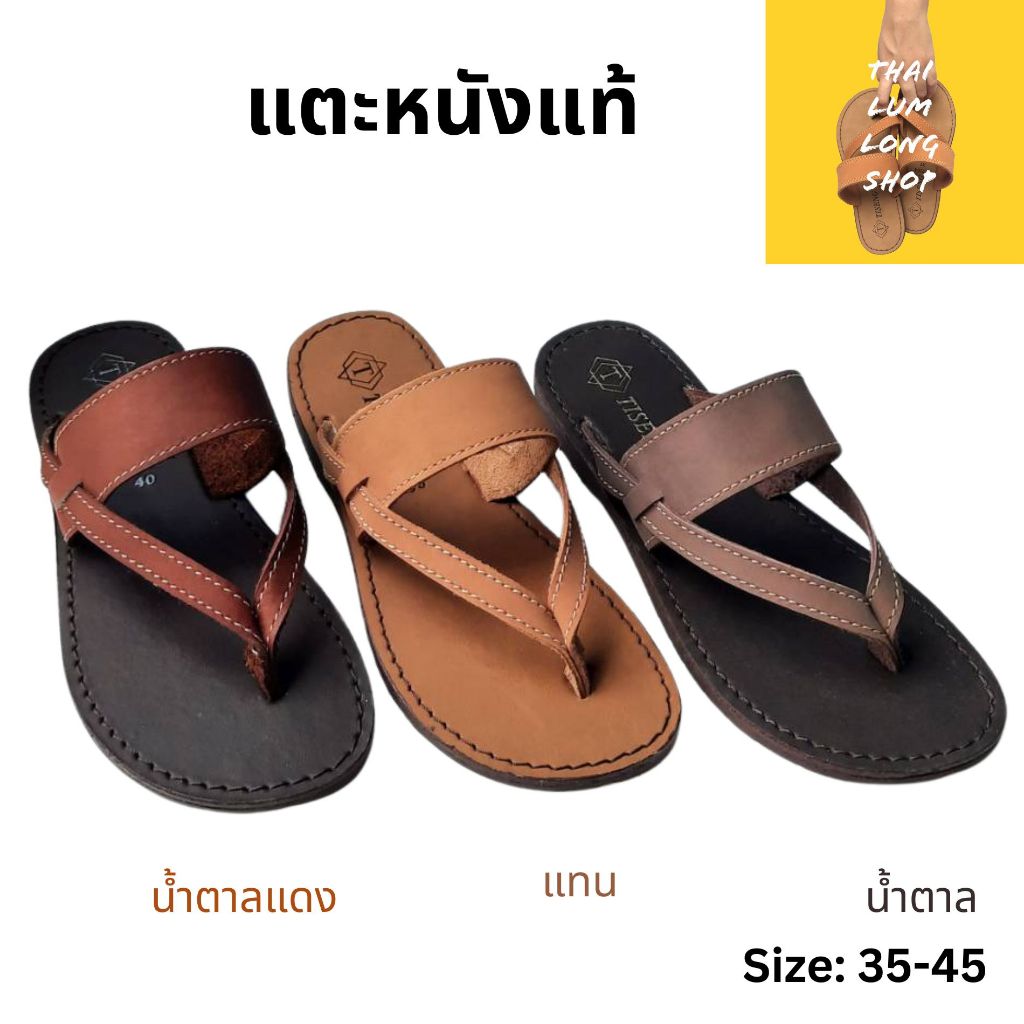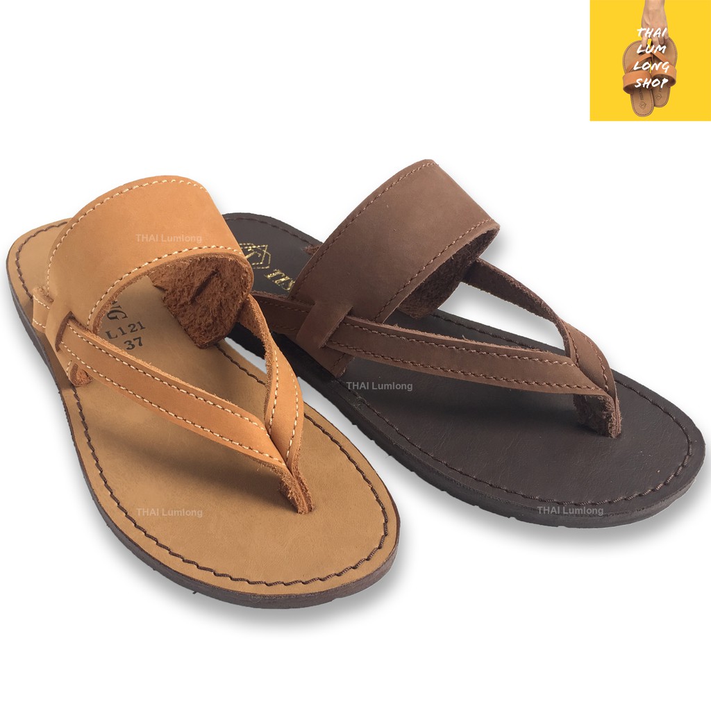 Thailumlong รองเท้าแตะหนังแท้เย็บมือรุ่น E (121) ลำลอง ดูเท่ ทนทาน ใส่สบาย มี 3 สี สีแทน สีน้ำตาล สีน้ำตาลแดง