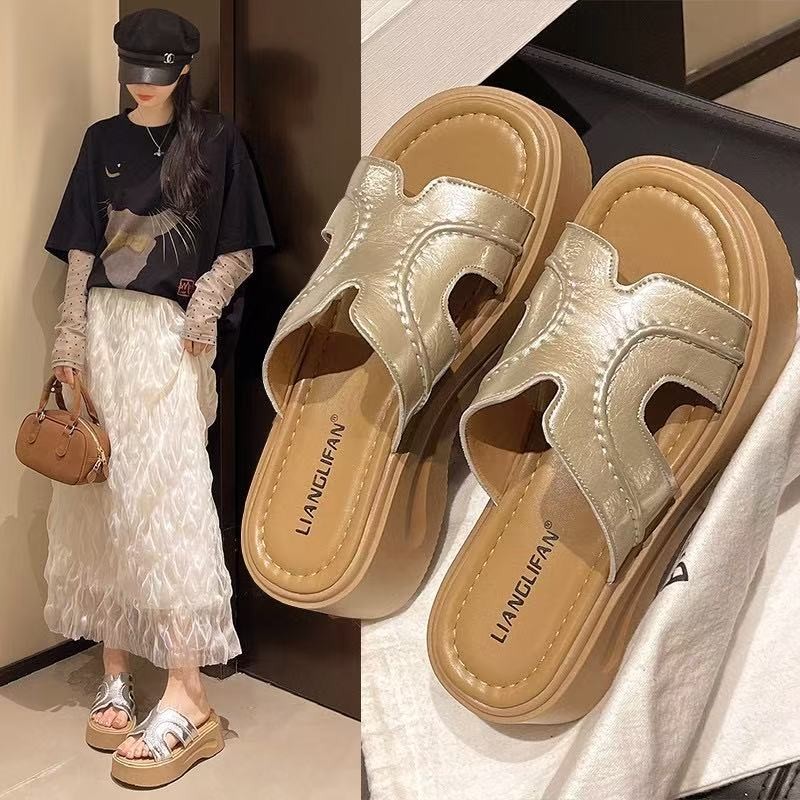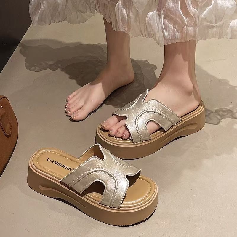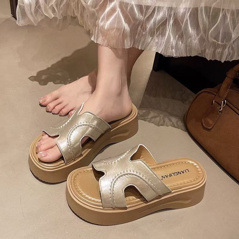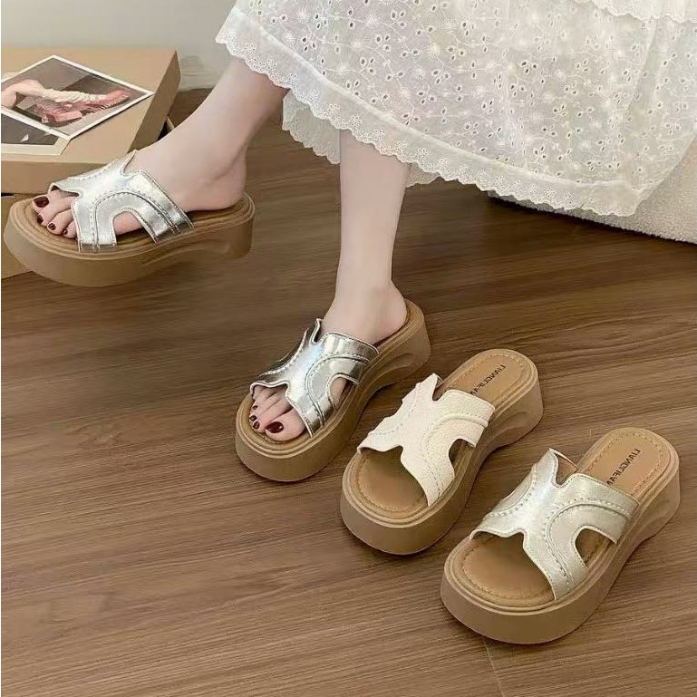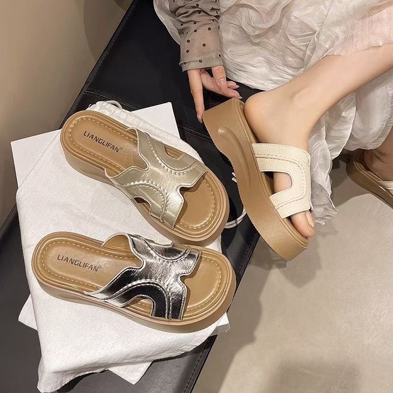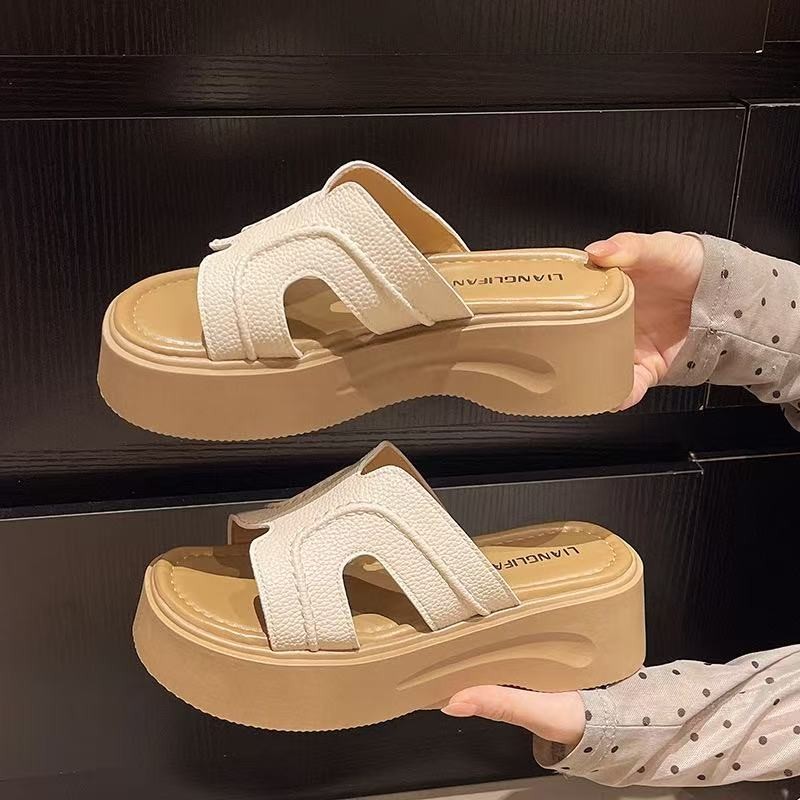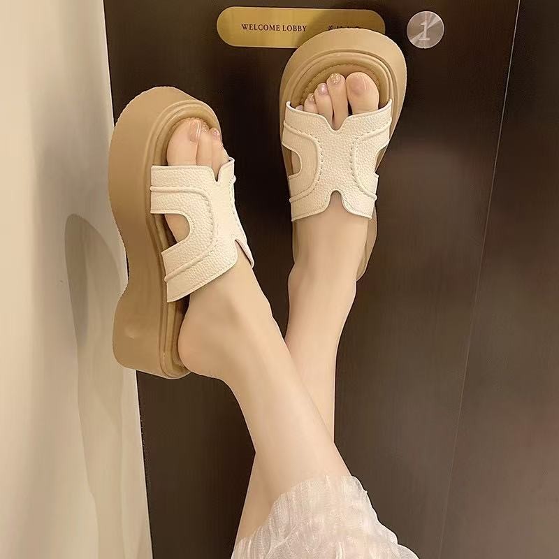 TX708 รองเท้าเเตะผู้หญิง สไตล์เกาหลี หนา2นิ้ว แฟชั่นคาดหน้าเท้า พื้นนิ่ม กันลื่น ใส่สบาย สำหรับผู้หญิง(สีครีมเป็นหนังPU)