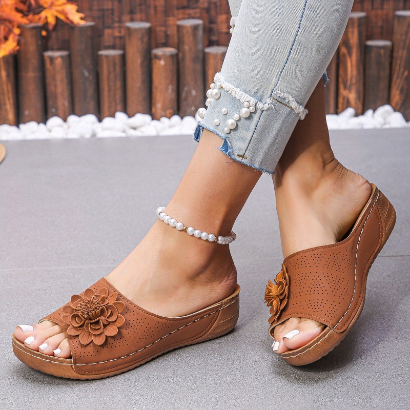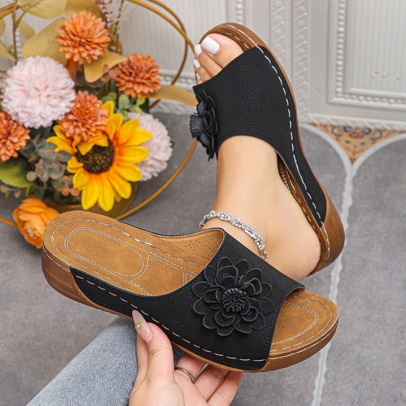 Atikota ผู้หญิง Wedges รองเท้าแตะสุภาพสตรีลื่น Breathable อเนกประสงค์ดอกไม้ตกแต่งรองเท้าแตะแบน