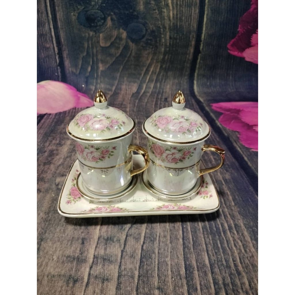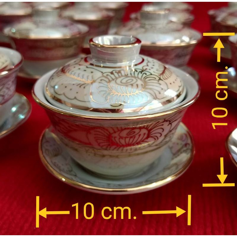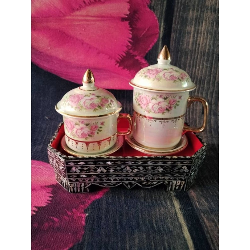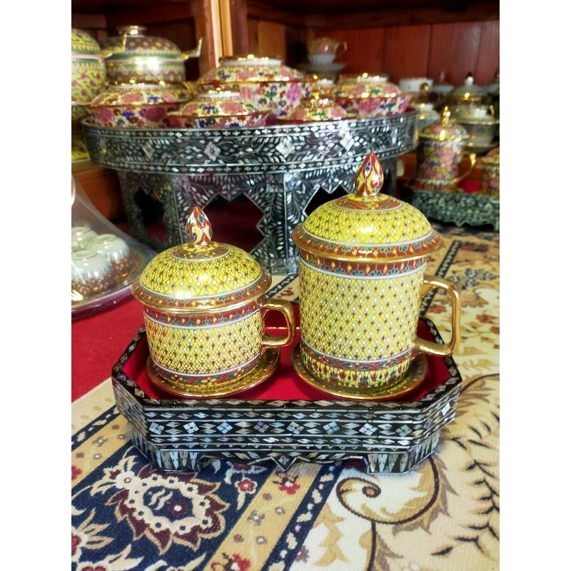 หยิบใส่ตะกร้าแก้วเบญจรงค์ ถ้วยชาพร้อมกี๋มุก ใส่ได้ทั้งร้อนเย็น ชุดกี๋มุก ถาดรองเซรามิคถวายพระ งานปราณีตราคาสุดคุ้ม